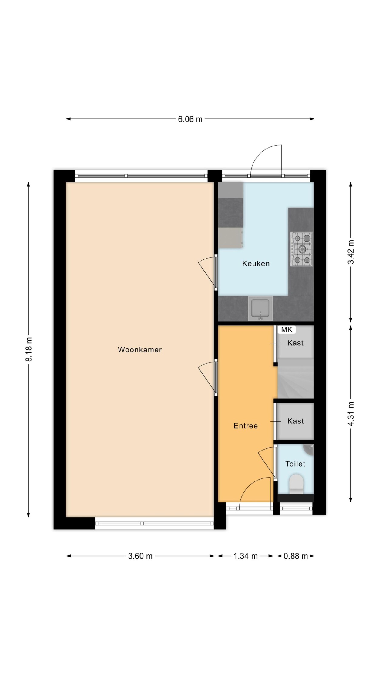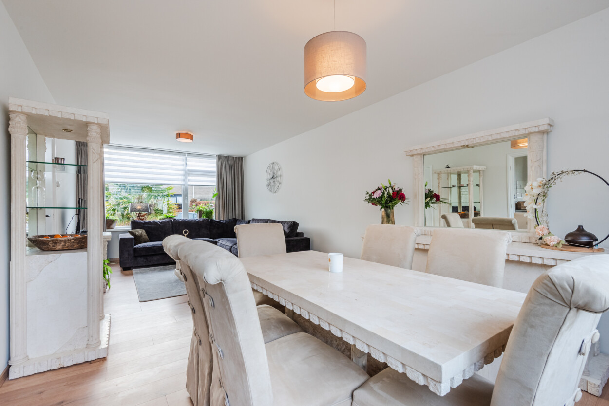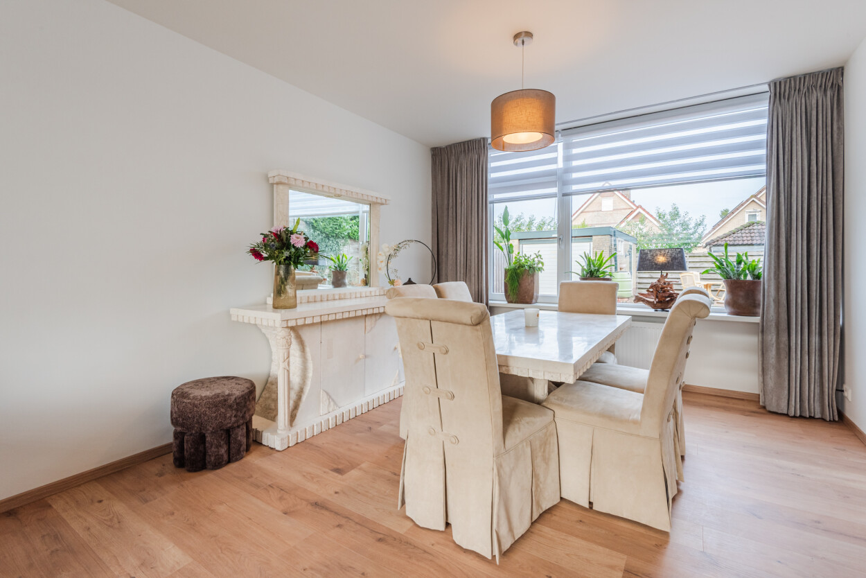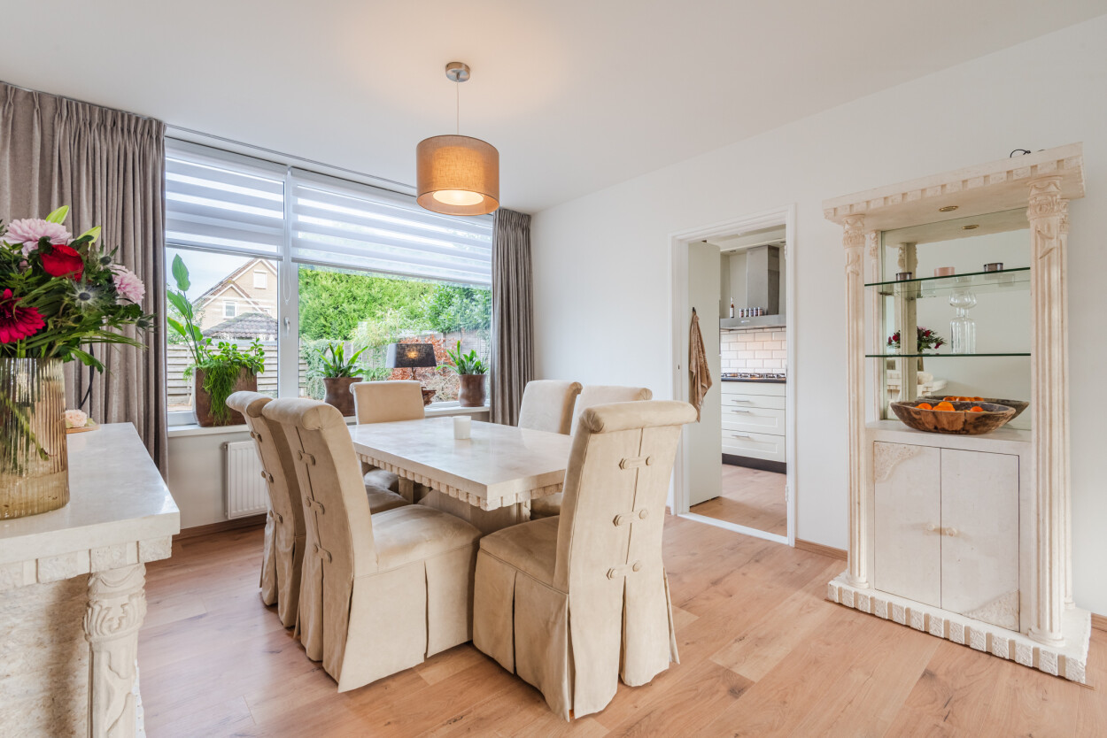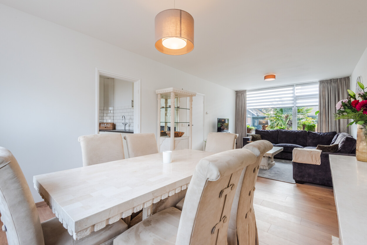 Bij binnenkomst in de entree/hal treft u de meterkast en de toegang tot de woonkamer. De woonkamer is ruim en echt een doorzon woonkamer met aan de voor- en achterzijde van de woning grote raampartijen die ervoor zorgen dat het hier altijd licht en sfeervol is. Via de woonkamer loopt u naar de achterzijde, waar de eetkamer is gesitueerd. Hier is voldoende ruimte voor een grote zespersoons tafel. De goed onderhouden keuken is voorzien van diverse inbouwapparatuur.