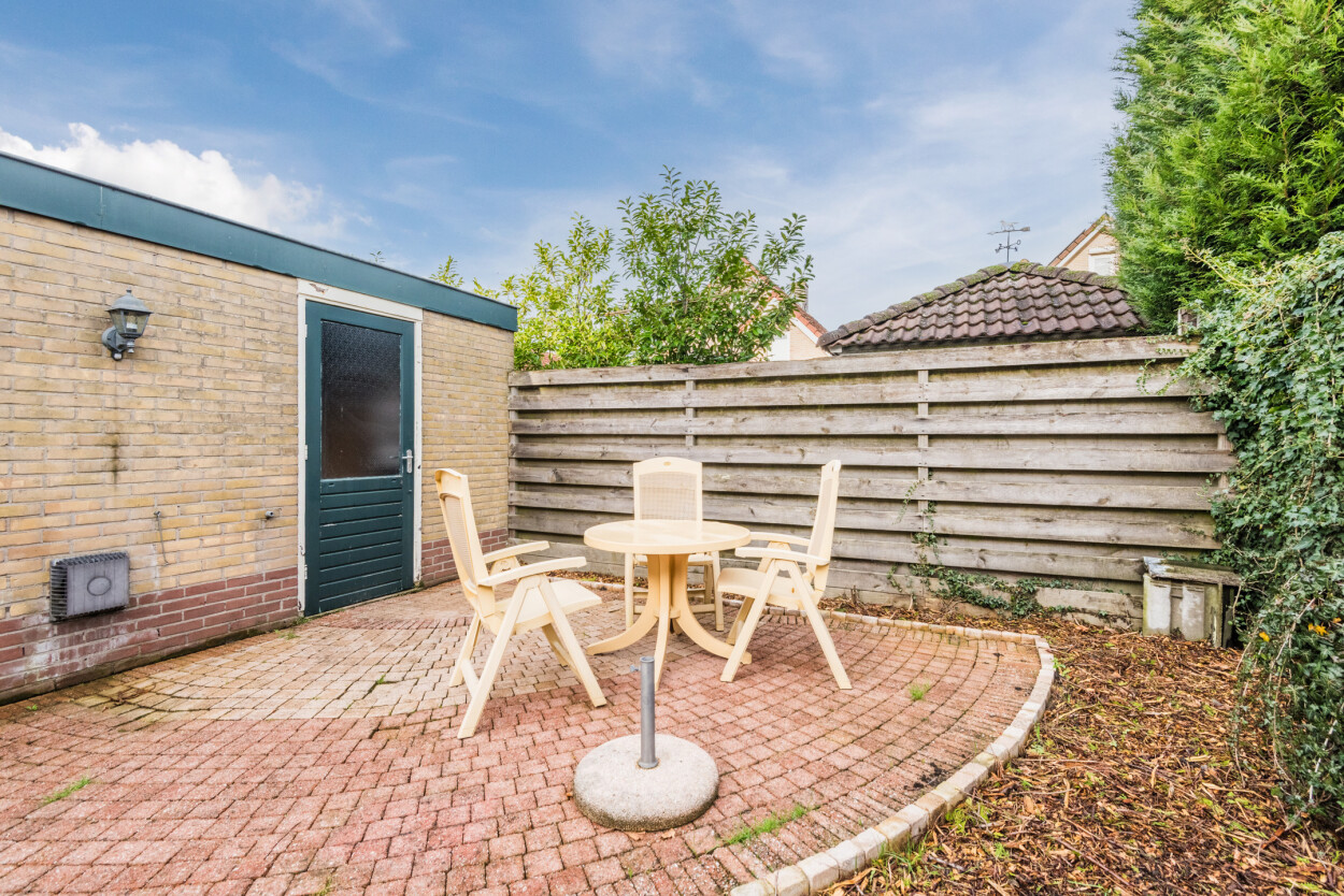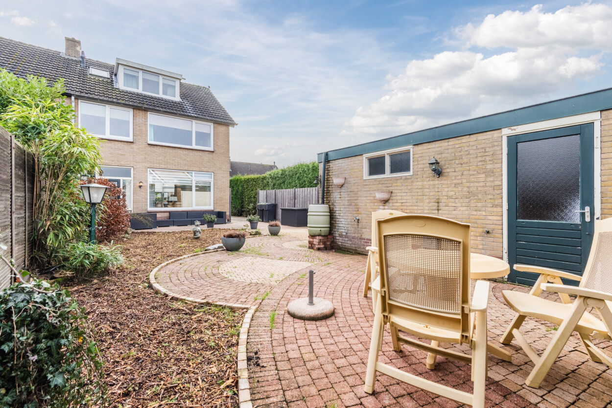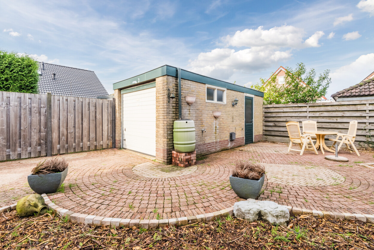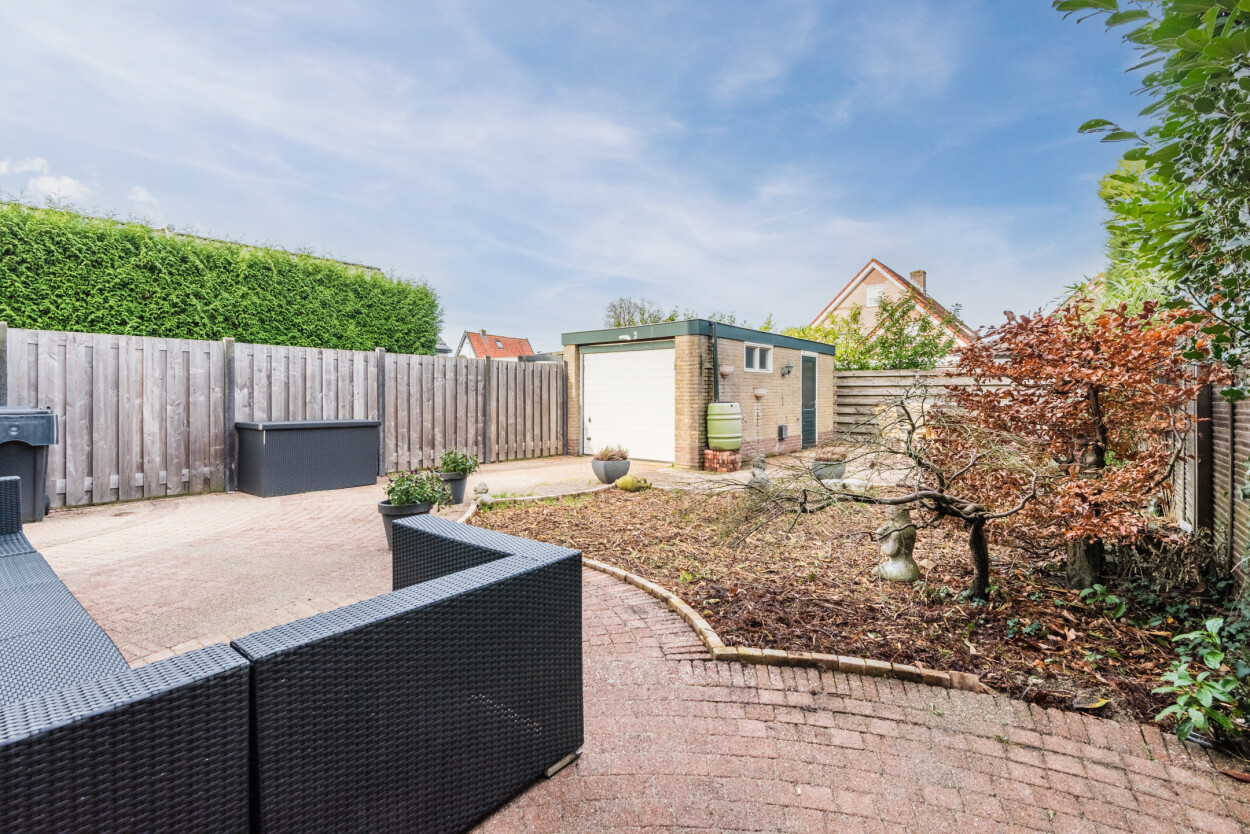 De achtertuin, gelegen op het noorden, is keurig aangelegd en biedt met een diepte van ca. 12 meter meerdere terrassen om op elk moment van de dag te genieten. Vanuit de tuin heeft u directe toegang tot zowel de zijtuin als de vrijstaande garage, voorzien van een kanteldeur en een aparte loopdeur.