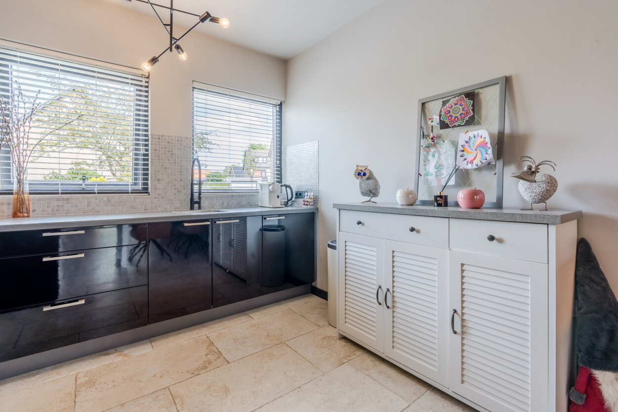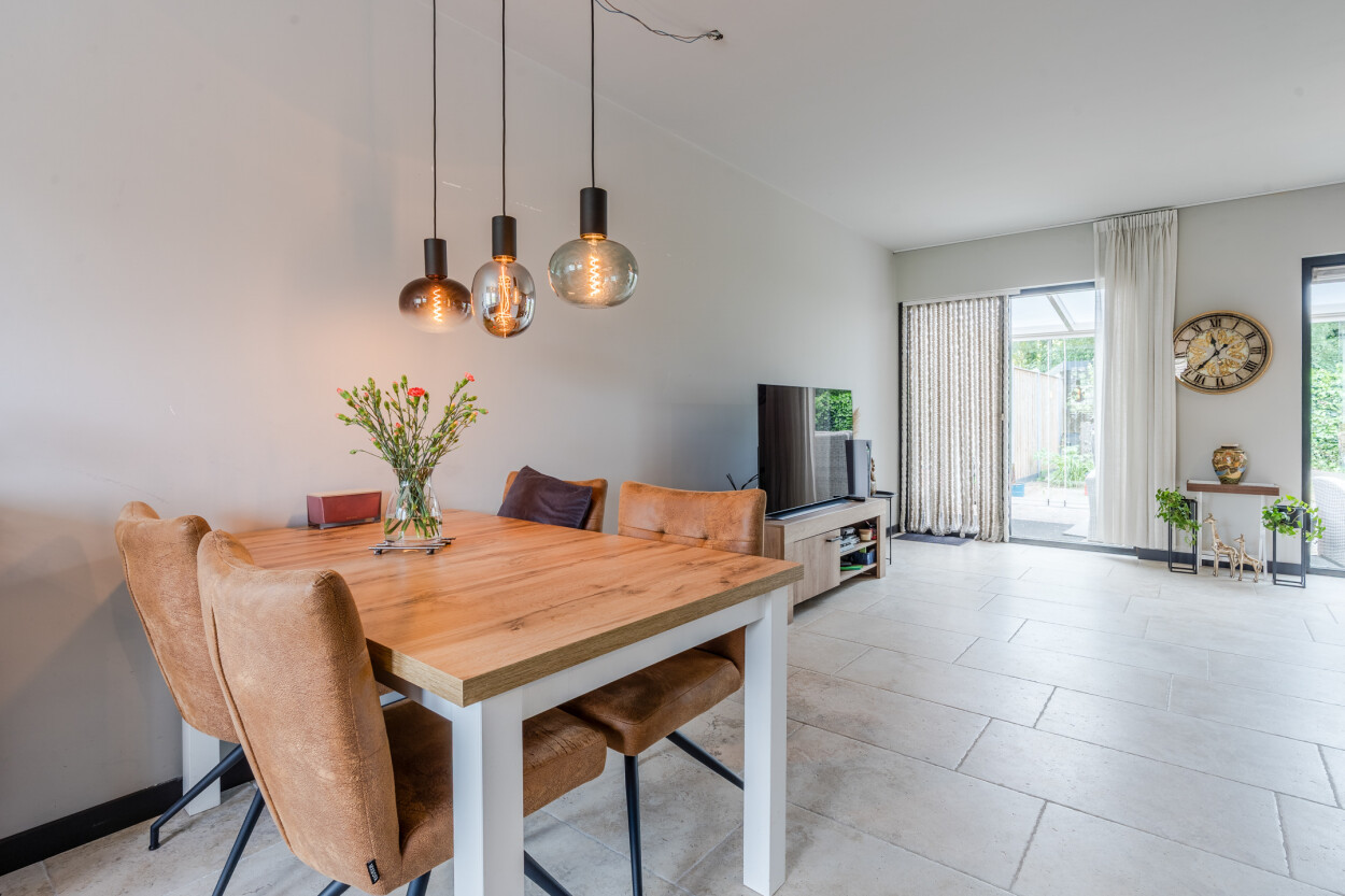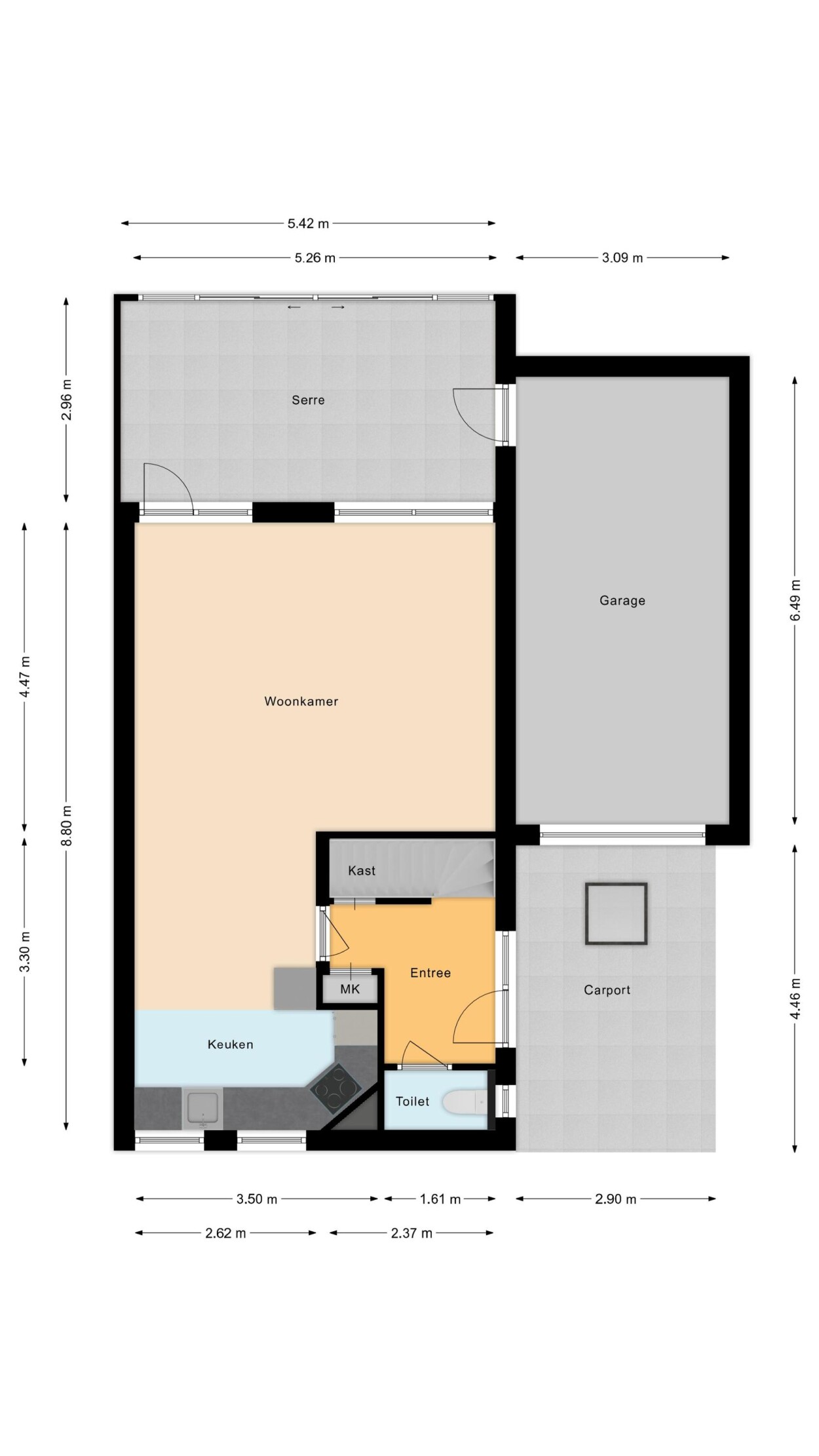 Via de entree komt u binnen in de hal, welke toegang biedt tot het toilet, de meterkast en de trapopgang met daaronder een handige trapkast. Vanuit de hal loopt u direct door naar de keuken, die aan de voorzijde van de woning is gesitueerd. De keuken is volledig uitgerust en beschikt over veel bergruimte. Een open verbinding zorgt voor een prettige doorloop naar de ruime woonkamer. Deze woonkamer is voorzien van een plavuizenvloer met comfortabele vloerverwarming. Via een loopdeur stapt u zo de prachtige aangebouwde serre in, een ideaal verlengstuk van de woonkamer. Dankzij de glazen wanden geniet u hier volop van het licht en heeft u altijd droge toegang tot de garage. Deze serre is een plek waar u het hele jaar door heerlijk kunt zitten, of het nu om een zonnige zomerdag gaat of een frisse herfstavond.