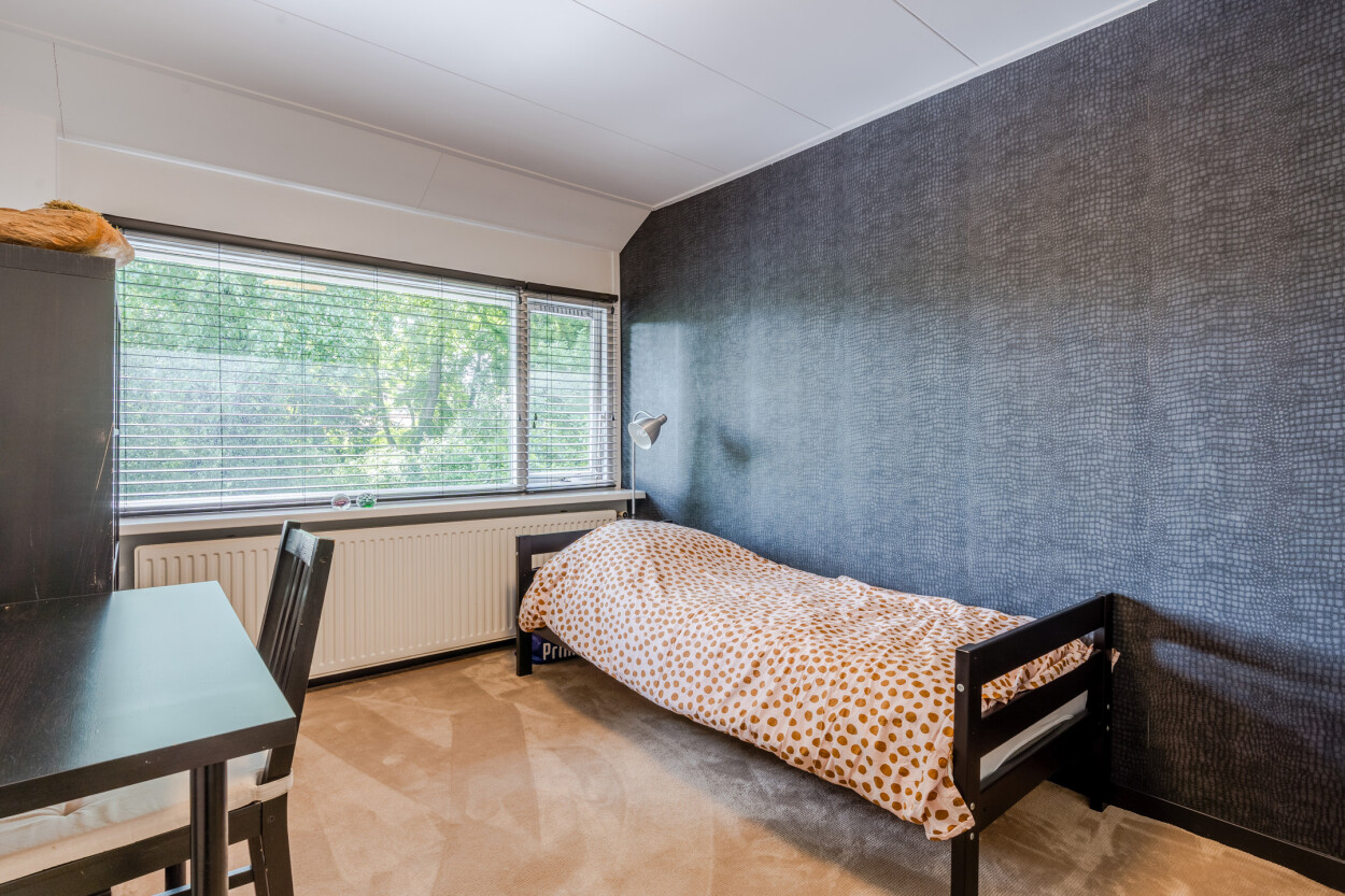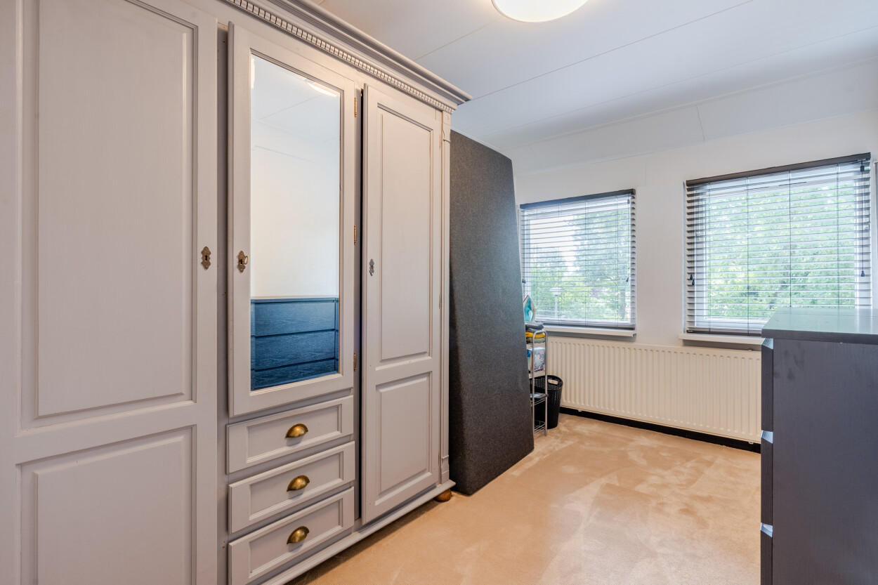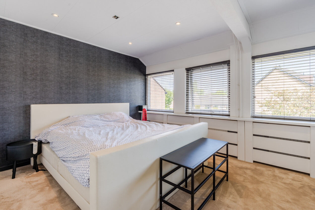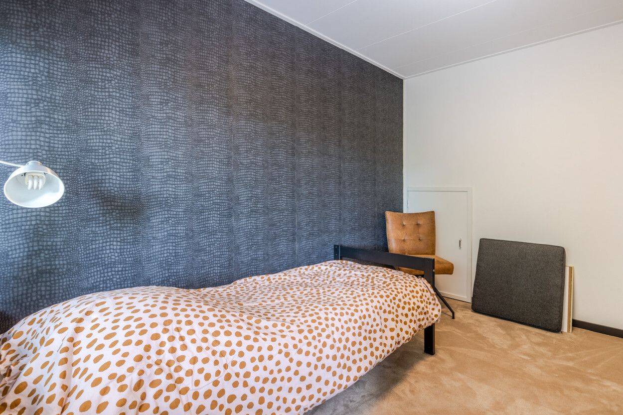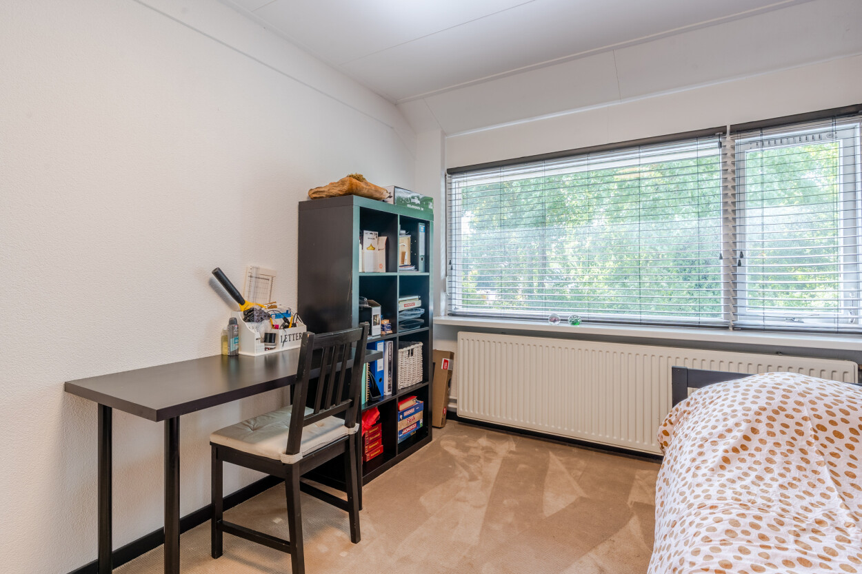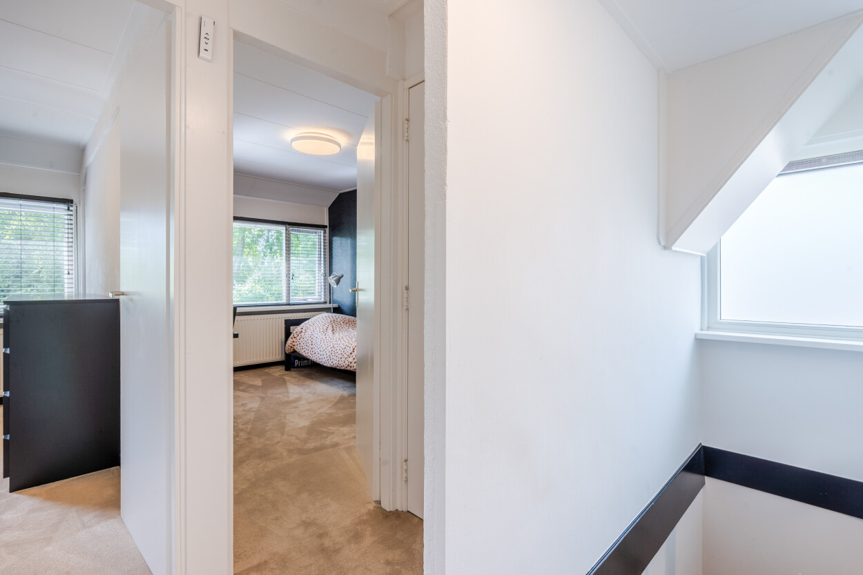 De korte overloop geeft toegang tot drie slaapkamers en de badkamer. De nette badkamer is voorzien van een toilet, een wastafelmeubel en een comfortabele inloopdouche. De ouderslaapkamer, gelegen aan de voorzijde van de woning, beschikt over een vaste inbouwkast en grote raampartijen die zorgen voor volop daglicht. Aan de achterzijde bevinden zich twee slaapkamers, beide uitgerust met buitenzonwering; één van deze kamers heeft bovendien een vaste kast.