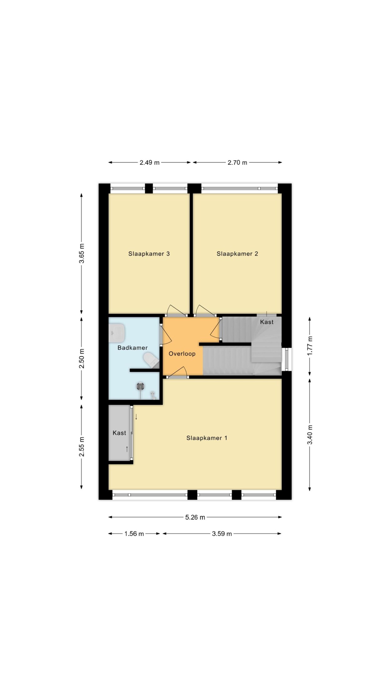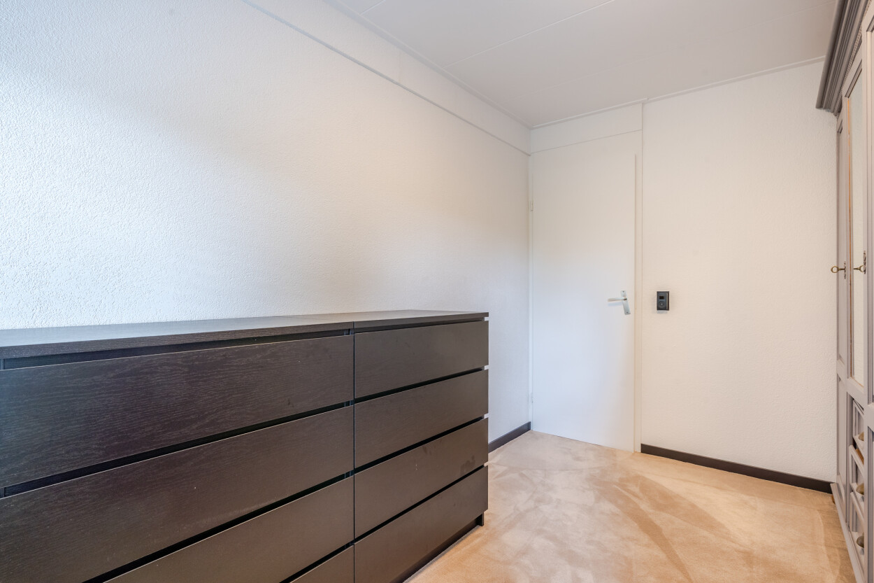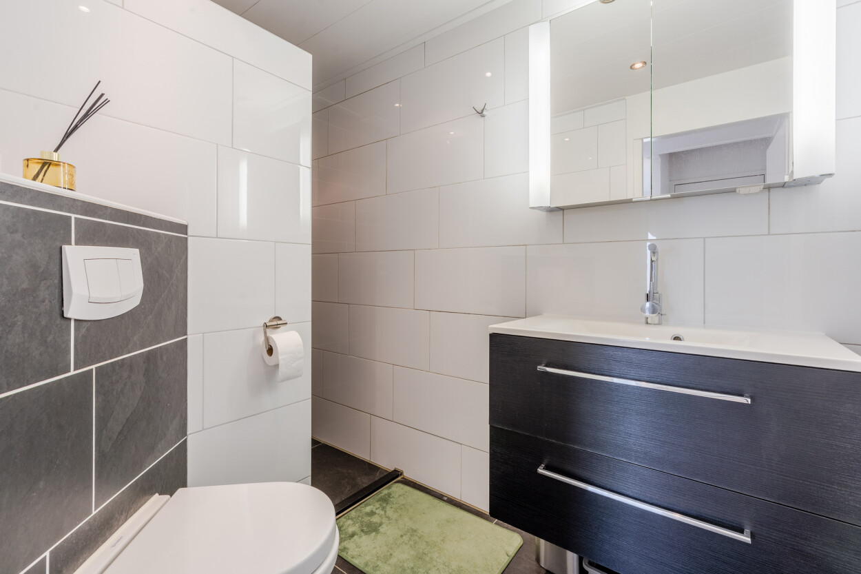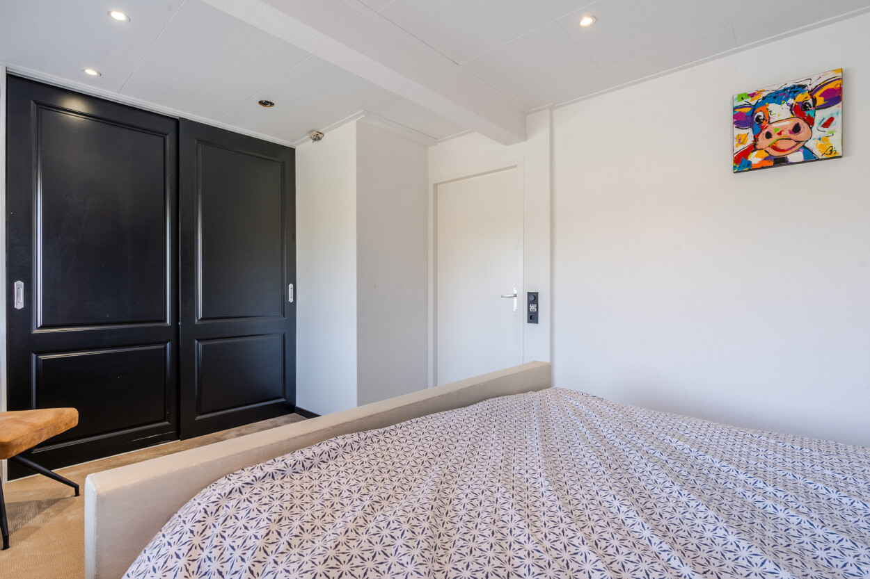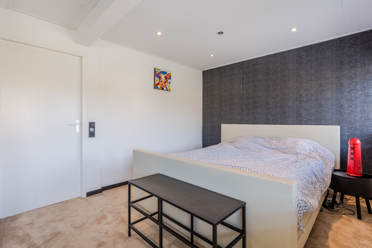 De korte overloop geeft toegang tot drie slaapkamers en de badkamer. De nette badkamer is voorzien van een toilet, een wastafelmeubel en een comfortabele inloopdouche. De ouderslaapkamer, gelegen aan de voorzijde van de woning, beschikt over een vaste inbouwkast en grote raampartijen die zorgen voor volop daglicht. Aan de achterzijde bevinden zich twee slaapkamers, beide uitgerust met buitenzonwering; één van deze kamers heeft bovendien een vaste kast.