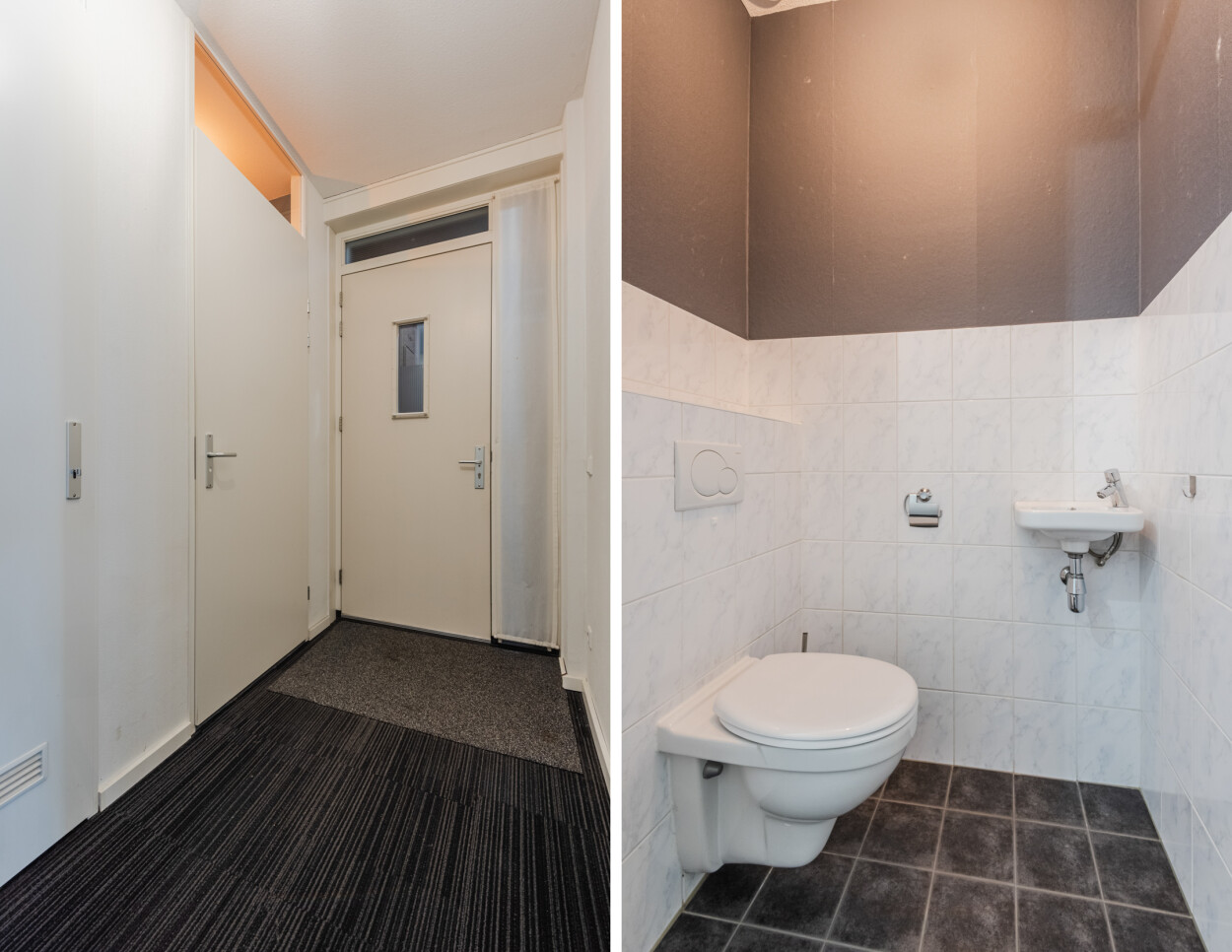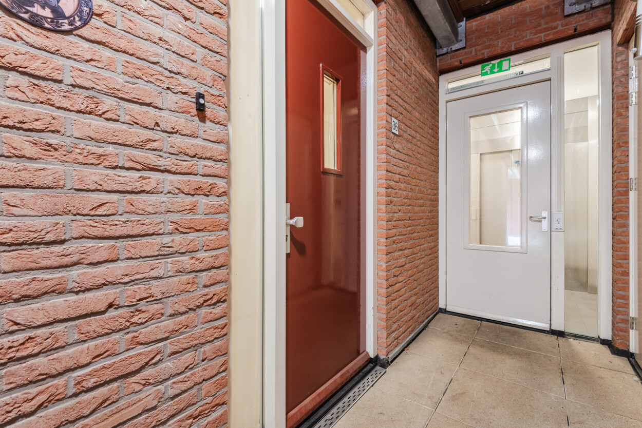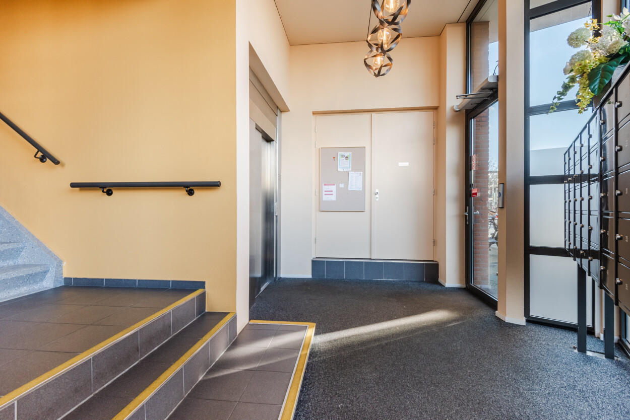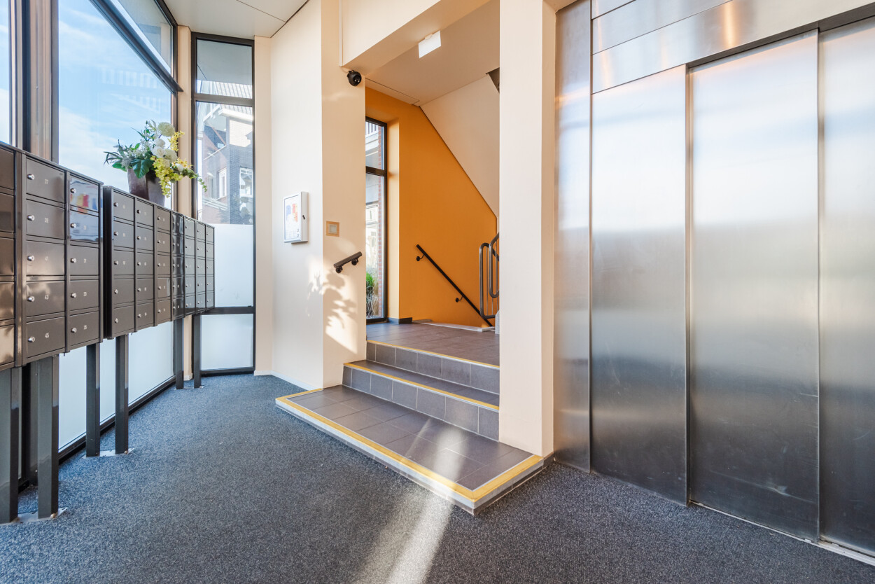 Representatieve entree van het complex met brievenbussen en bellentableau. Via de centrale hal heeft u toegang tot de liftinstallatie en het trappenhuis.