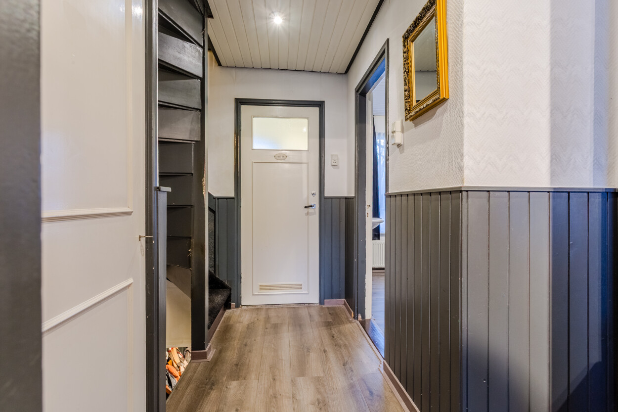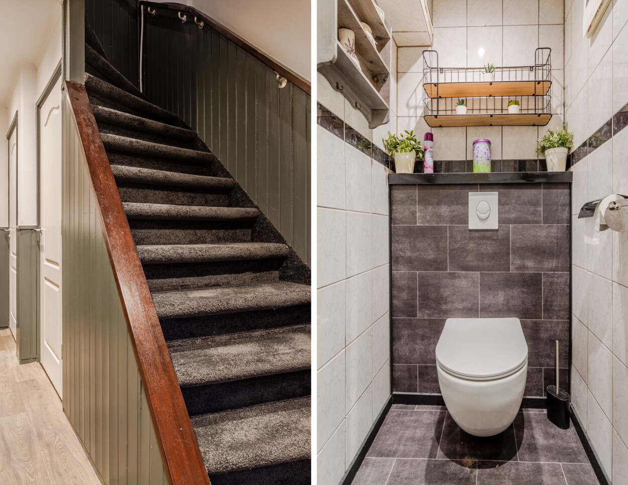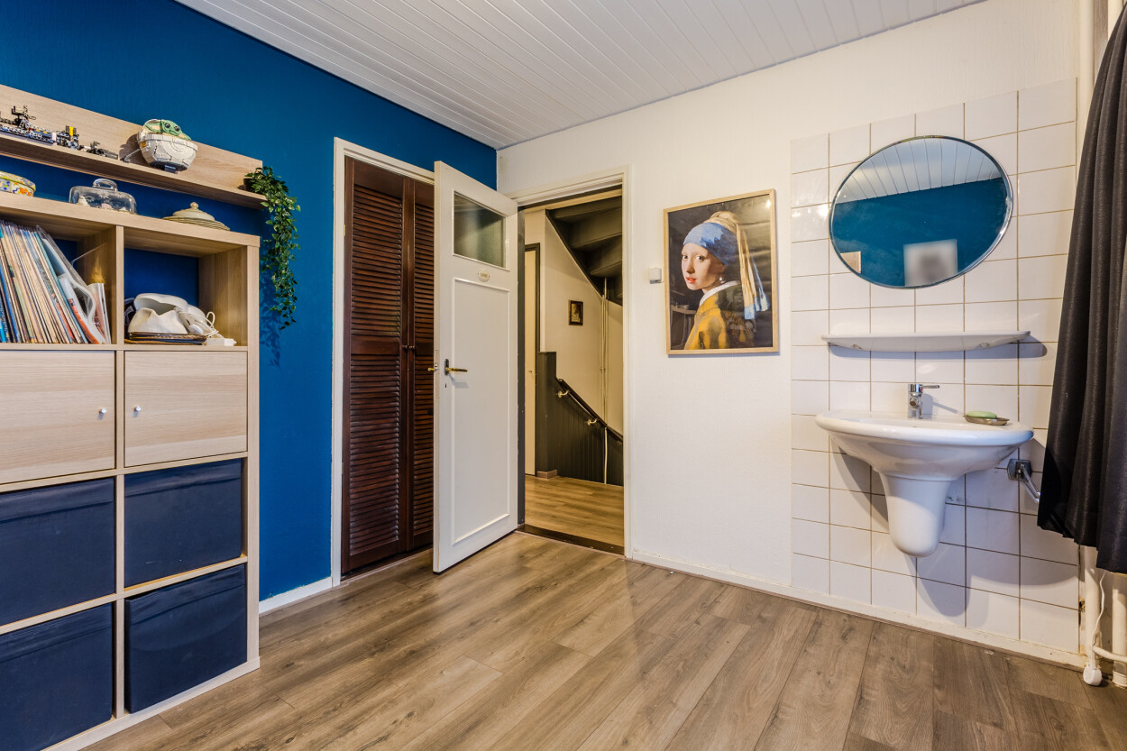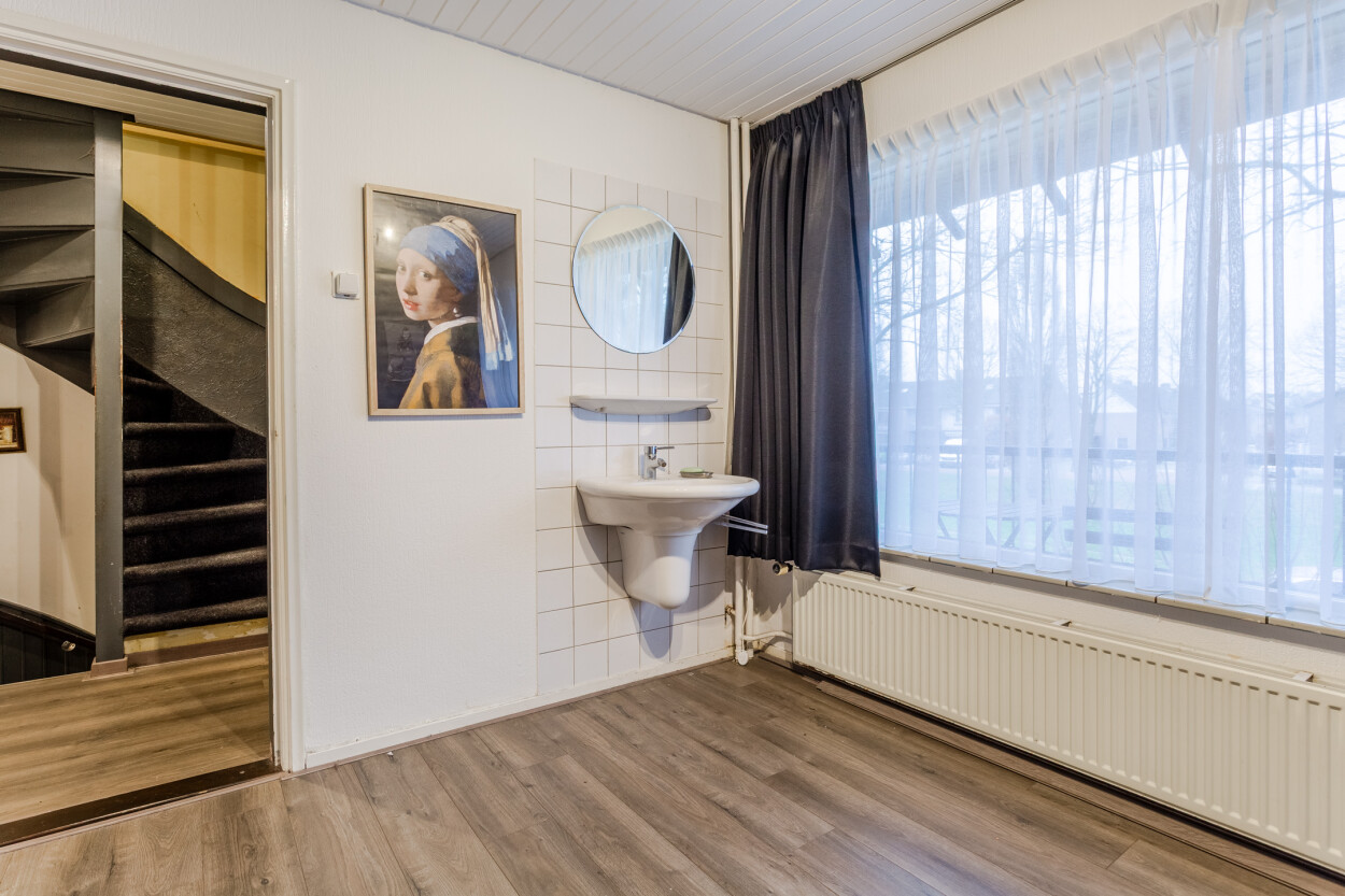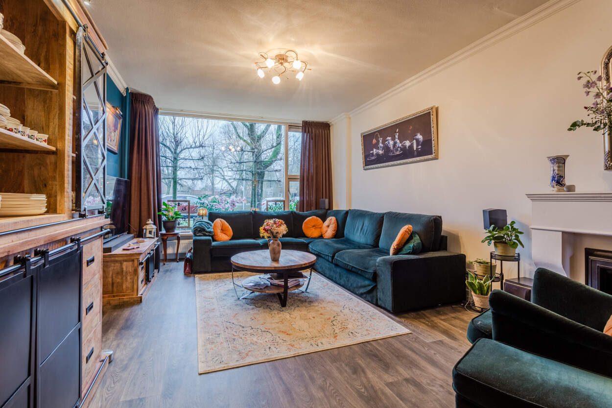 U betreedt de woning via een ruime entree met garderoberuimte. Vanuit de hal heeft u toegang tot de toiletruimte met fonteintje, de meterkast en trapkast, evenals de trapopgang naar de eerste verdieping. De woonkamer is sfeervol ingericht en voorzien van een elektrische haard. De erker zorgt niet alleen voor extra ruimte, maar biedt ook een volledig vrij uitzicht over het groenplantsoen en de vijverpartij aan de voorzijde. De halfopen keuken staat in verbinding met de woonkamer en beschikt over een loopdeur naar de achtertuin. De keuken is uitgerust met diverse inbouwapparatuur, waaronder een inductiekookplaat, combioven met magnetronfunctie, koelkast, vriezer, vaatwasser en afzuigkap.
