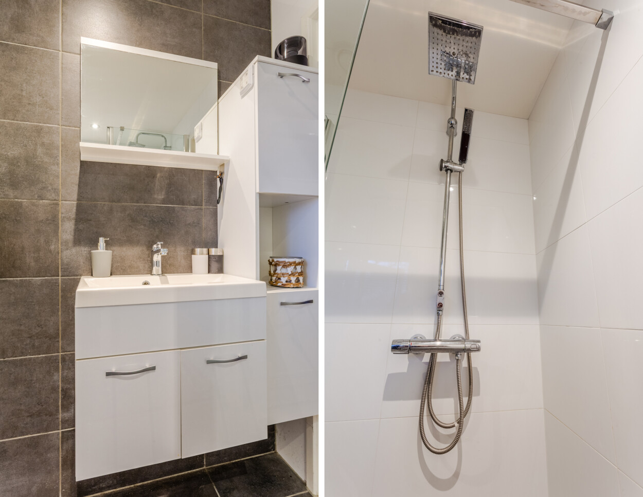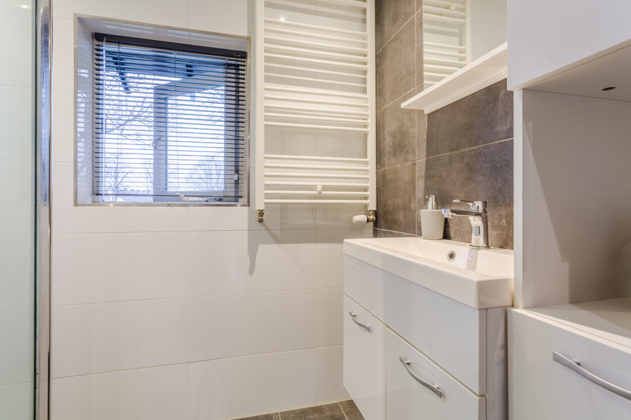 De ruime overloop geeft toegang tot drie slaapkamers met oppervlaktes van circa 8 m², 11 m² en 11 m². De ouderslaapkamer biedt voldoende ruimte voor een groot tweepersoonsbed en is voorzien van een vaste dubbele kast. De slaapkamer aan de voorzijde beschikt over een vaste wastafel, een vaste kast en biedt toegang tot het balkon. De moderne badkamer is ingericht met een wastafelmeubel en een ruime inloopdouche. Daarnaast bevindt zich op de overloop een separate vaste kast met de opstelplaats voor de wasmachine en droger.