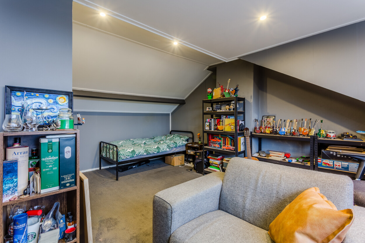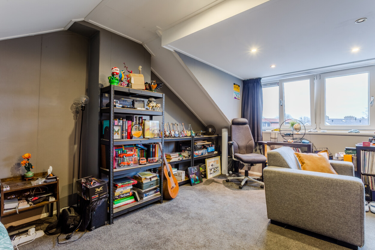 Op de tweede verdieping vindt u een ruime overloop met de opstelplaats van de cv-installatie, een huurketel uit 2021, en extra bergruimte achter de knieschotten. Vanaf hier heeft u toegang tot de vierde slaapkamer van circa 18 m². Deze royale kamer is voorzien van een dakkapel over de volledige breedte van de woning en beschikt aan beide zijden over knieschotbergingen.