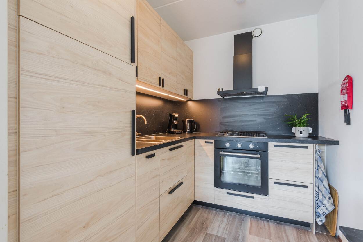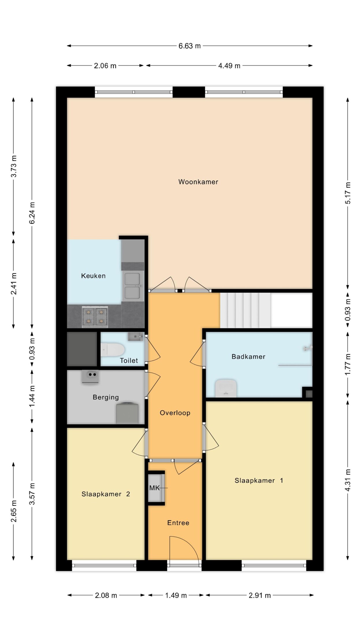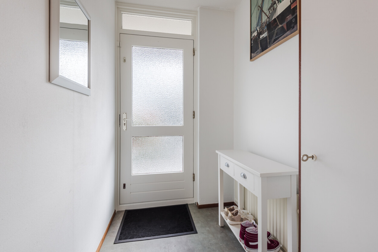 Hal/entree met meterkast, twee slaapkamers, een praktische berging met wasmachineaansluiting, een toilet met fonteintje en een badkamer voorzien van inloopdouche en wastafelmeubel. Aan de achterzijde bevindt zich de open moderne keuken (2024), uitgerust met diverse inbouwapparatuur en in open verbinding met de lichte woonkamer.