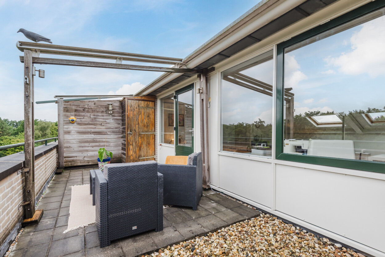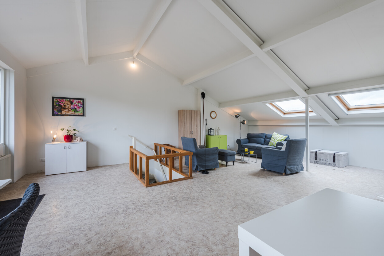 De tweede woonlaag is een bijzondere ruimte met hoge nok en veel daglicht dankzij de glazen pui en dakramen. Momenteel in gebruik als hobby- en tweede woonkamer, maar u kunt deze open en lichte verdieping volledig naar eigen wens indelen. Of u hier een royale woonkamer van maakt, extra slaapkamers creëert, of een combinatie van wonen en werken realiseert, de mogelijkheden zijn eindeloos. Het riante dakterras maakt het woonplezier compleet. Dankzij de ligging op het zuidwesten kunt u hier de hele dag van de zon genieten, in alle rust of samen met vrienden en familie.