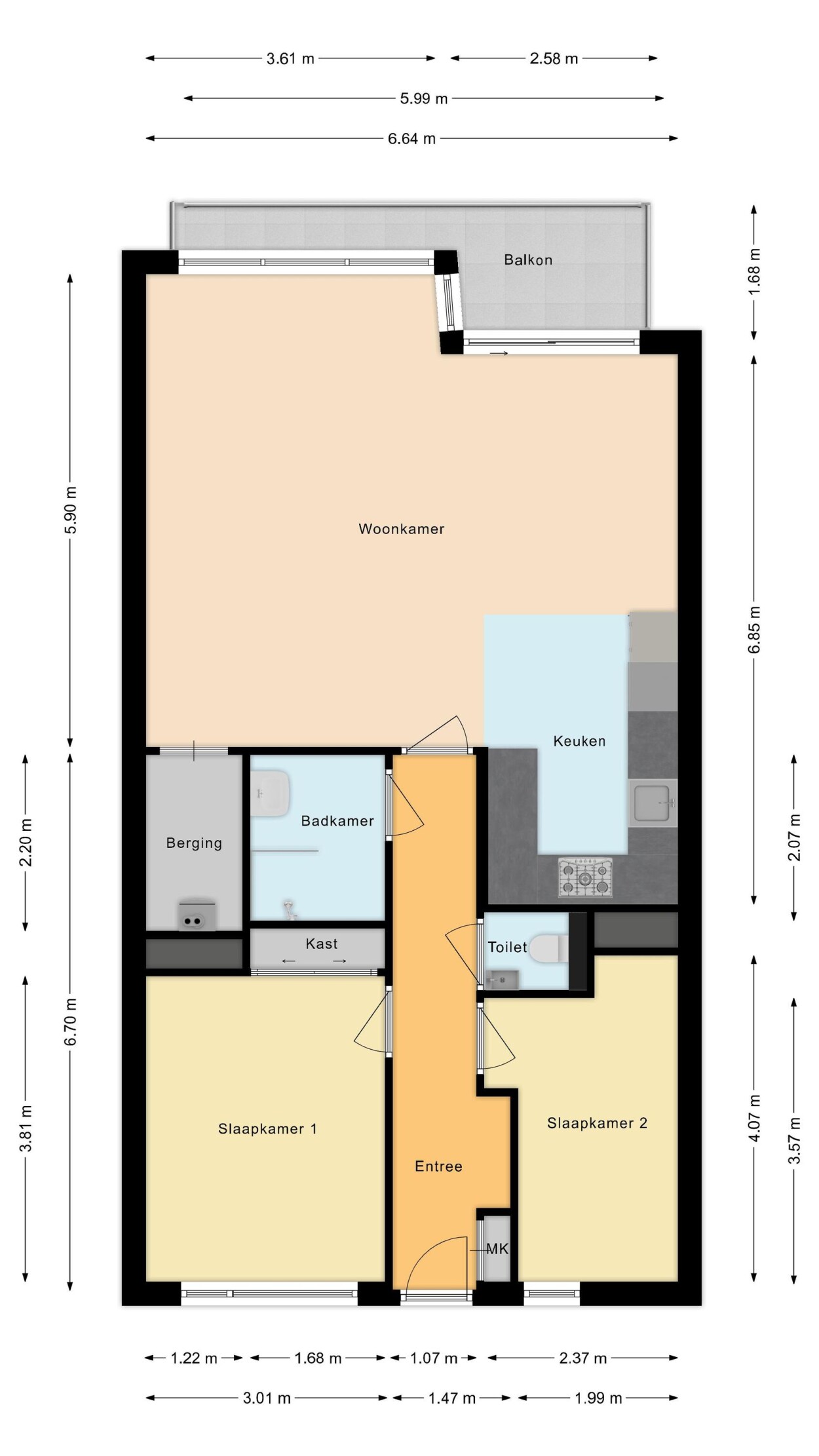 Het appartement is gelegen op de begane grond van het complex en beschikt over een ruim balkon van circa 6 m², gesitueerd op het zuiden. Via de voordeur komt u binnen in de entreehal, waar zich de meterkast, twee slaapkamers, de badkamer en het toilet bevinden. Beide slaapkamers liggen aan de achterzijde van het appartement. De ruime hoofdslaapkamer is bovendien voorzien van een vaste kastenwand. De moderne badkamer is uitgerust met een royaal wastafelmeubel, een designradiator en een comfortabele inloopdouche.