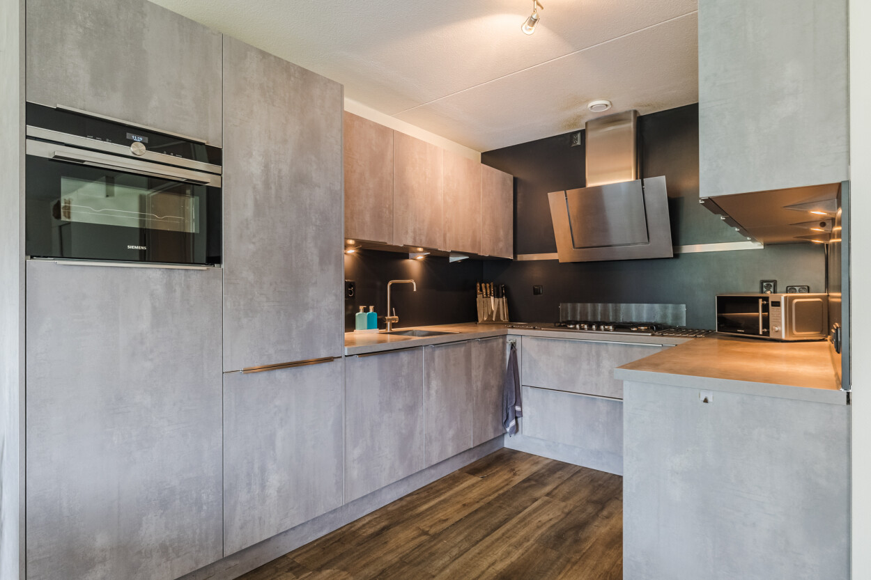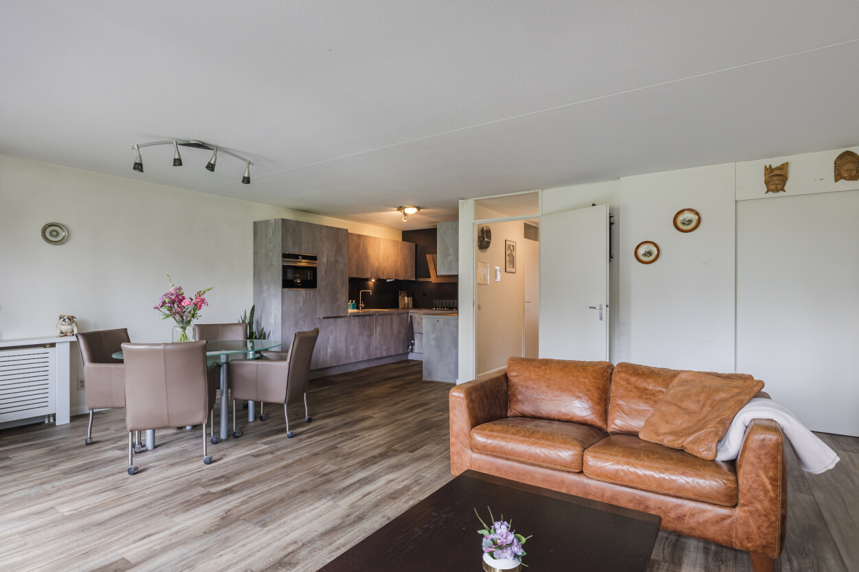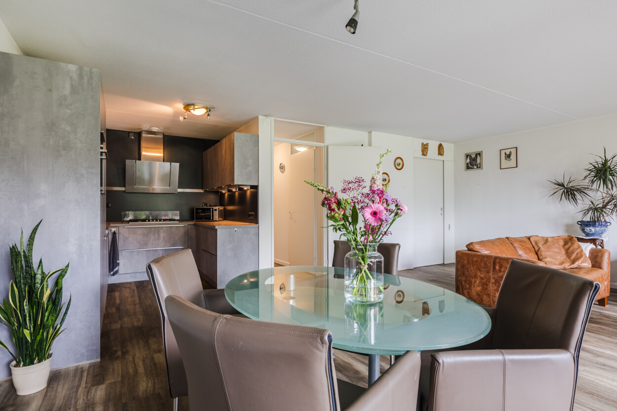 Vanuit de hal bereikt u de lichte woonkamer met grote raampartijen. Het eetgedeelte en de keuken zijn in open verbinding met de woonkamer gesitueerd, waardoor er een ruimtelijk en sfeervol geheel ontstaat. De moderne inbouwkeuken is uitgevoerd in een praktische U-opstelling, biedt veel opbergruimte en is voorzien van diverse inbouwapparatuur. In de woonkamer bevindt zich tevens een provisiekast met de opstelplaats van de cv-installatie (2025), de mechanische ventilatie en aansluitingen voor wasmachine en droger. Vanuit de woonkamer heeft u toegang tot het zonnige balkon, waar u kunt genieten van een fantastisch uitzicht – een fijne plek om te ontspannen.