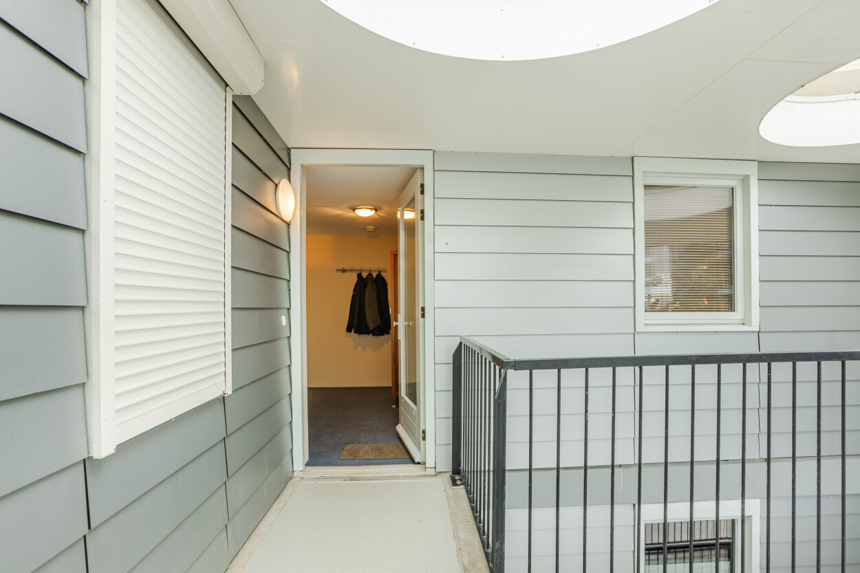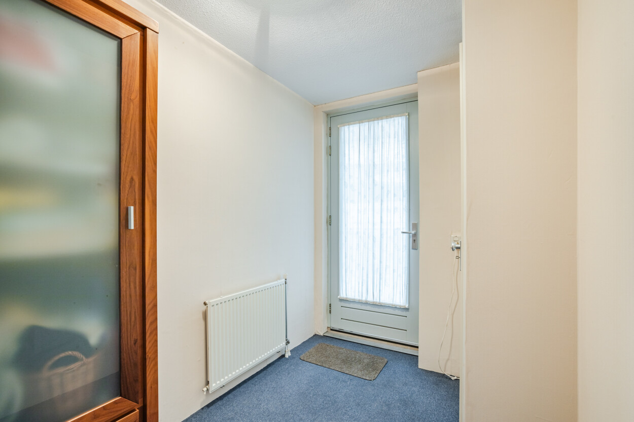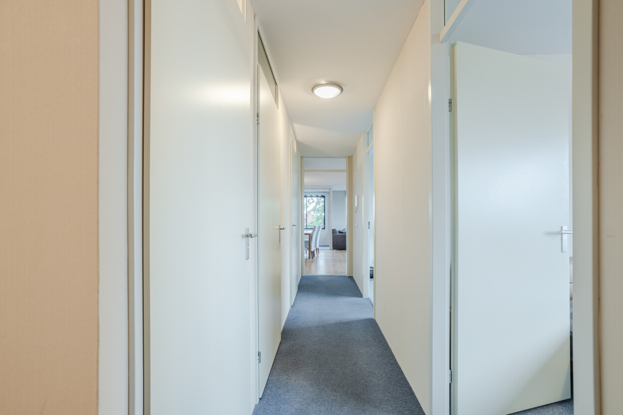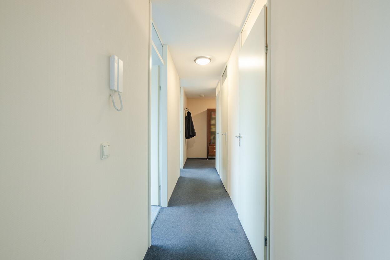 Het appartement is gelegen aan de achterzijde op de tweede verdieping van het complex. Via de voordeur komt u binnen in de entreehal, waar zich de meterkast, technische bergruimte, twee slaapkamers, de badkamer en het toilet bevinden.