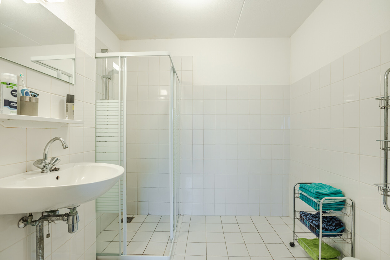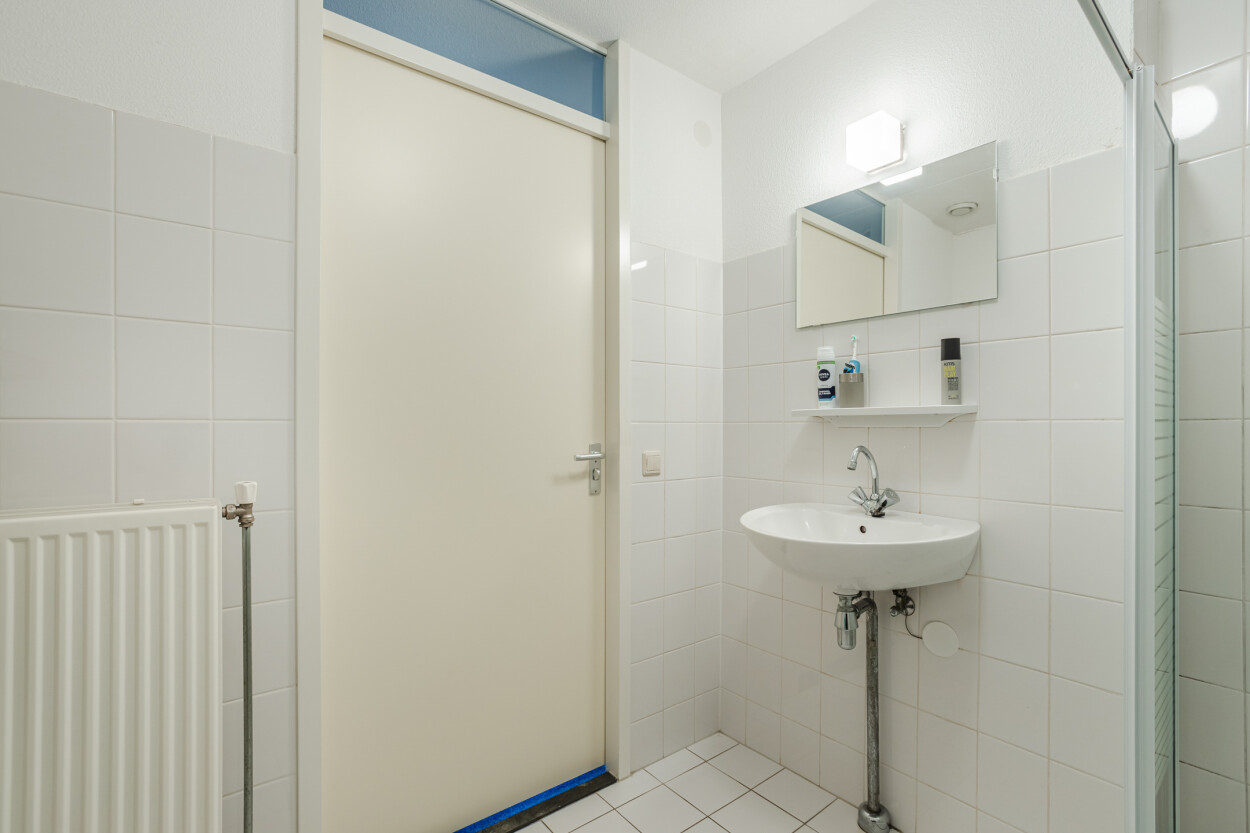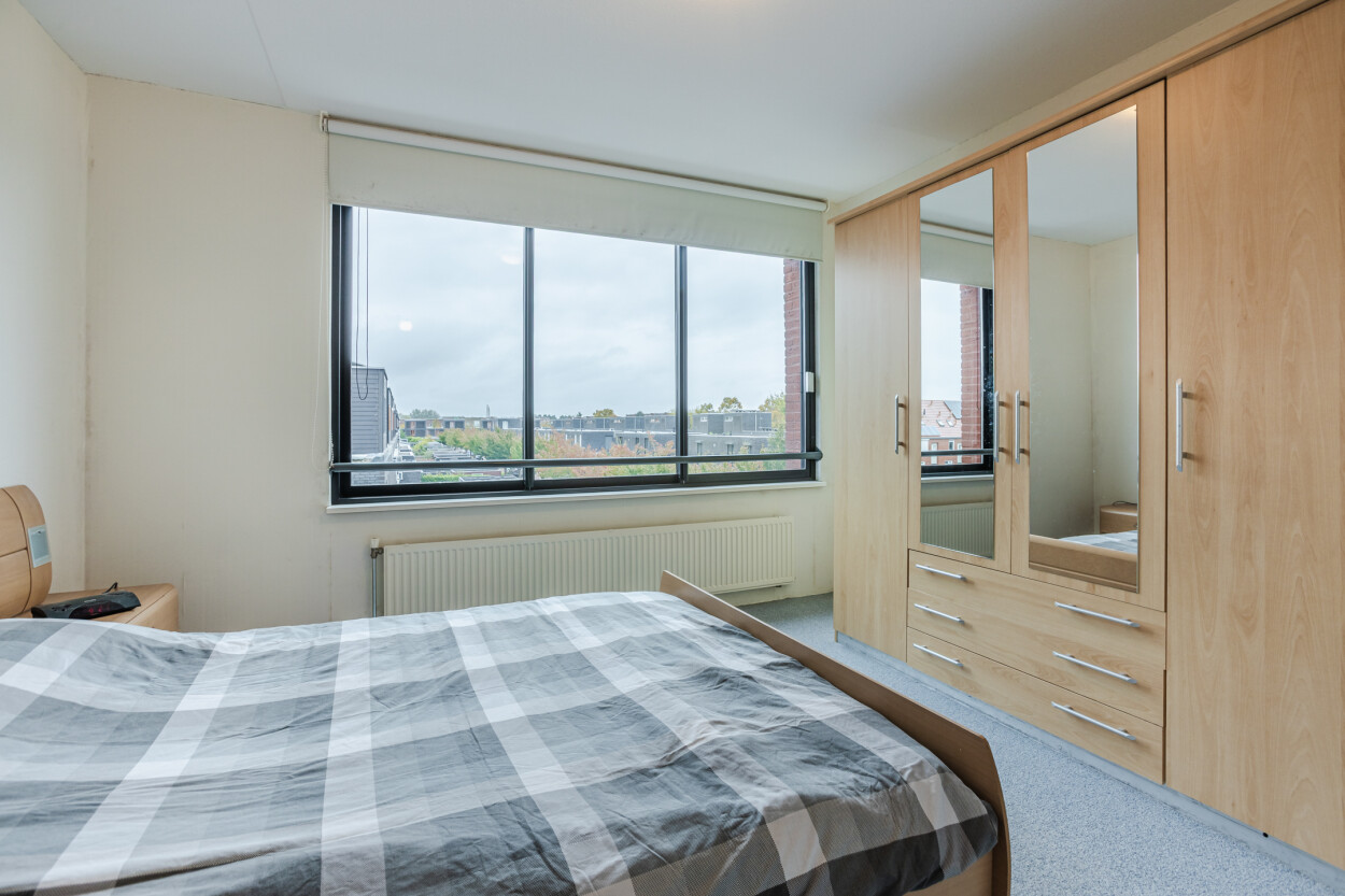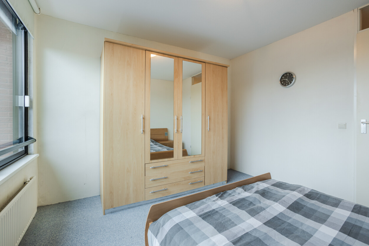 Het appartement is gelegen op een hoek, waardoor u kunt genieten van een fantastisch uitzicht over de waterpartij en de woonstraat. De twee slaapkamers bieden voldoende ruimte voor een tweepersoonsbed en kasten. De badkamer is eenvoudig uitgevoerd en voorzien van een douche en wastafel. Er is een separate toiletruimte en een inpandige bergkast (technische ruimte) met de opstelplaats van de cv-installatie, de mechanische ventilatie en aansluitingen voor wasmachine en droger.