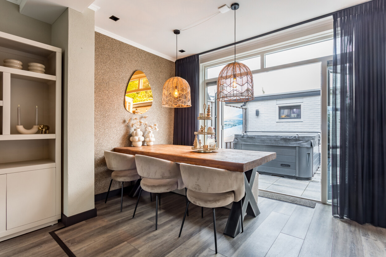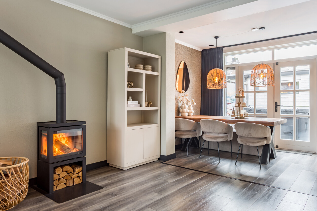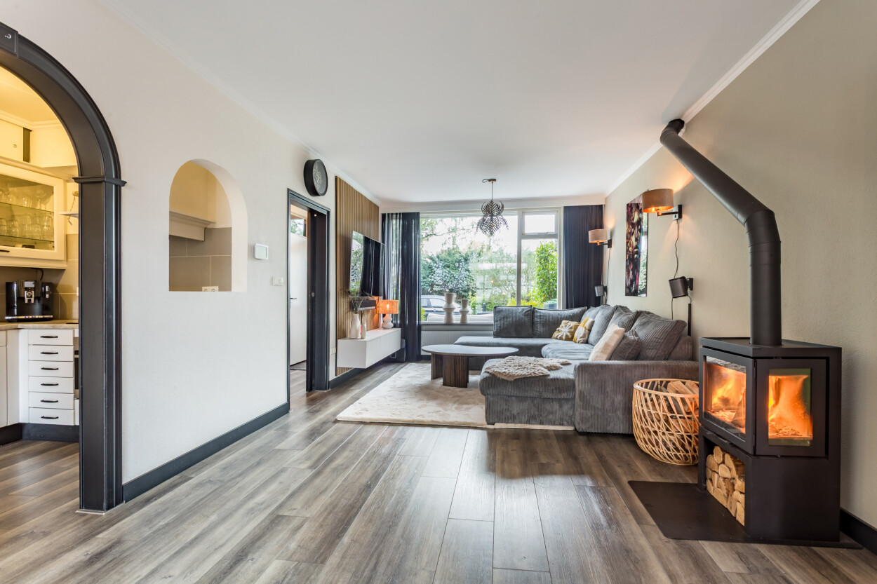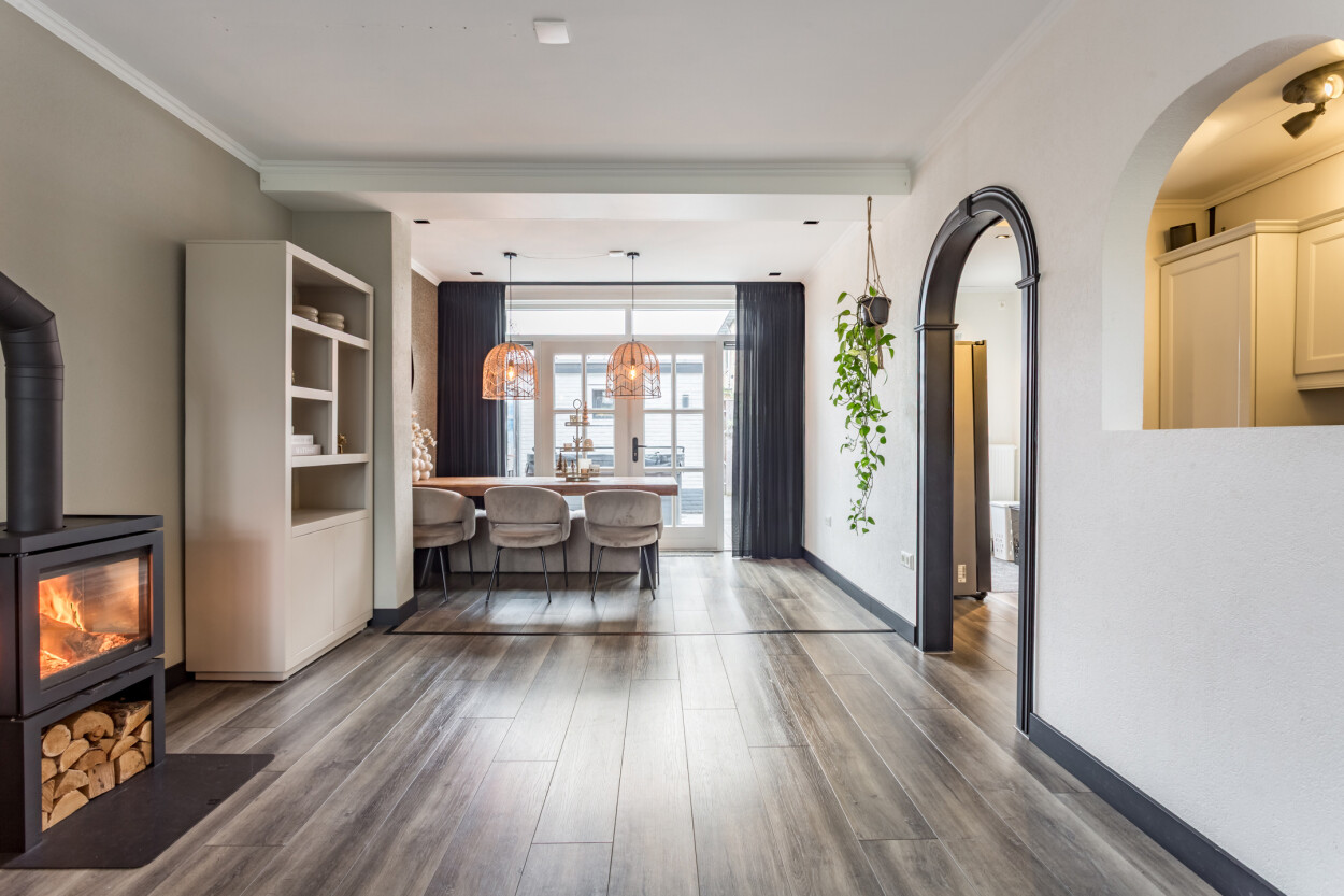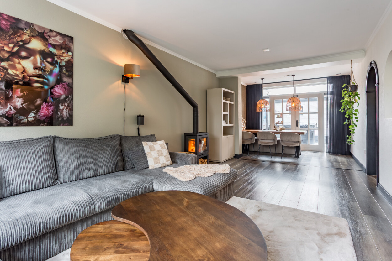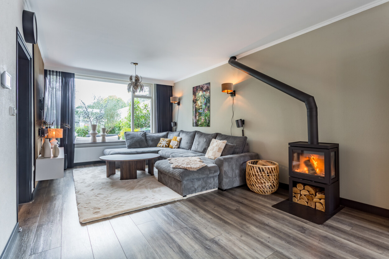 Welkom in deze goed onderhouden en uitgebouwde tussenwoning waar ruimte, comfort en een prettige woonomgeving samenkomen. De ruime woonkamer is heerlijk licht en sfeervol dankzij de aanwezige houtkachel. Via de openslaande deuren heeft u direct toegang tot de achtertuin op het oosten, een fijne plek om in alle rust van de ochtend- en middagzon te genieten.