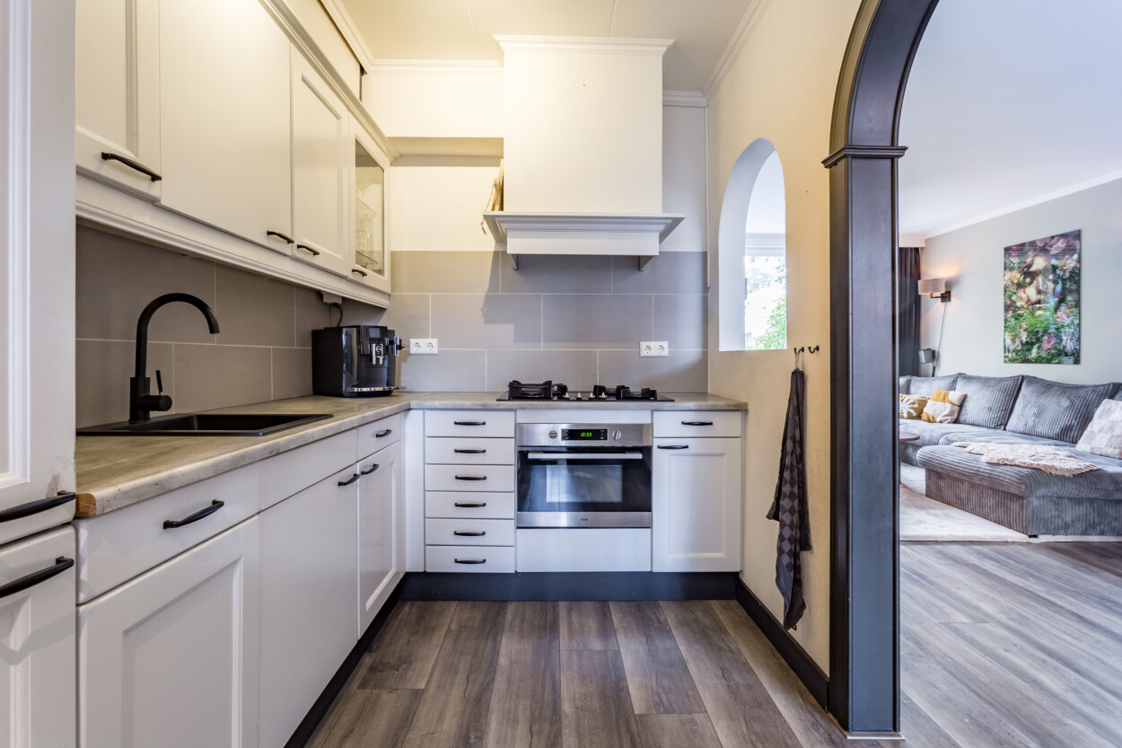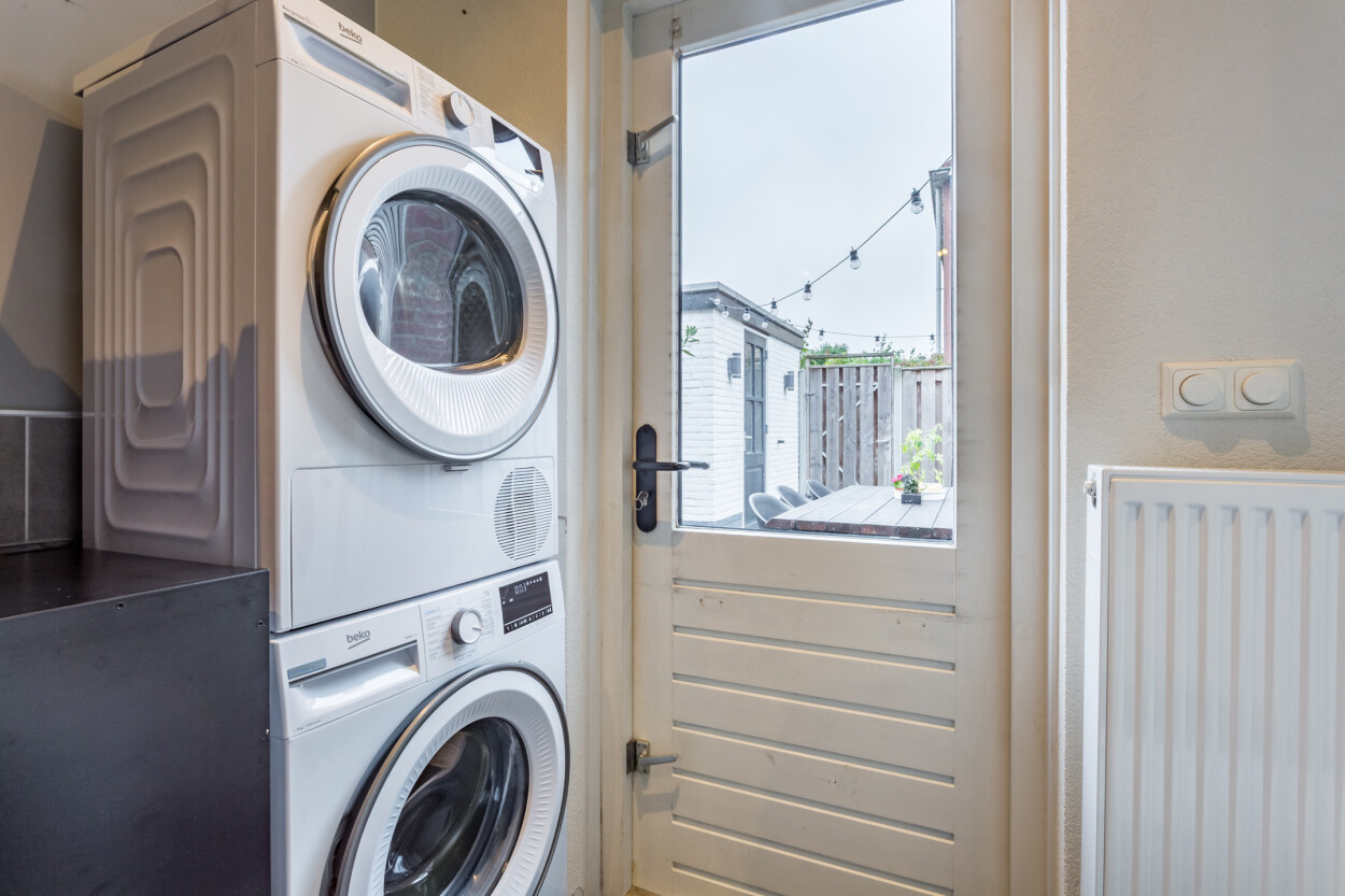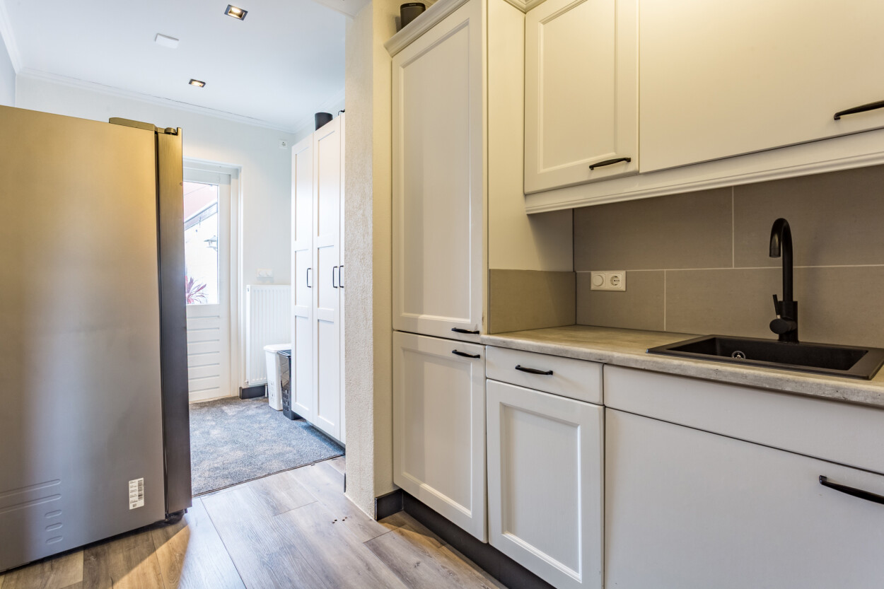 De woonkamer staat in verbinding met de halfopen keuken, wat zorgt voor een prettige indeling en veel contact met de leefruimte. Aansluitend bevindt zich de praktische bijkeuken met de opstelplaats voor wasmachine en droger, ideaal voor extra bergruimte en dagelijkse gemak.