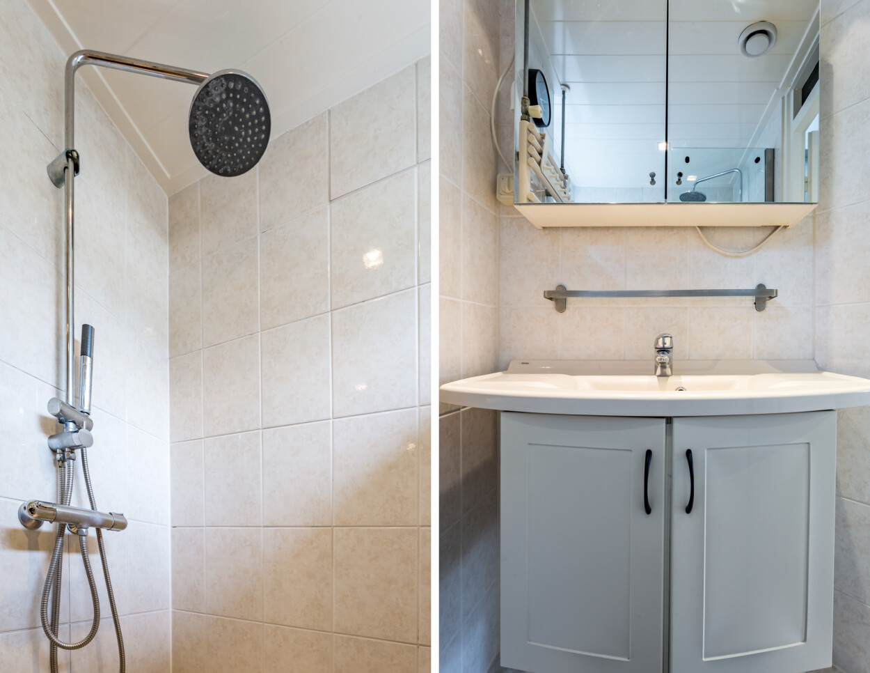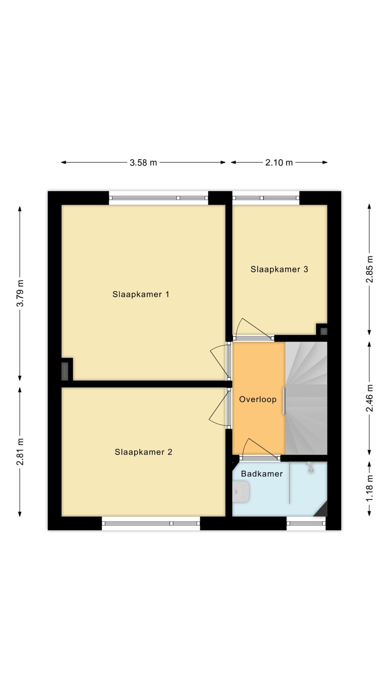 Te bereiken middels een vaste trap. Ruime overloop met bergruimte achter de knieschotten, voorzien van airconditioning en toegang tot twee slaapkamers. Dankzij de kunststof dakkapellen aan weerszijden zijn dit volwaardige en lichte kamers.