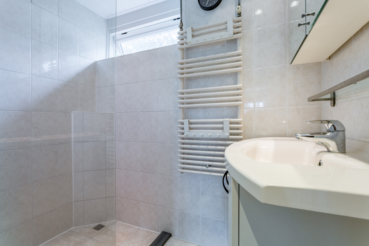 Overloop met toegang tot drie slaapkamers, waarvan één is voorzien van een wasmachineaansluiting. De badkamer is uitgerust met een inloopdouche en een wastafelmeubel.