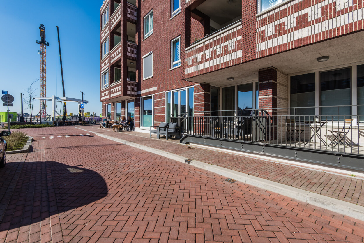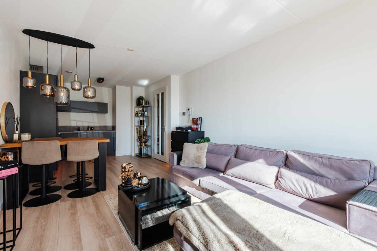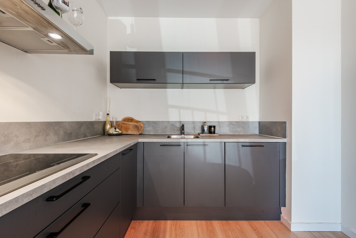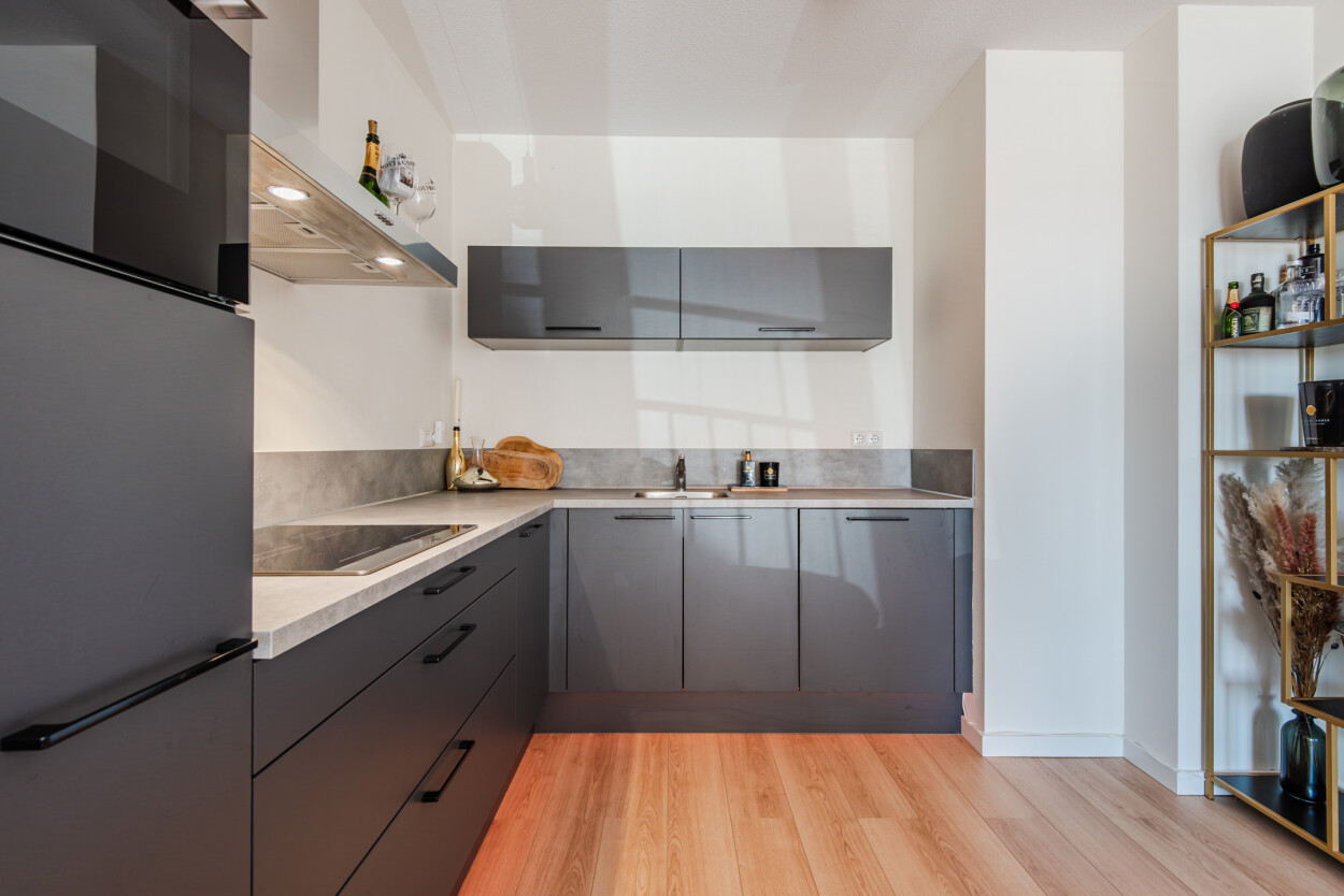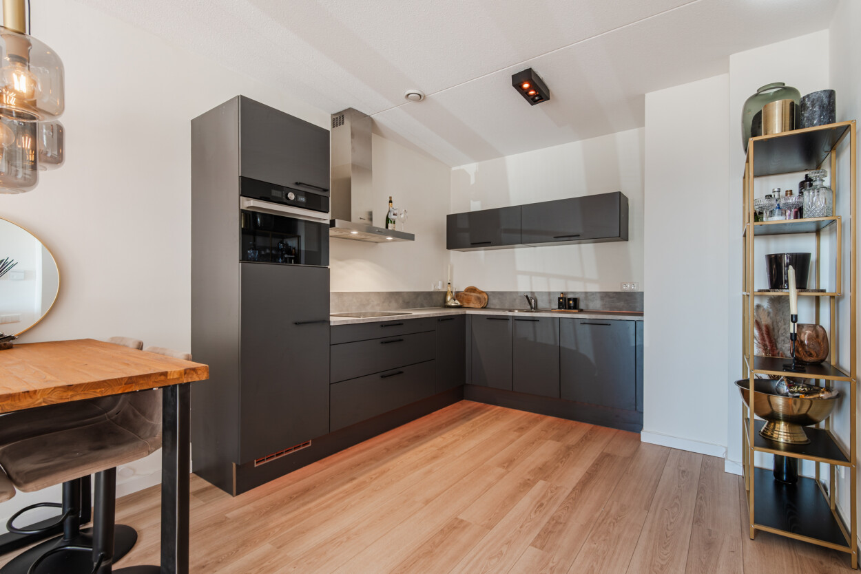 Vanuit de hal bereikt u de woonkamer, de slaapkamer en de badkamer. De woonkamer ligt aan de voorzijde van het appartement en is heerlijk licht door de grote raampartijen. Hier geniet u van een prachtig uitzicht over het water en heeft u directe toegang tot het terras. De luxe matzwarte hoekkeuken staat in open verbinding met de woonkamer en is voorzien van diverse inbouwapparatuur en voldoende bergruimte.