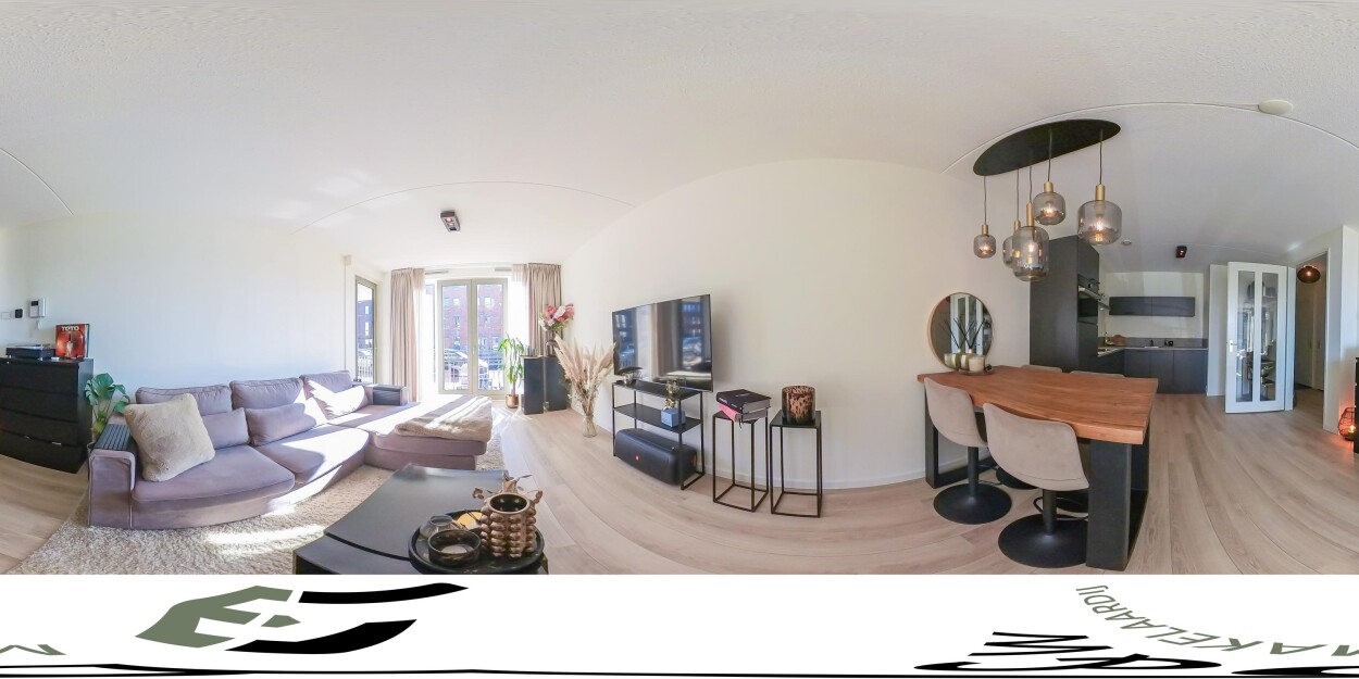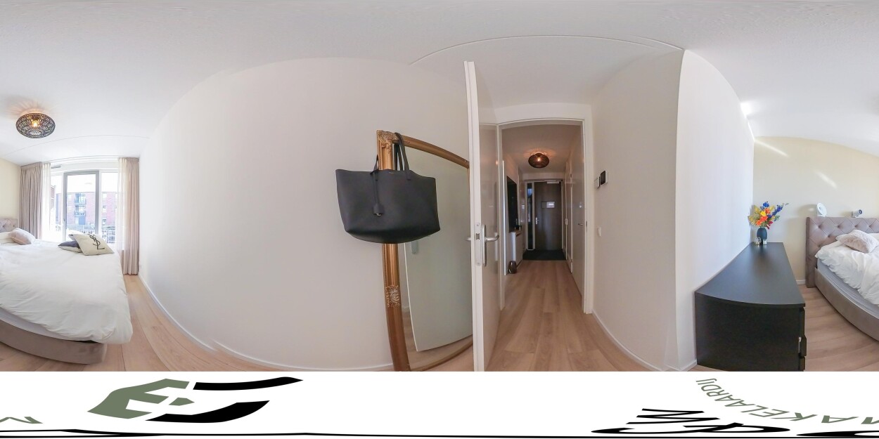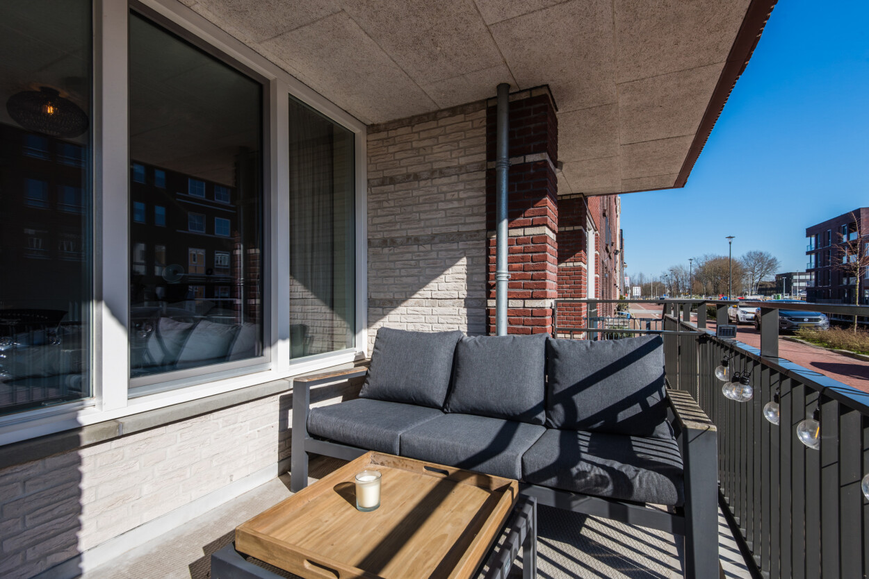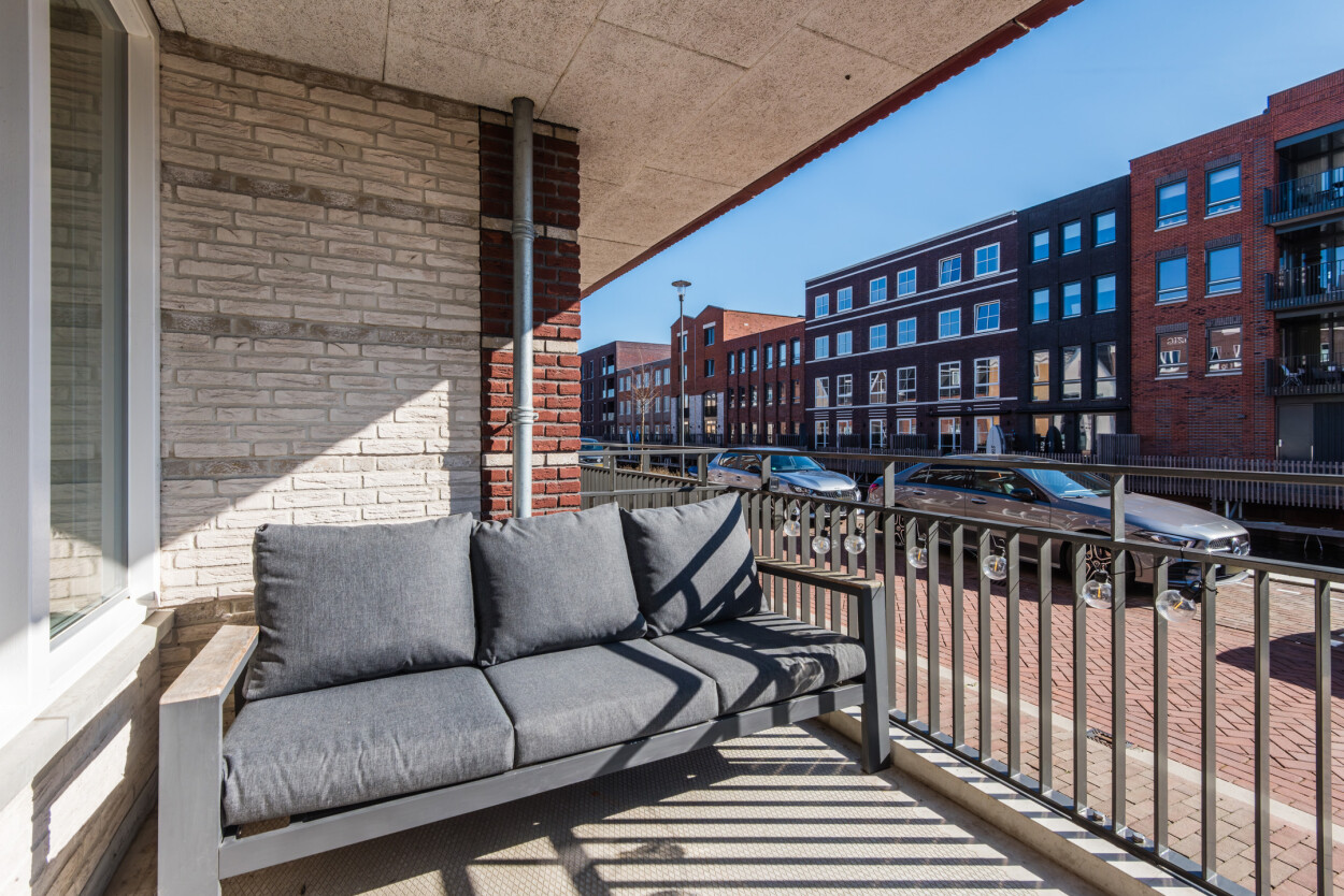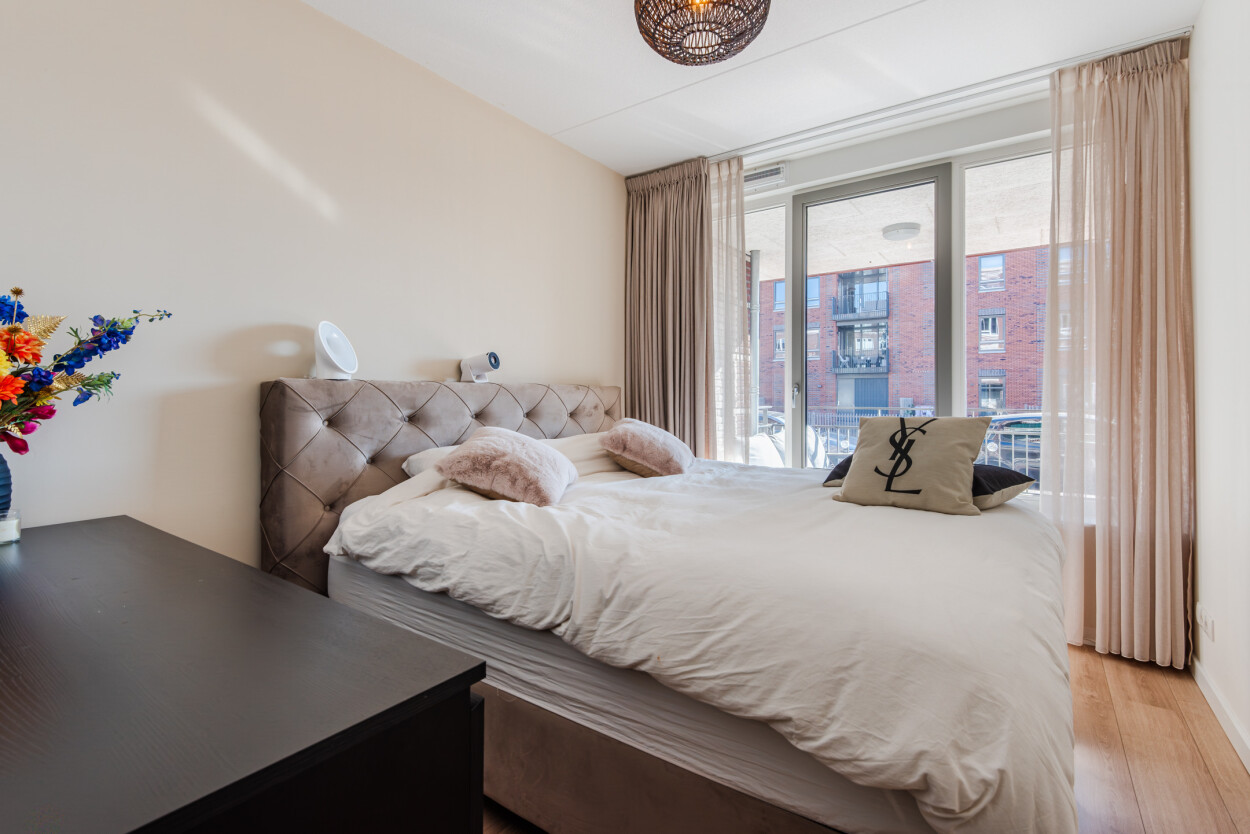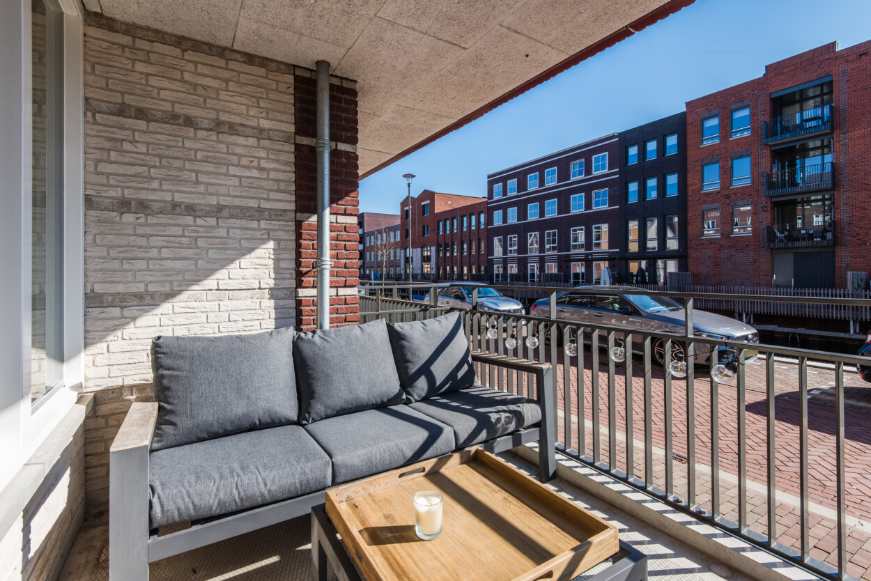 Vanuit de hal bereikt u de woonkamer, de slaapkamer en de badkamer. De woonkamer ligt aan de voorzijde van het appartement en is heerlijk licht door de grote raampartijen. Hier geniet u van een prachtig uitzicht over het water en heeft u directe toegang tot het terras. De luxe matzwarte hoekkeuken staat in open verbinding met de woonkamer en is voorzien van diverse inbouwapparatuur en voldoende bergruimte.