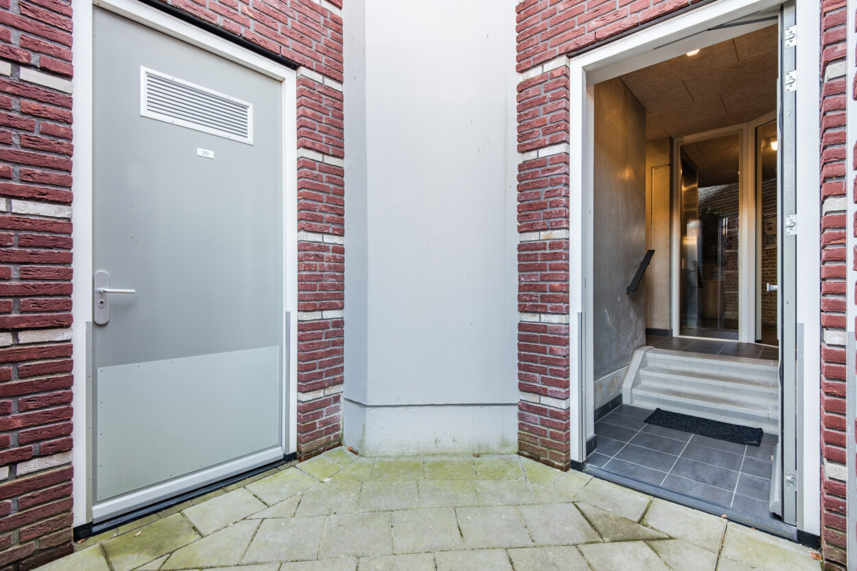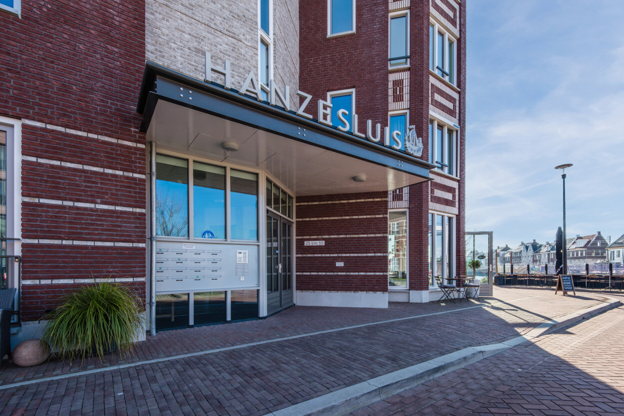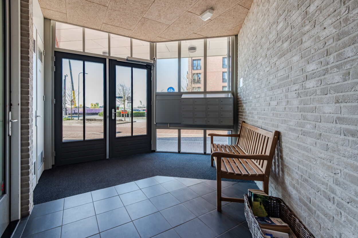 Het appartementencomplex is verzorgd en representatief, met een nette hoofdentree aan de voorzijde. Bij binnenkomst vindt u het bellentableau, de brievenbussen, het trappenhuis en de lift, waarmee u eenvoudig alle verdiepingen bereikt. Vanuit deze centrale ruimte is ook de berging toegankelijk. Voor bezoekers en bewoners is er in de directe omgeving voldoende parkeergelegenheid (vergunning via de gemeente Harderwijk).