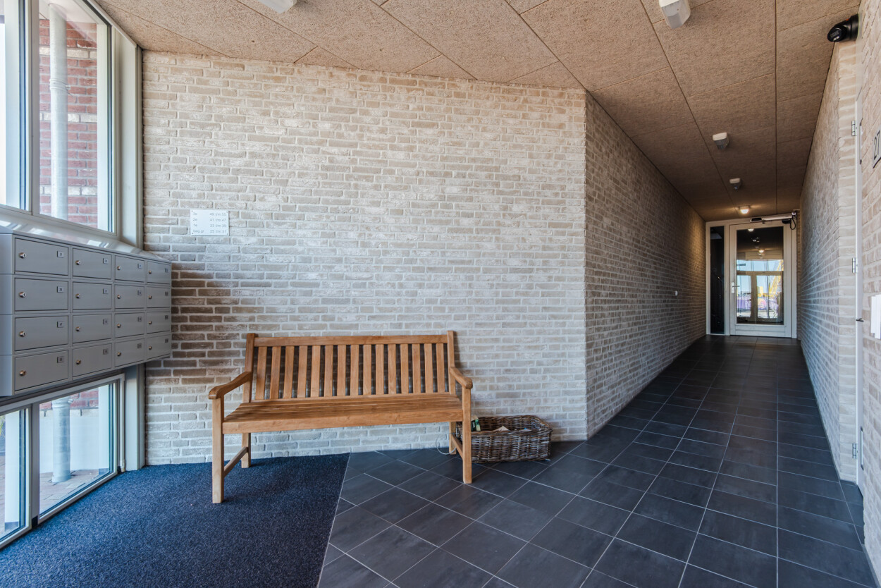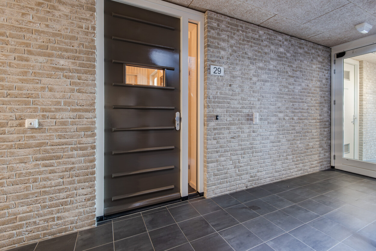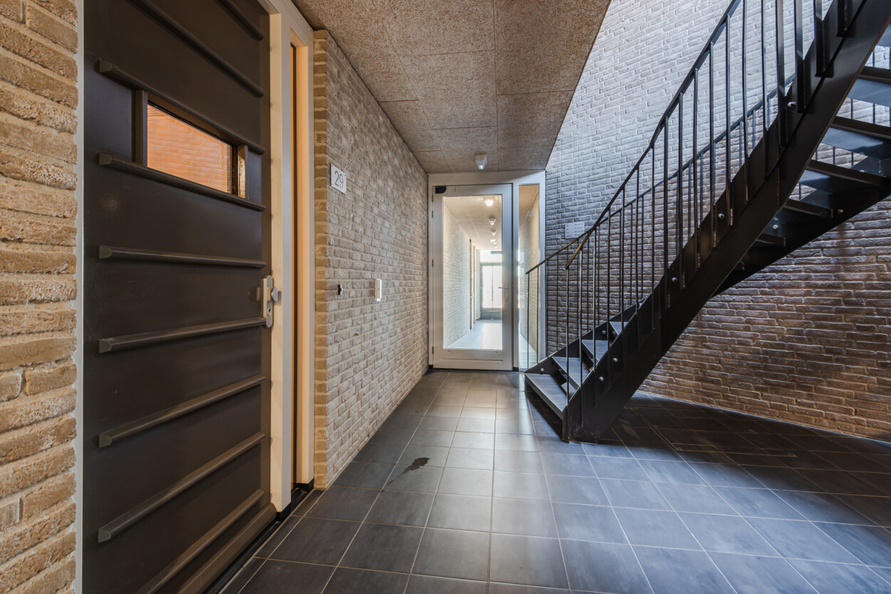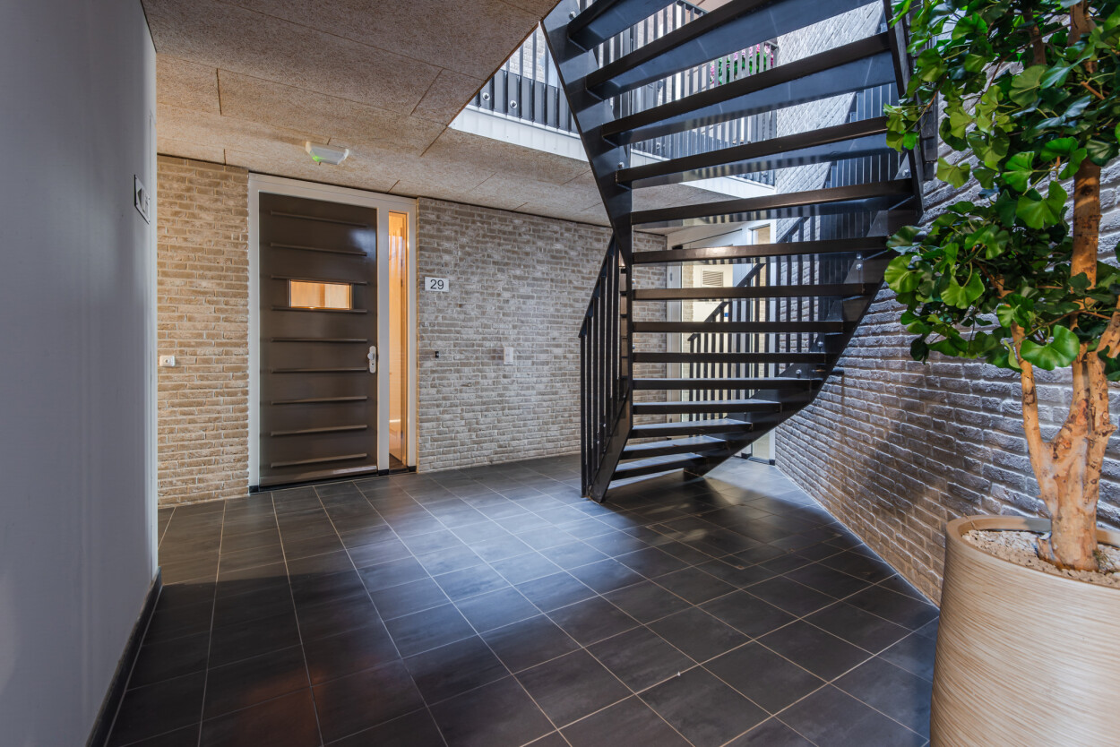Het appartementencomplex is verzorgd en representatief, met een nette hoofdentree aan de voorzijde. Bij binnenkomst vindt u het bellentableau, de brievenbussen, het trappenhuis en de lift, waarmee u eenvoudig alle verdiepingen bereikt. Vanuit deze centrale ruimte is ook de berging toegankelijk. Voor bezoekers en bewoners is er in de directe omgeving voldoende parkeergelegenheid (vergunning via de gemeente Harderwijk).