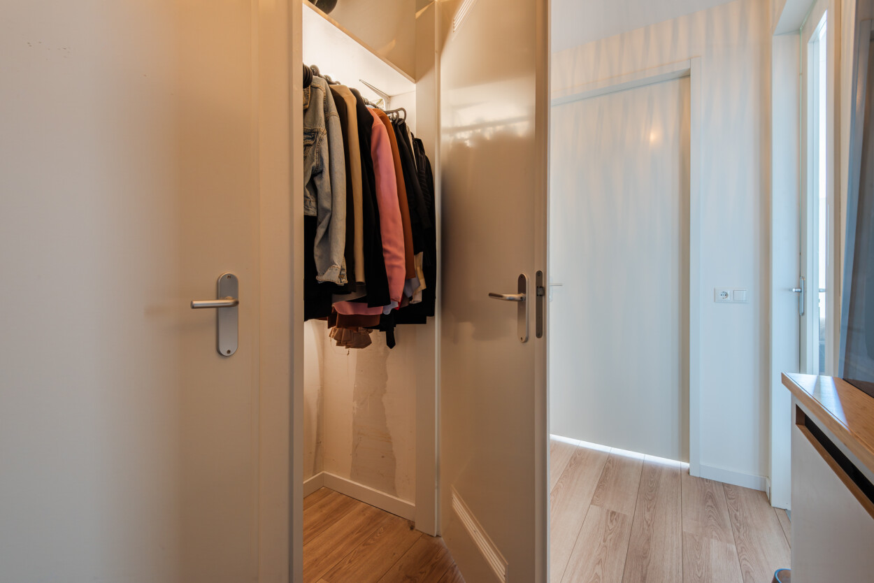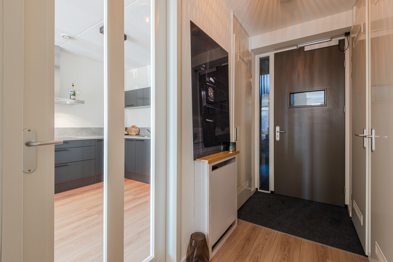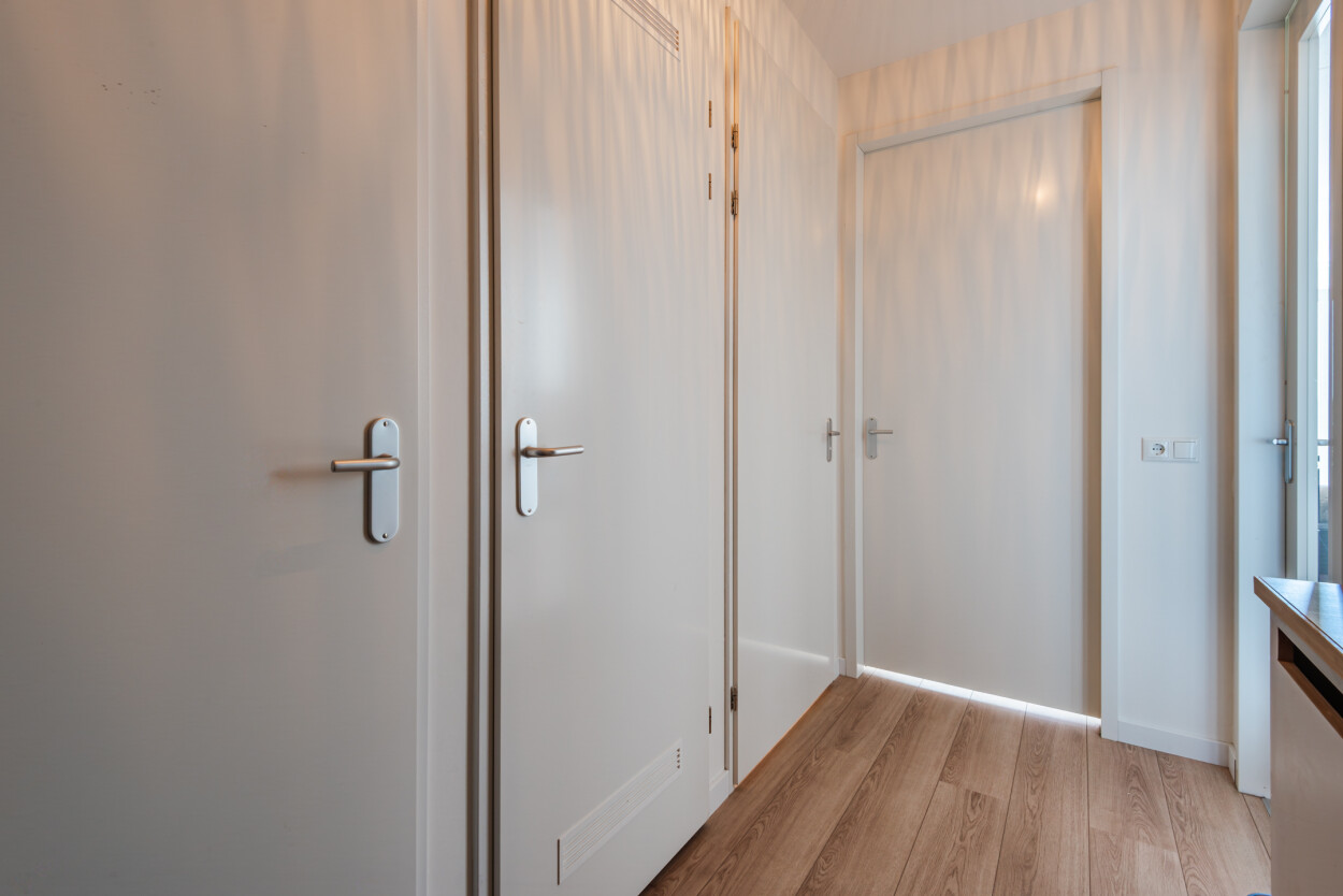 Bij binnenkomst van het appartement komt u in de hal, die als centrale ruimte toegang biedt tot alle vertrekken. Aan de rechterzijde vindt u de meterkast, aan de linkerkant de technische ruimte met WKO-installatie (huur) en extra kastruimte.