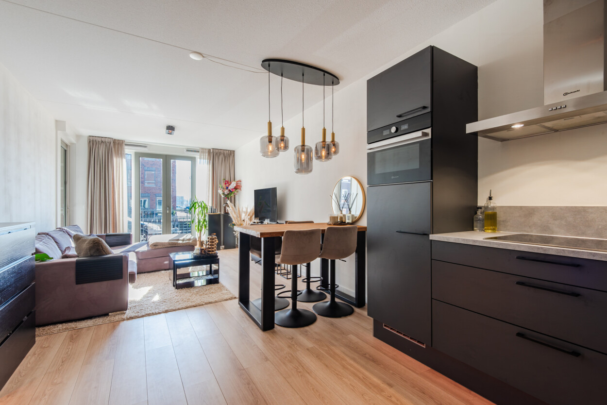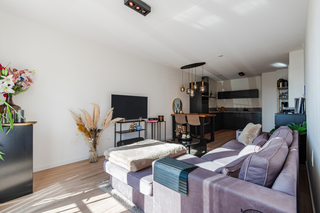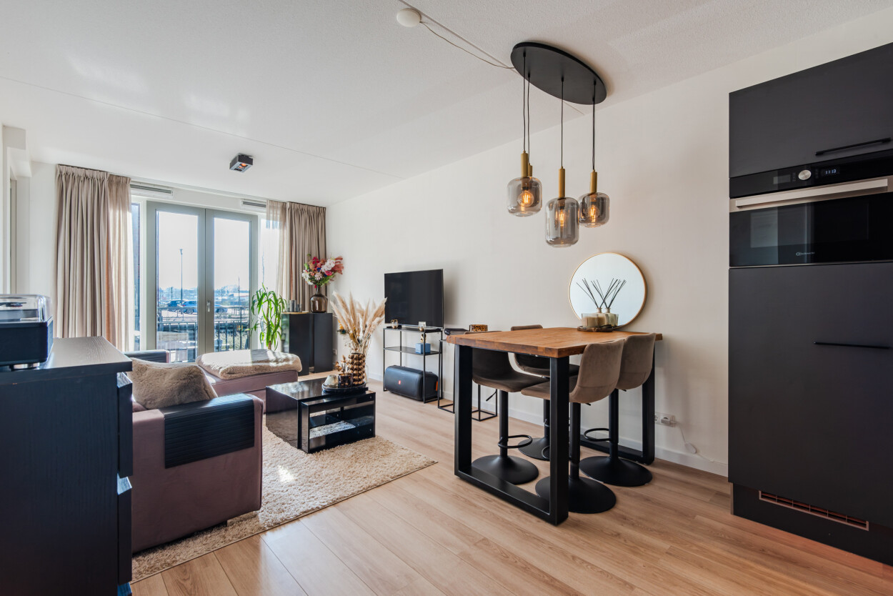 De moderne matzwarte hoekkeuken staat in open verbinding met de woonkamer en is van alle gemakken voorzien. Het woongedeelte ligt aan de voorzijde en is heerlijk licht door de grote raampartijen. Hier is voldoende ruimte voor een royale hoekbank, terwijl u ondertussen geniet van het prachtige uitzicht over het water. Vanuit de woonkamer loopt u direct het terras op, waardoor binnen en buiten naadloos in elkaar overlopen. Het appartement voelt ruim, licht en bijzonder comfortabel.