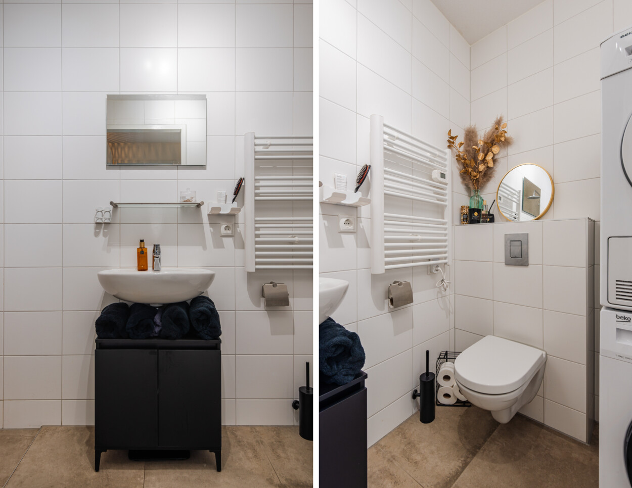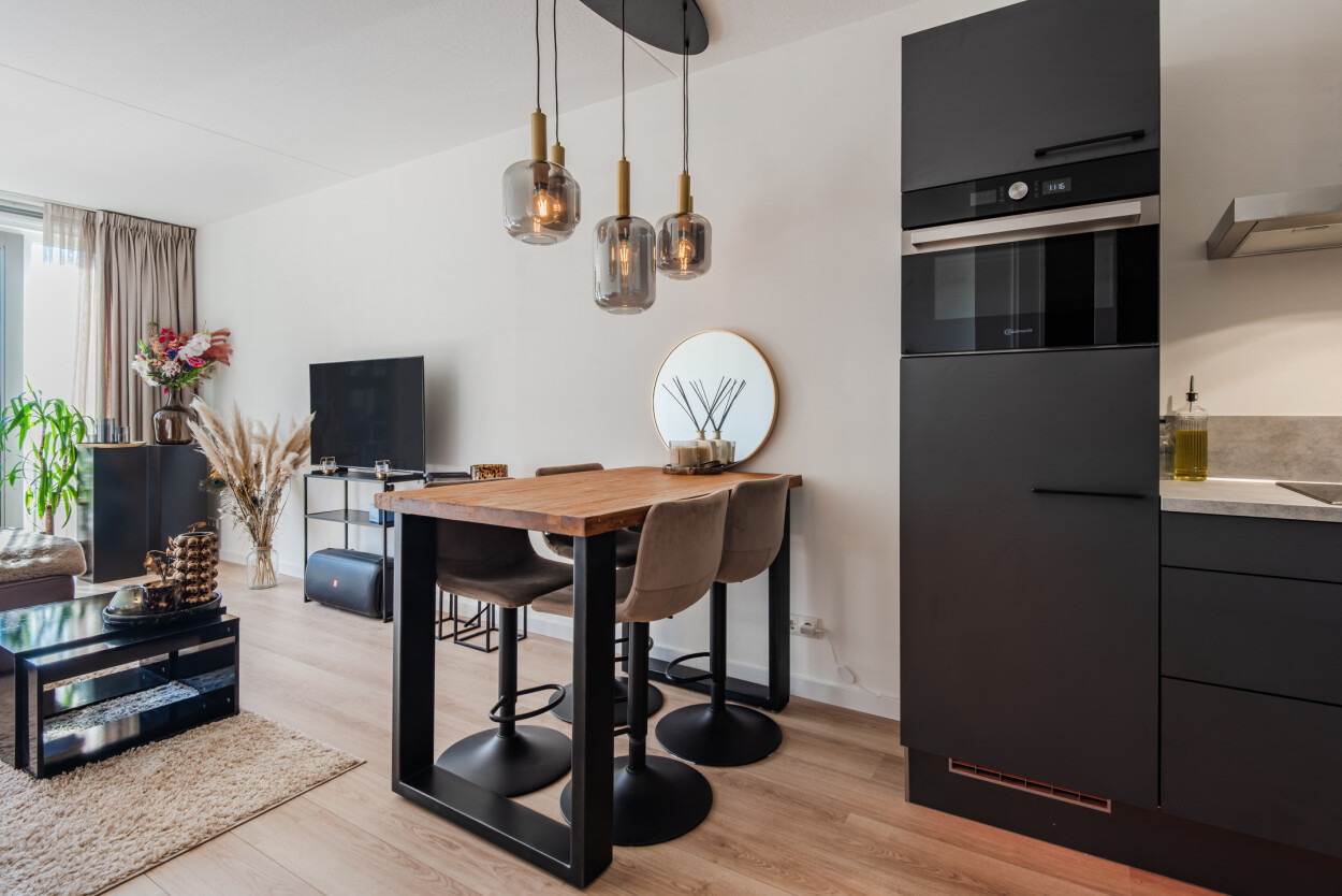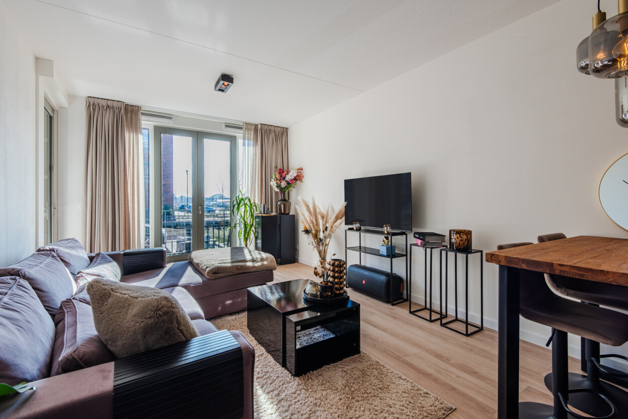 De moderne matzwarte hoekkeuken staat in open verbinding met de woonkamer en is van alle gemakken voorzien. Het woongedeelte ligt aan de voorzijde en is heerlijk licht door de grote raampartijen. Hier is voldoende ruimte voor een royale hoekbank, terwijl u ondertussen geniet van het prachtige uitzicht over het water. Vanuit de woonkamer loopt u direct het terras op, waardoor binnen en buiten naadloos in elkaar overlopen. Het appartement voelt ruim, licht en bijzonder comfortabel.