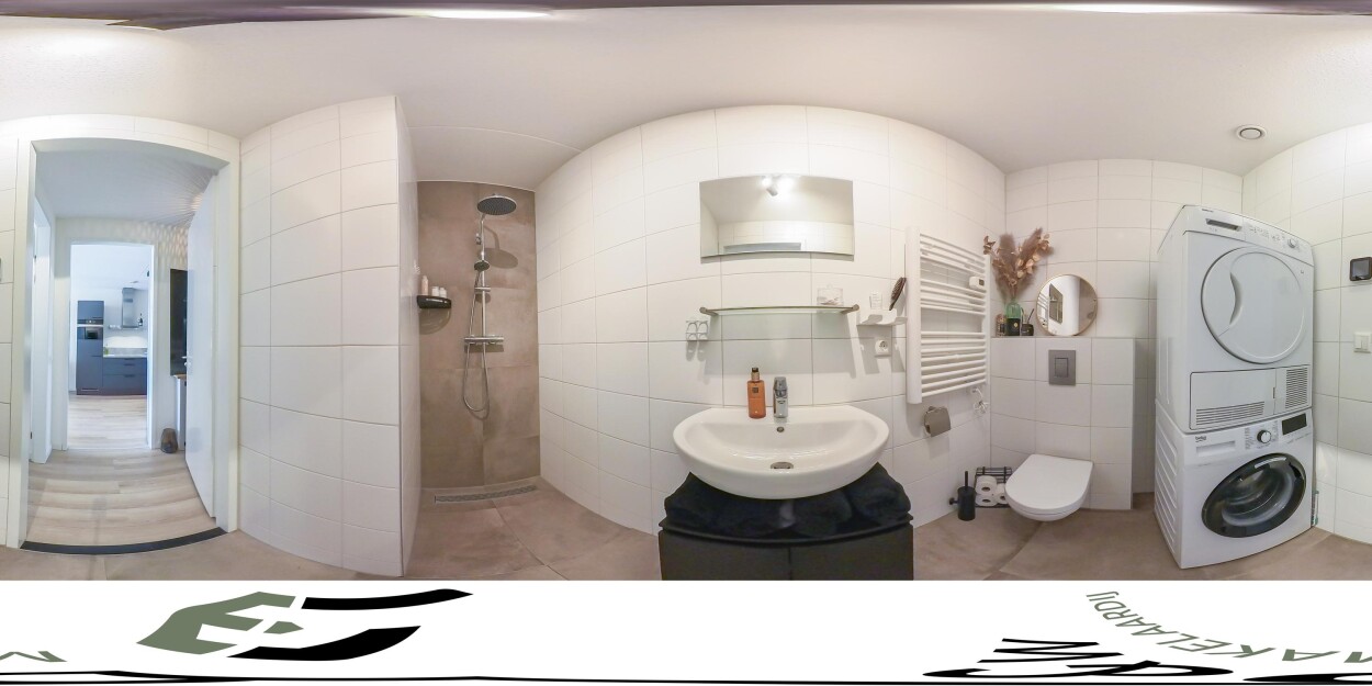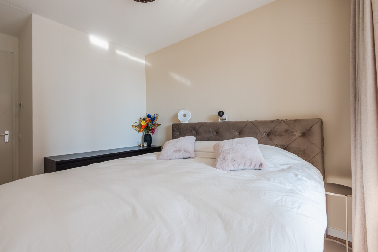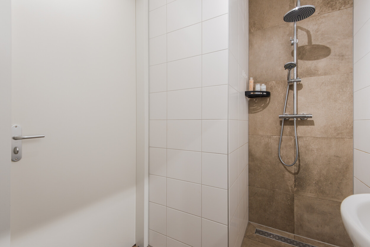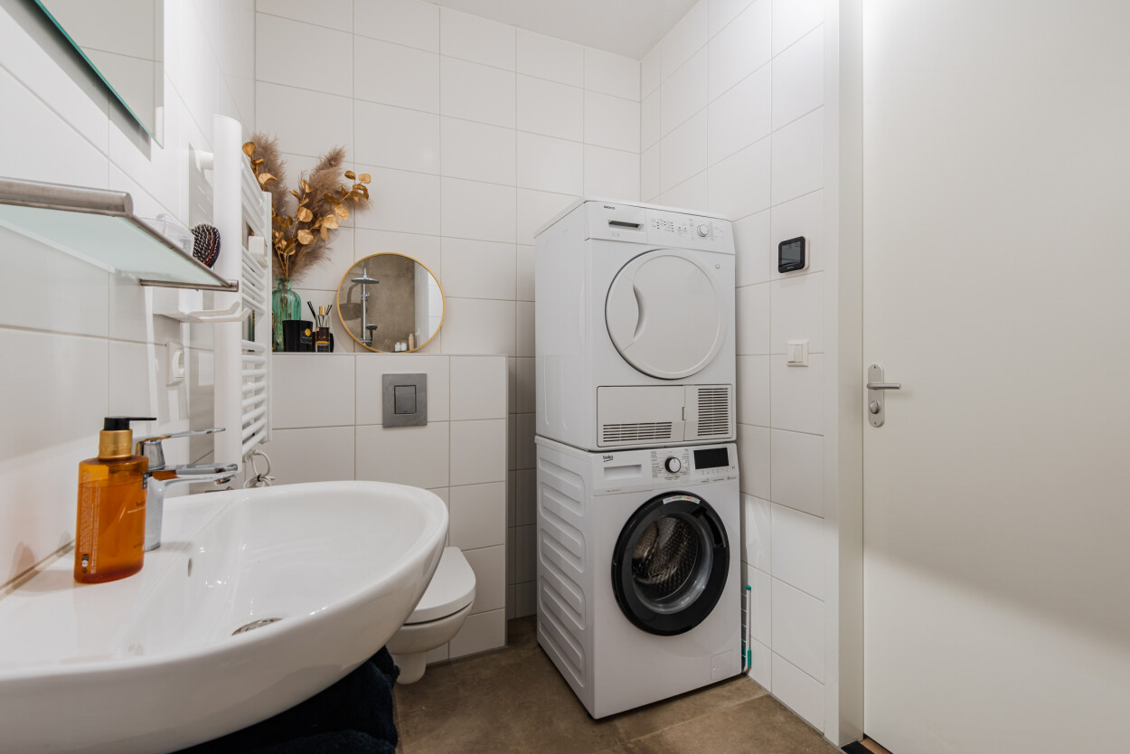 De badkamer is modern en praktisch ingericht met een inloopdouche, wastafelmeubel, toilet en aansluiting voor de wasmachine. De slaapkamer bevindt zich eveneens aan de voorzijde en is licht en prettig van formaat.