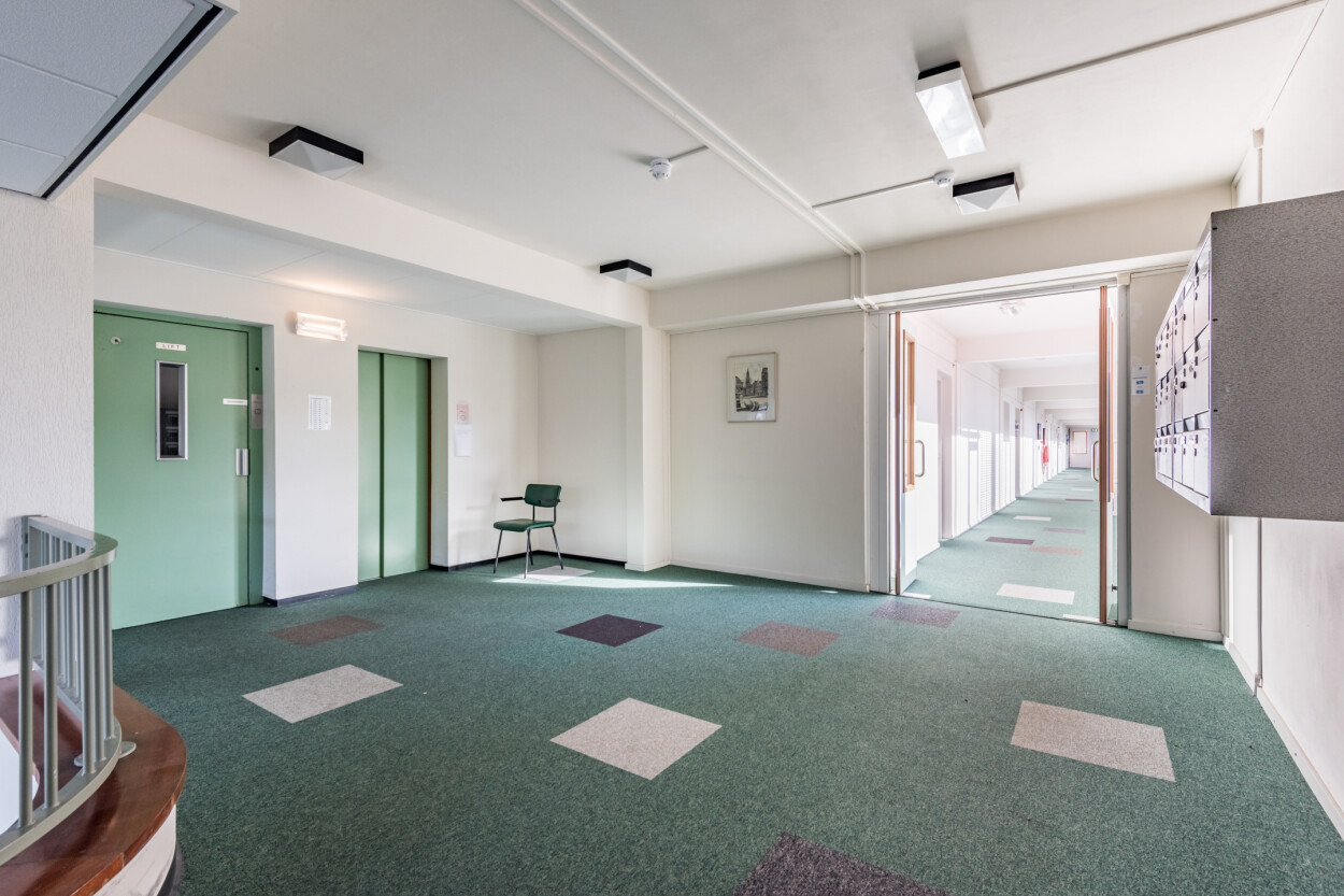 Entree met intercom, ontvangstruimte, trappenhuis en lift.