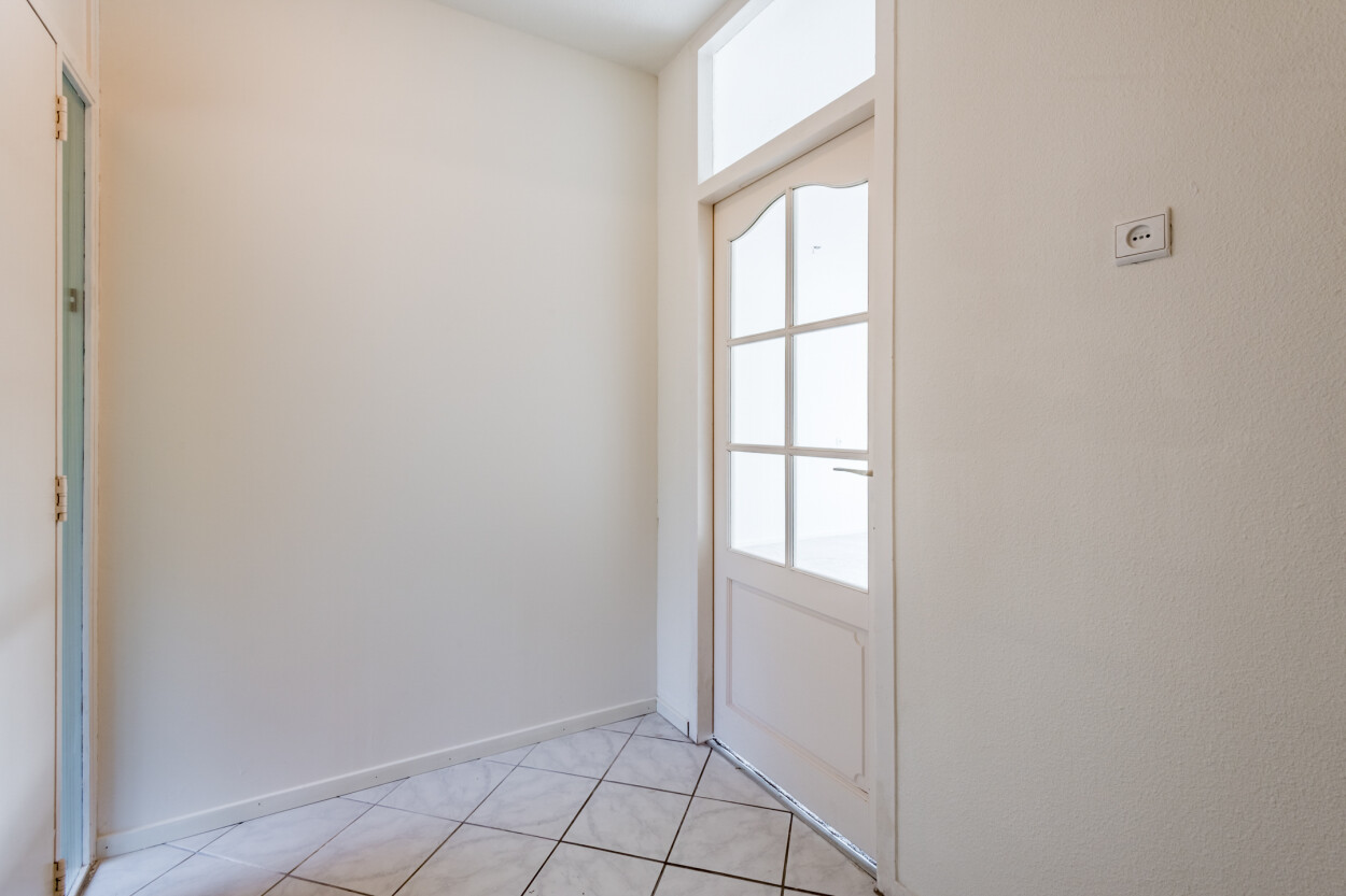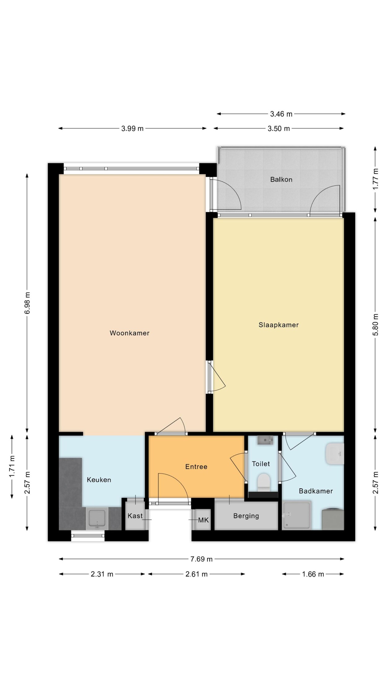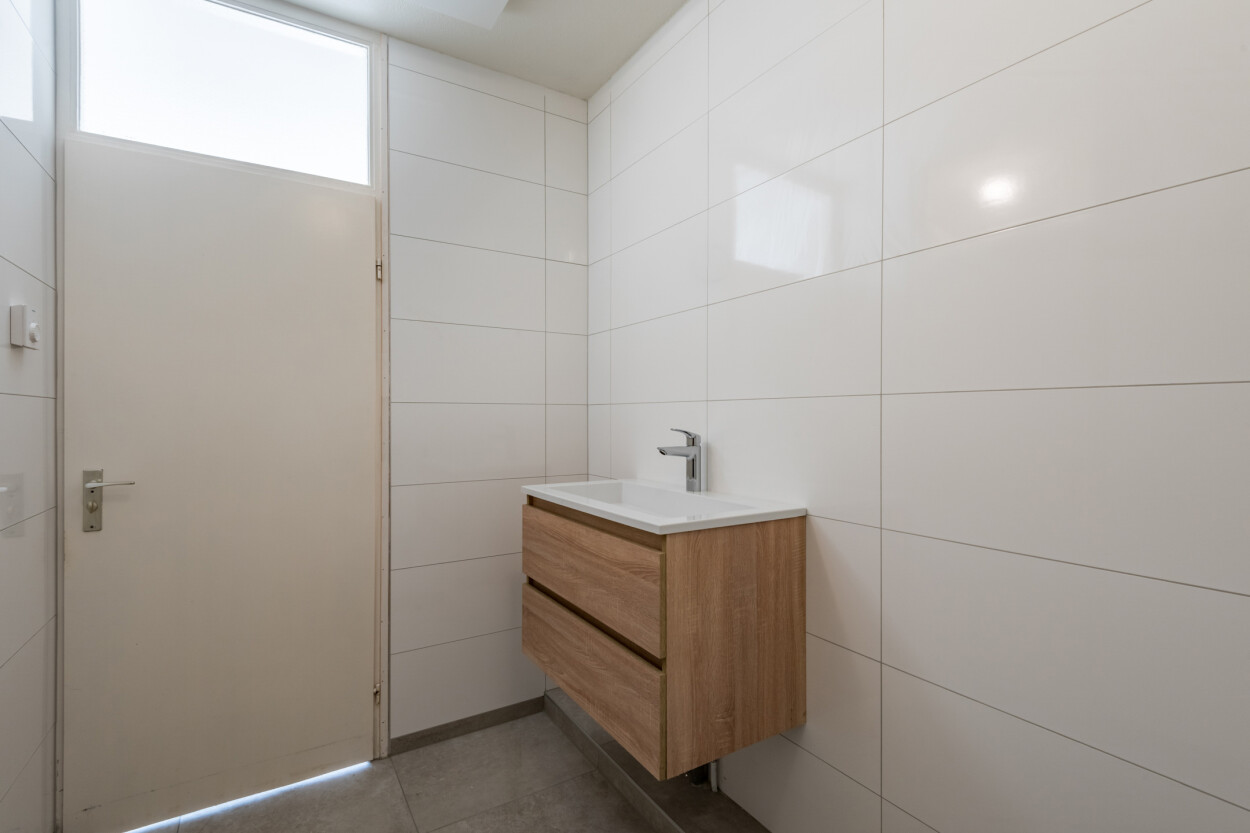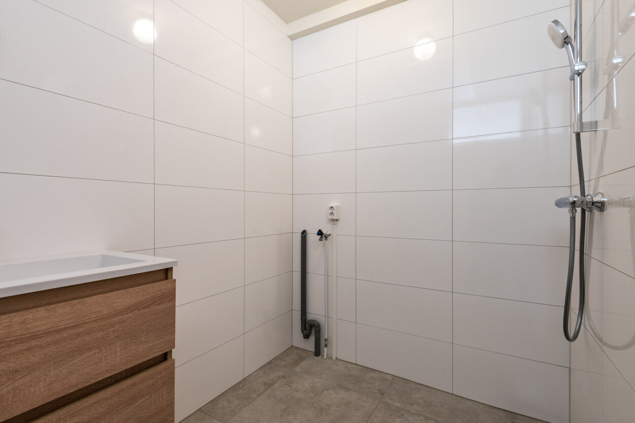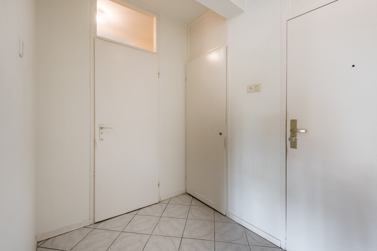 Entree van het appartement, meterkast, hal met bergruimte en garderobe, separaat toilet met fonteintje, lichte woonkamer met deur naar het balkon, open keuken, grote slaapkamer met deur naar het balkon en directe toegang tot de badkamer. De badkamer is uitgerust met een douchecabine, wastafel, wasmachineaansluiting en heeft tevens toegang tot een separaat toilet.