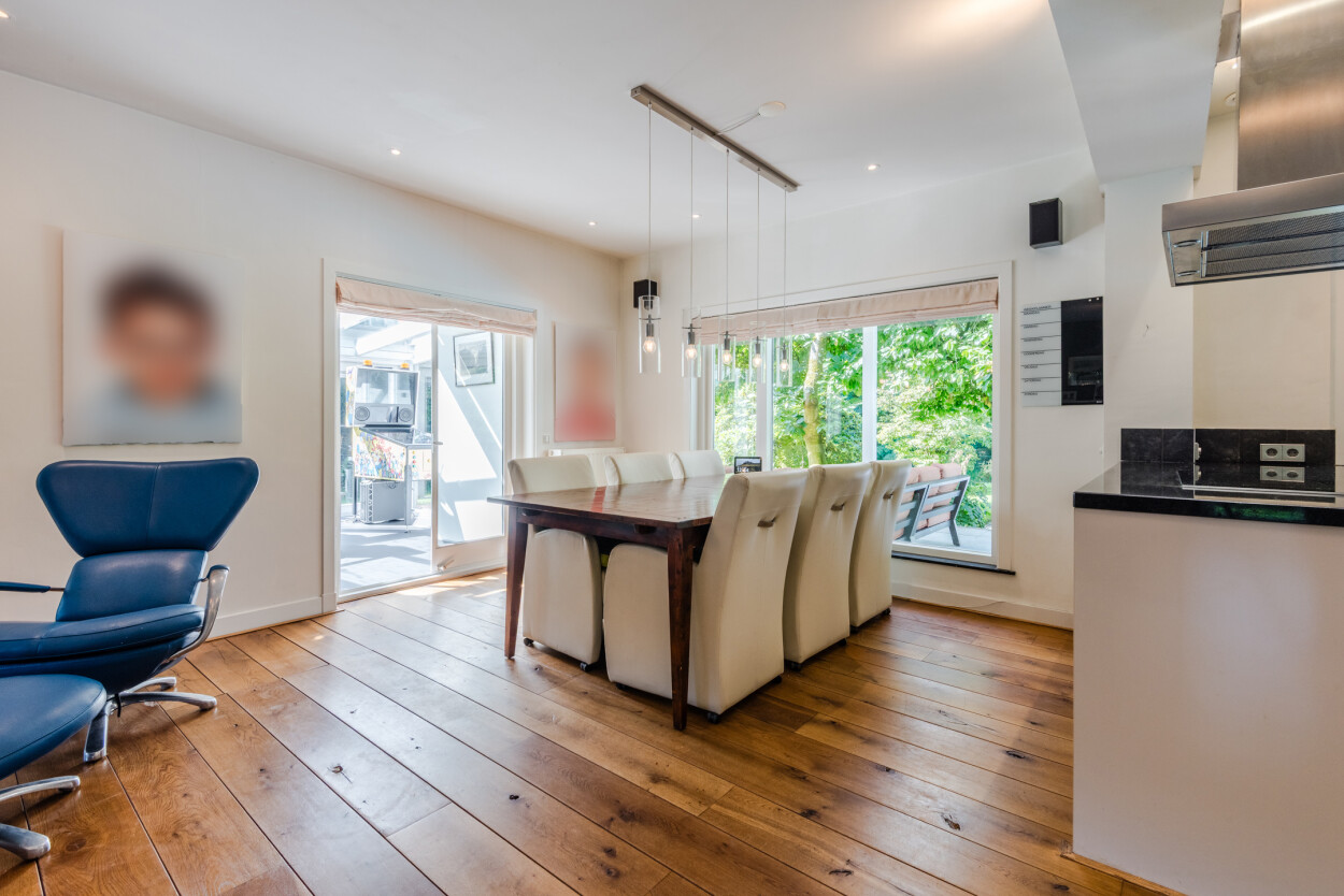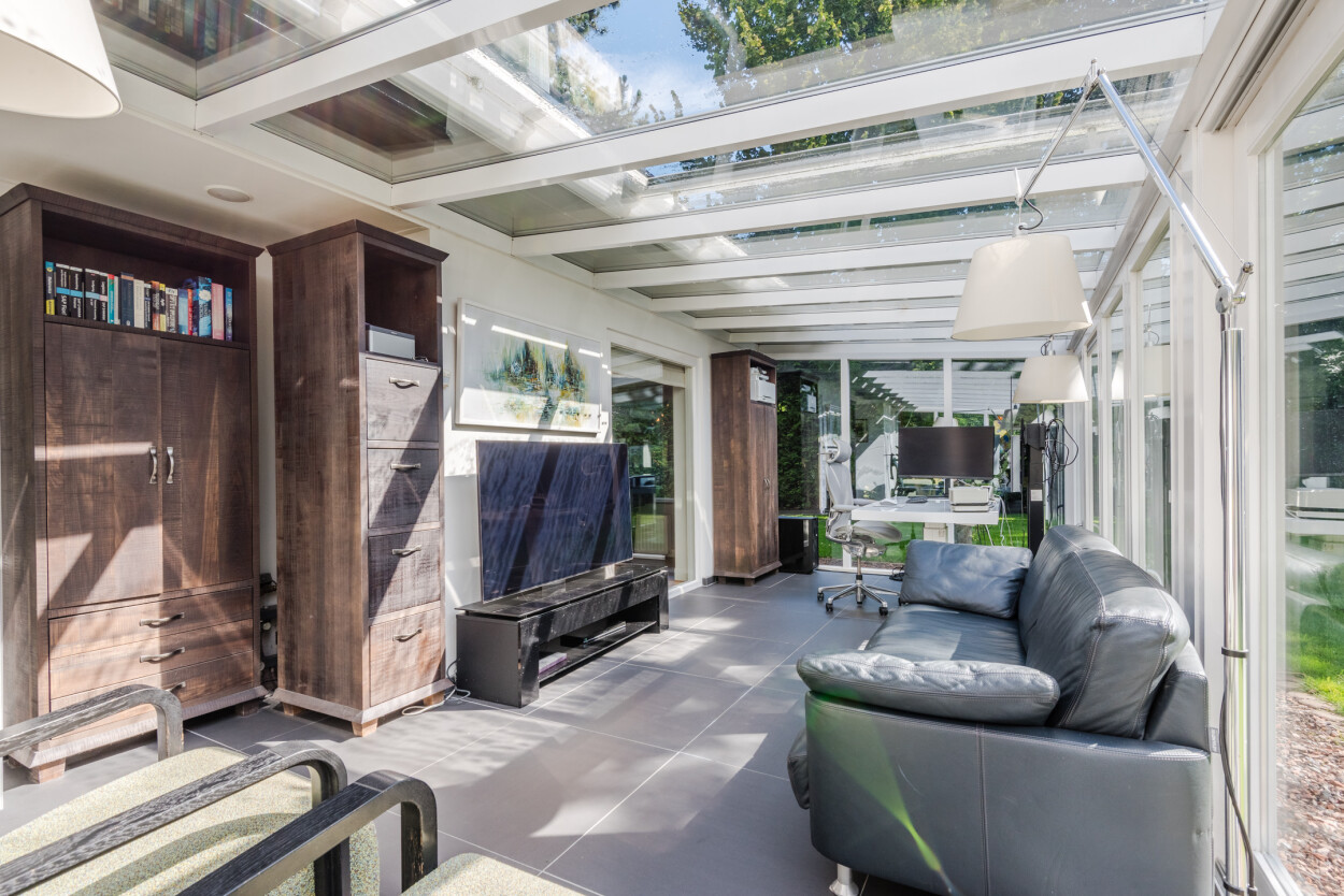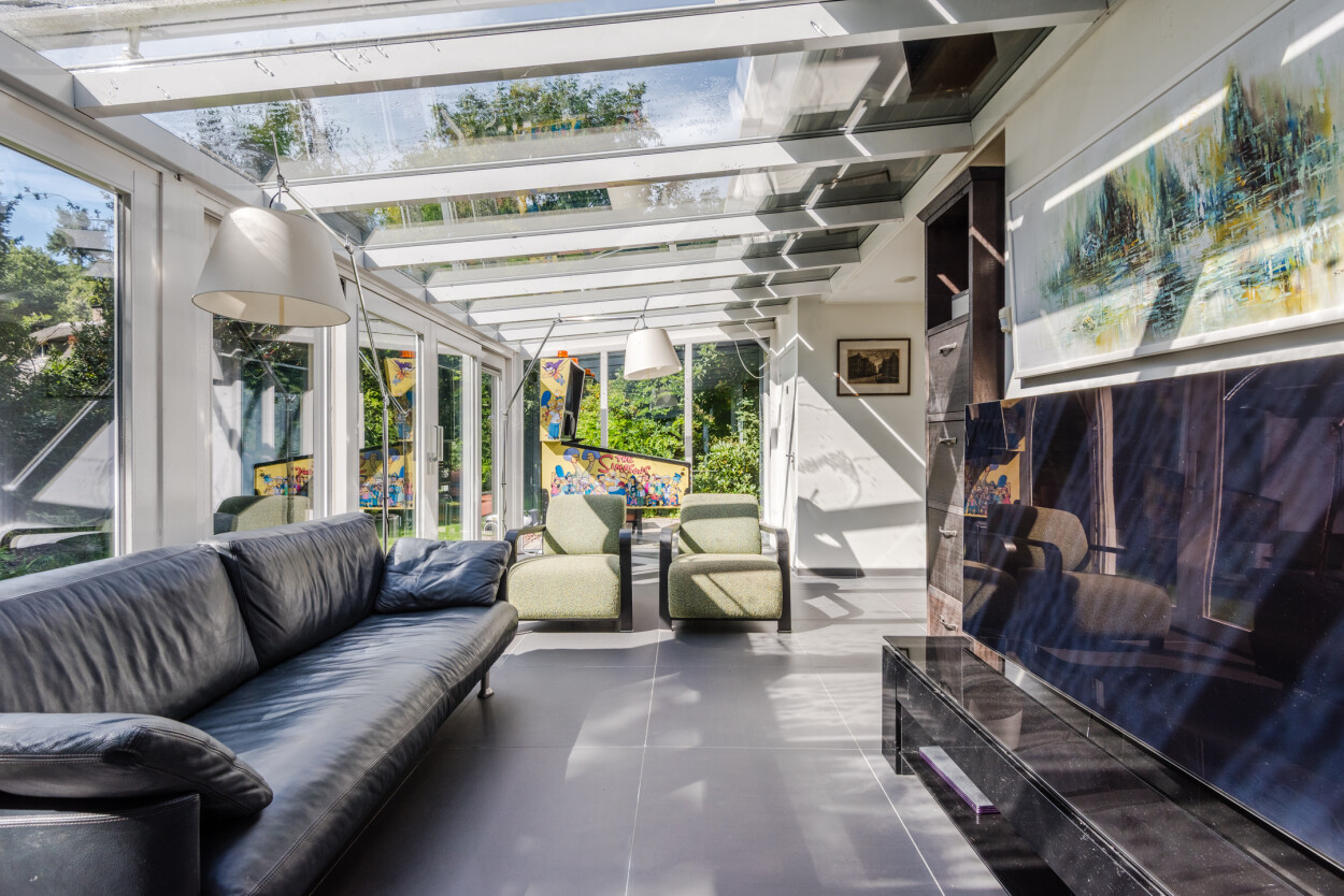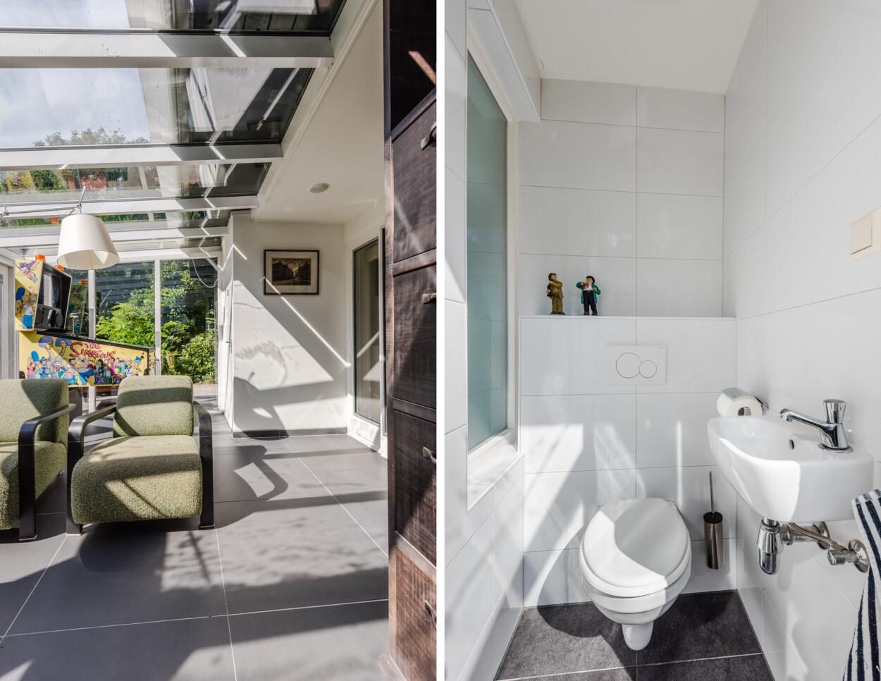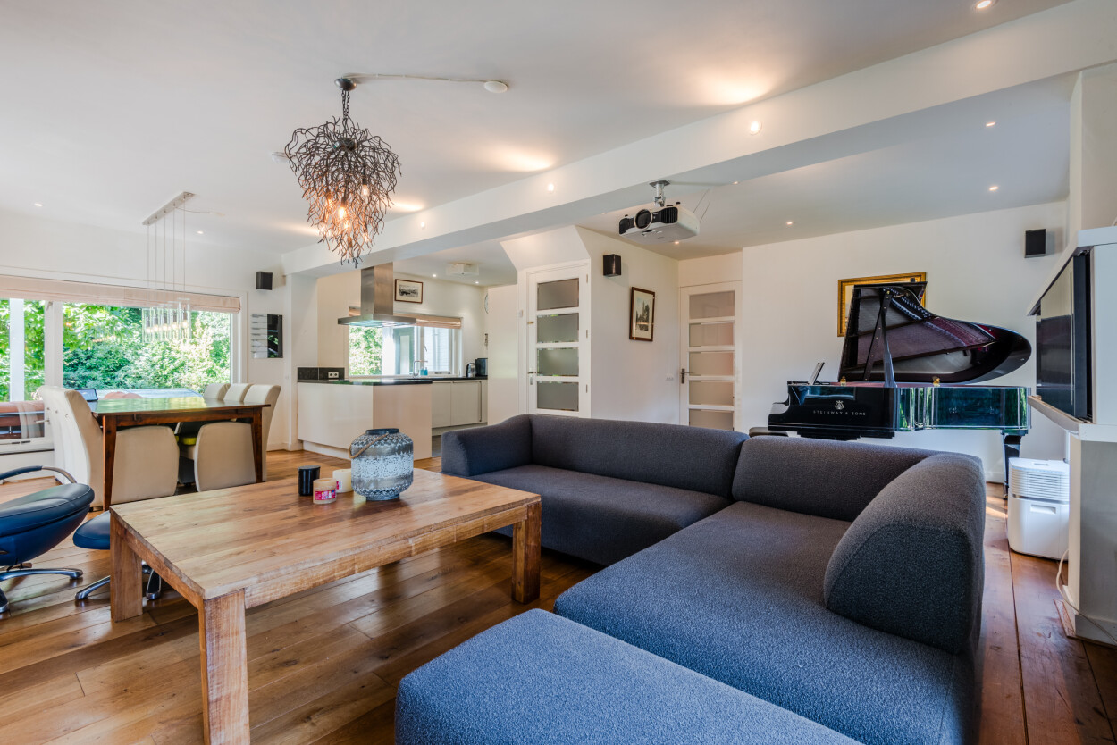 Via de entree met trapopgang en toilet komt u in de royale woonkamer. Dankzij de brede raampartijen is het hier heerlijk licht en heeft u een prachtig uitzicht op de tuin. De aangrenzende serre vormt een sfeervol verlengstuk van de leefruimte en laat u het hele jaar door genieten van de omgeving.