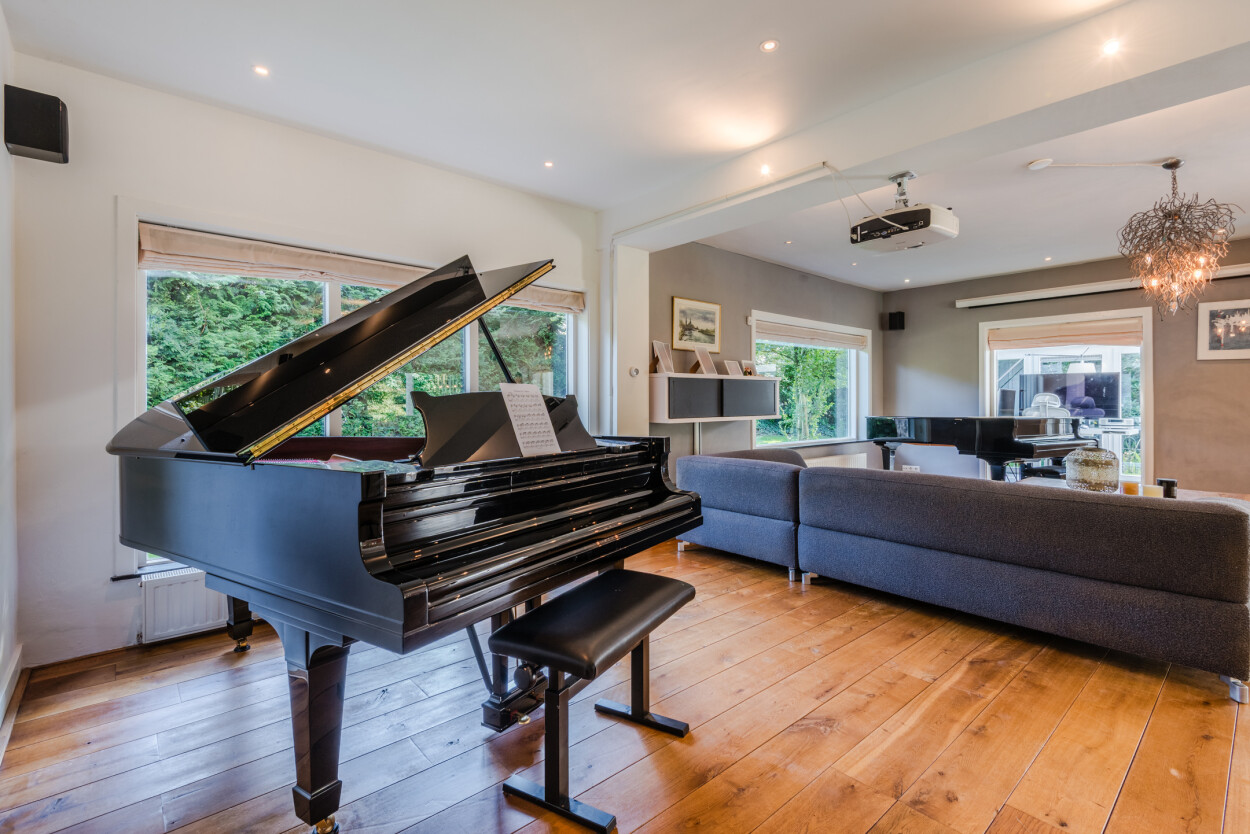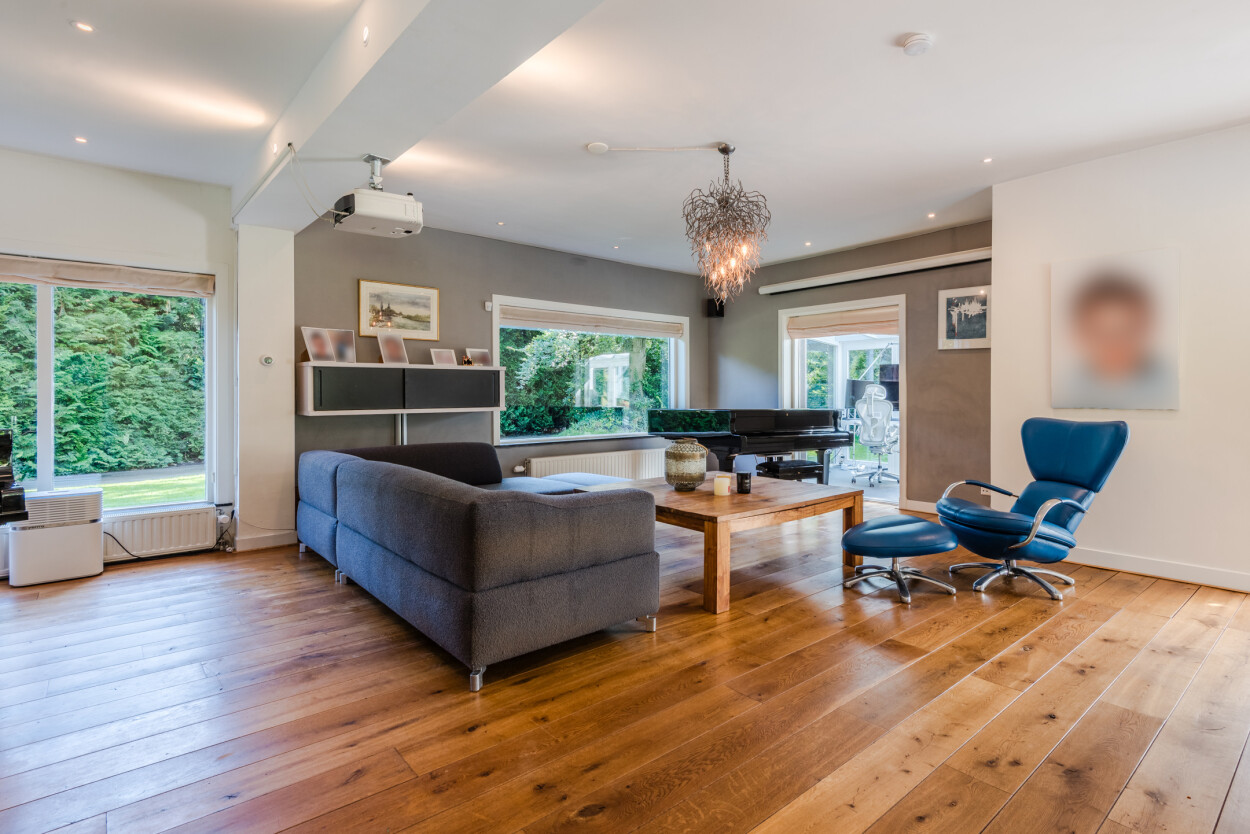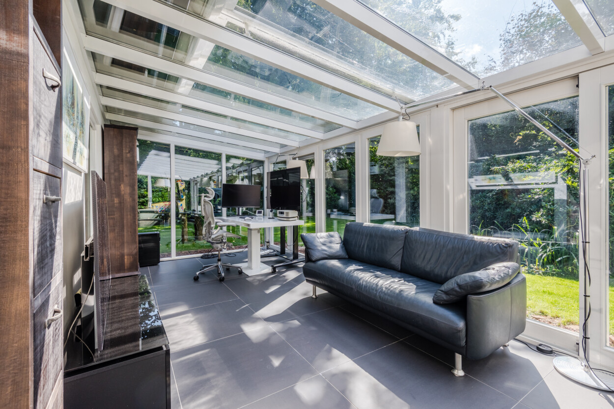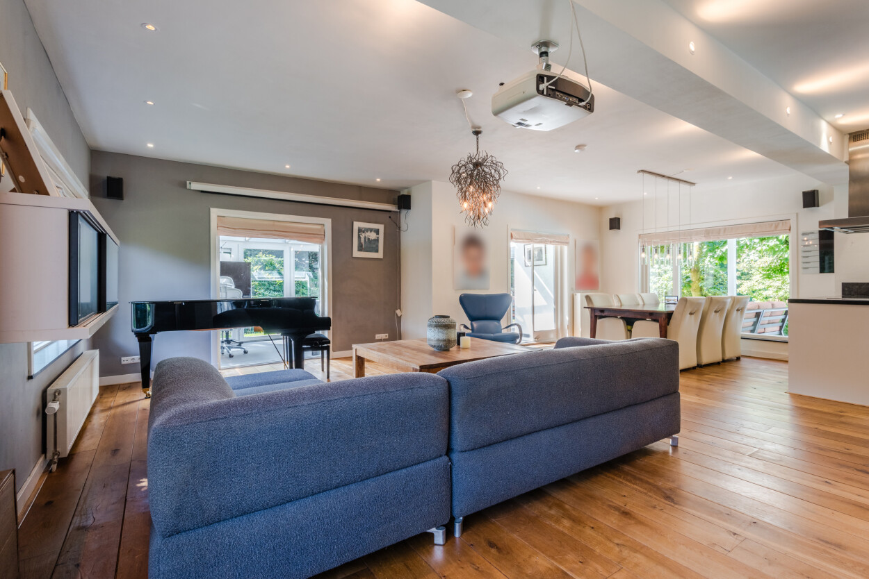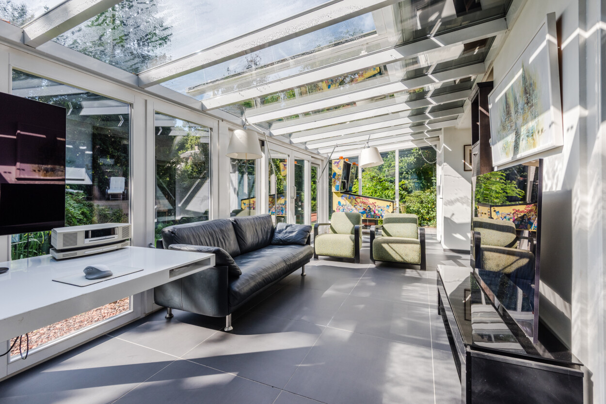 Via de entree met trapopgang en toilet komt u in de royale woonkamer. Dankzij de brede raampartijen is het hier heerlijk licht en heeft u een prachtig uitzicht op de tuin. De aangrenzende serre vormt een sfeervol verlengstuk van de leefruimte en laat u het hele jaar door genieten van de omgeving.