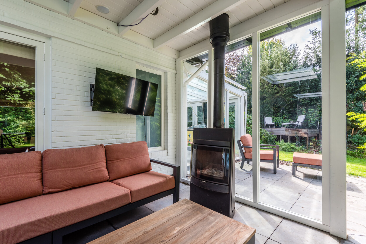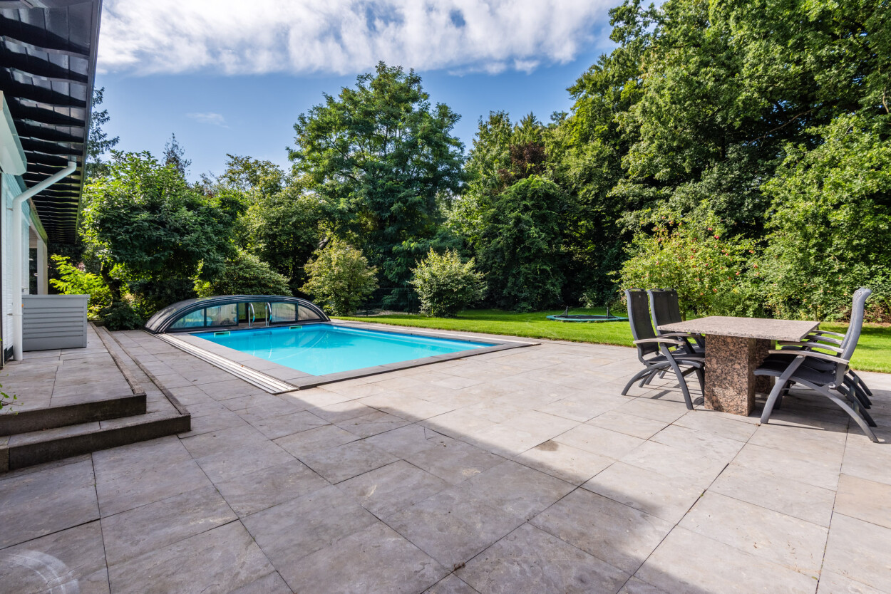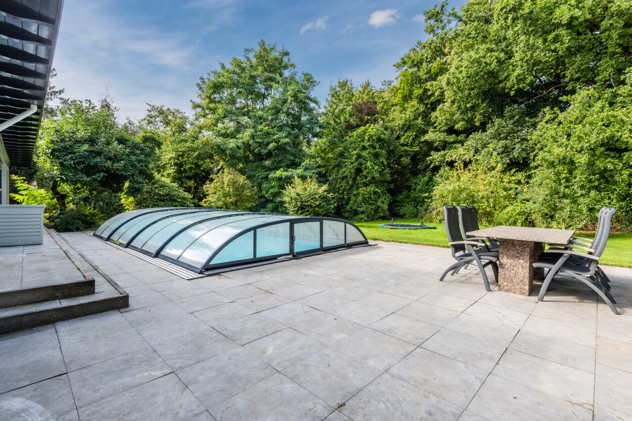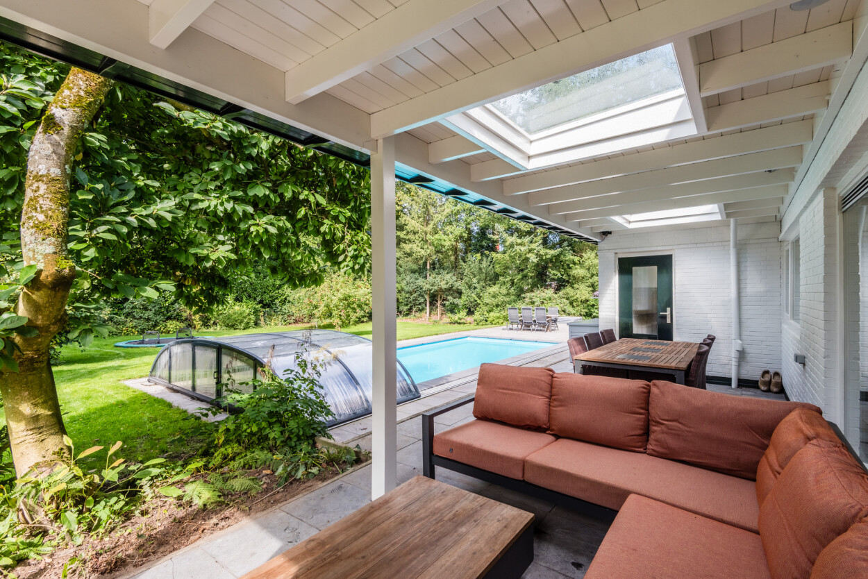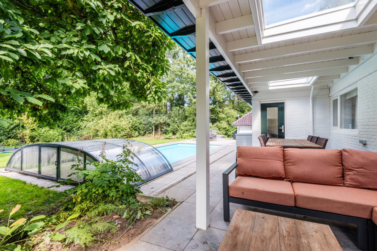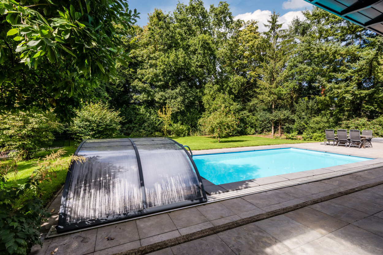 Aan de woning grenst een sfeervolle veranda met houtkachel, een heerlijke plek om het hele jaar door buiten te zitten. Verder is er een royaal verwarmd zwembad met jetstreamer en afschuifbare overkapping, omsloten door een fraai gazon met beplantingen en volwassen bomen. Dankzij de groene omzoming geniet u hier van volledige privacy en beschutting – absoluut geen inkijk, enkel rust en natuur.