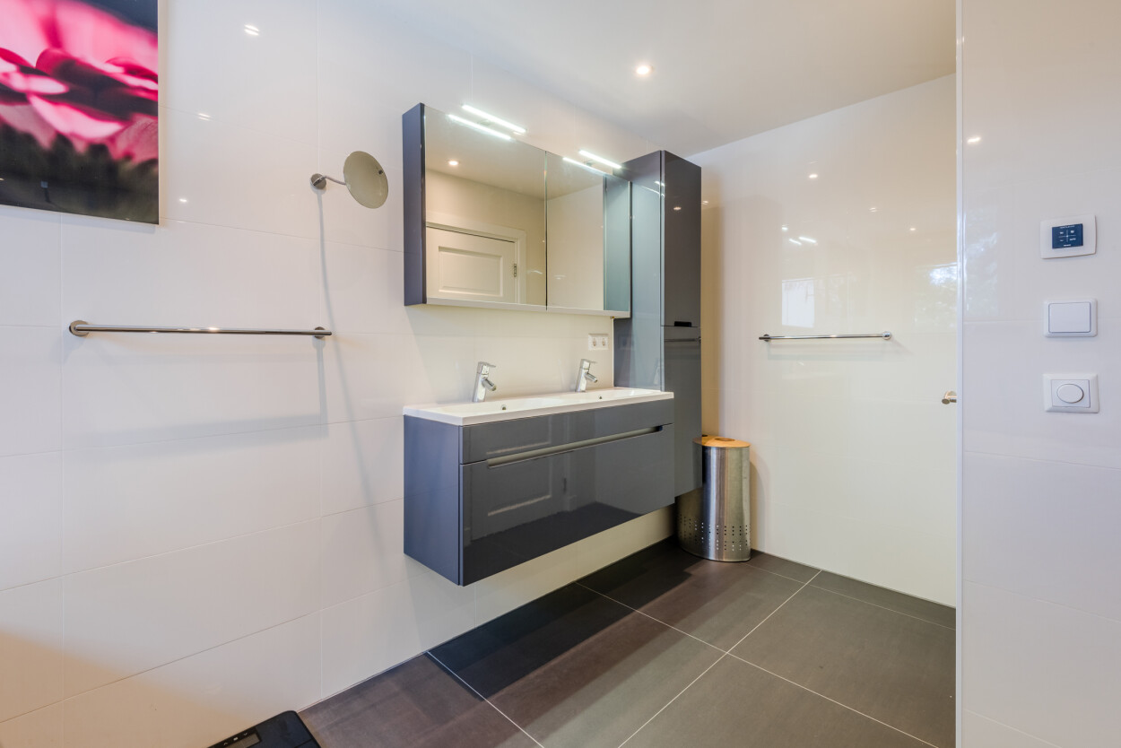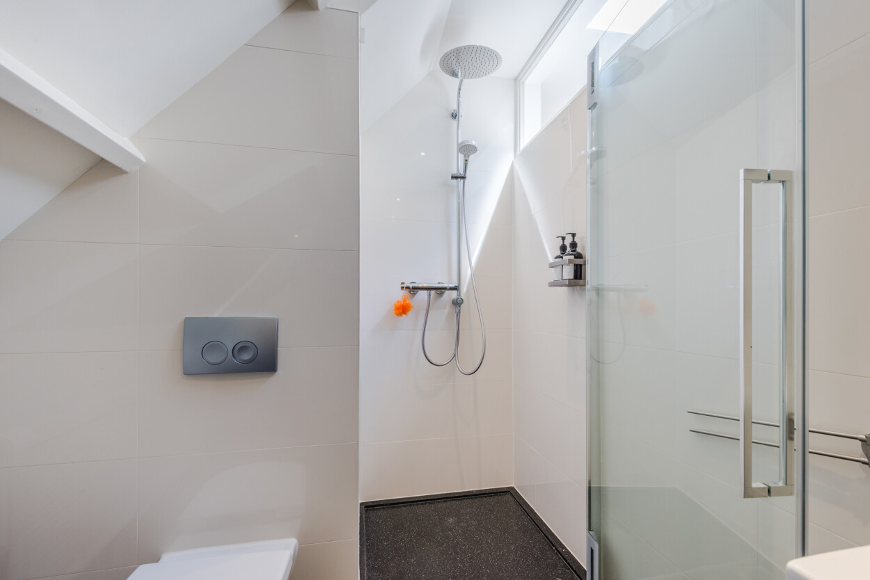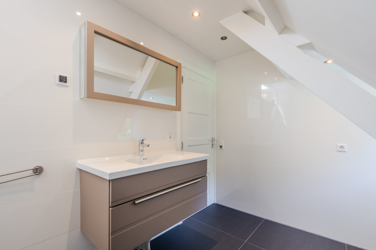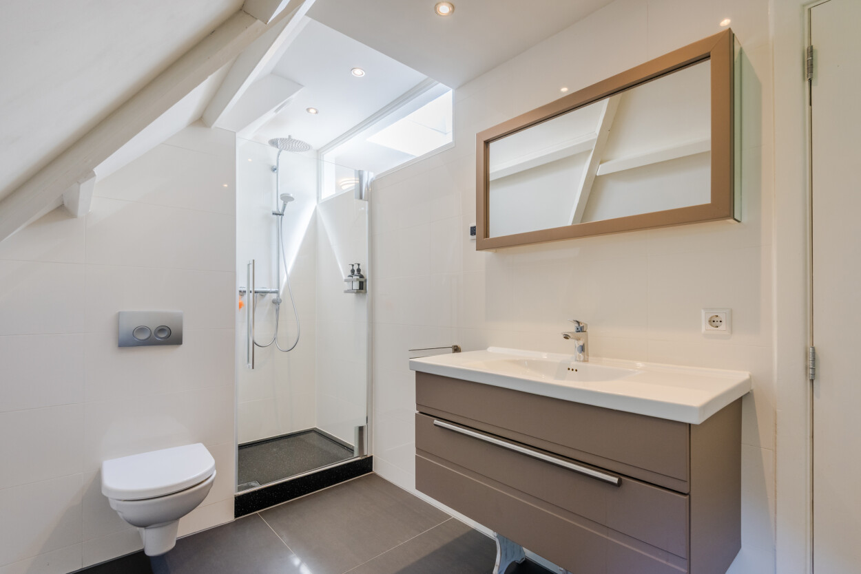 Centraal ligt de badkamer, bereikbaar vanaf de overloop. Deze is uitgerust met douche, wastafel en toilet. Door het raam aan de overloopzijde valt er prettig daglicht binnen, wat zorgt voor een frisse en open uitstraling. Met volop bergruimte achter de knieschotten is de verdieping niet alleen ruim, maar ook functioneel ingericht.