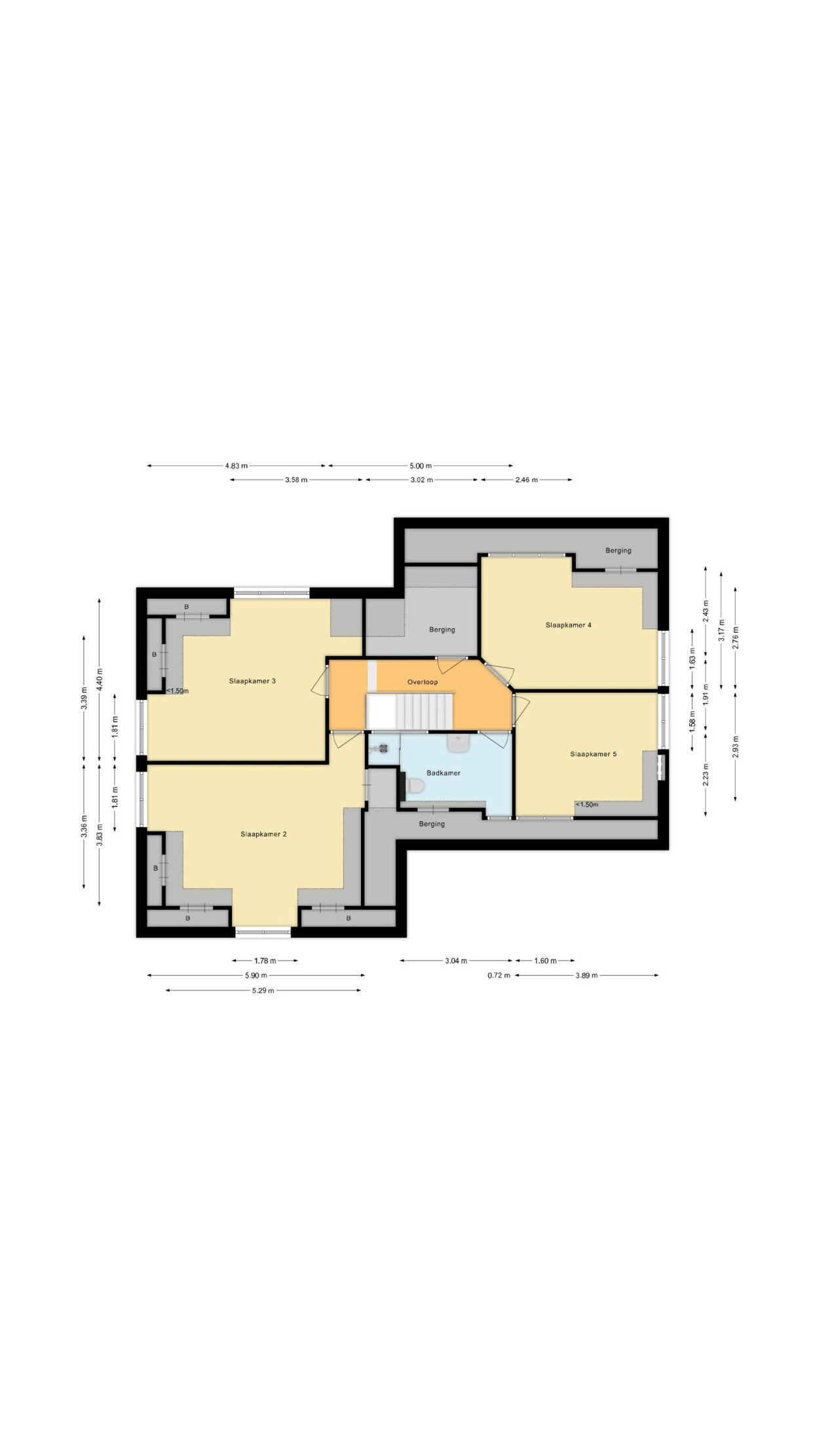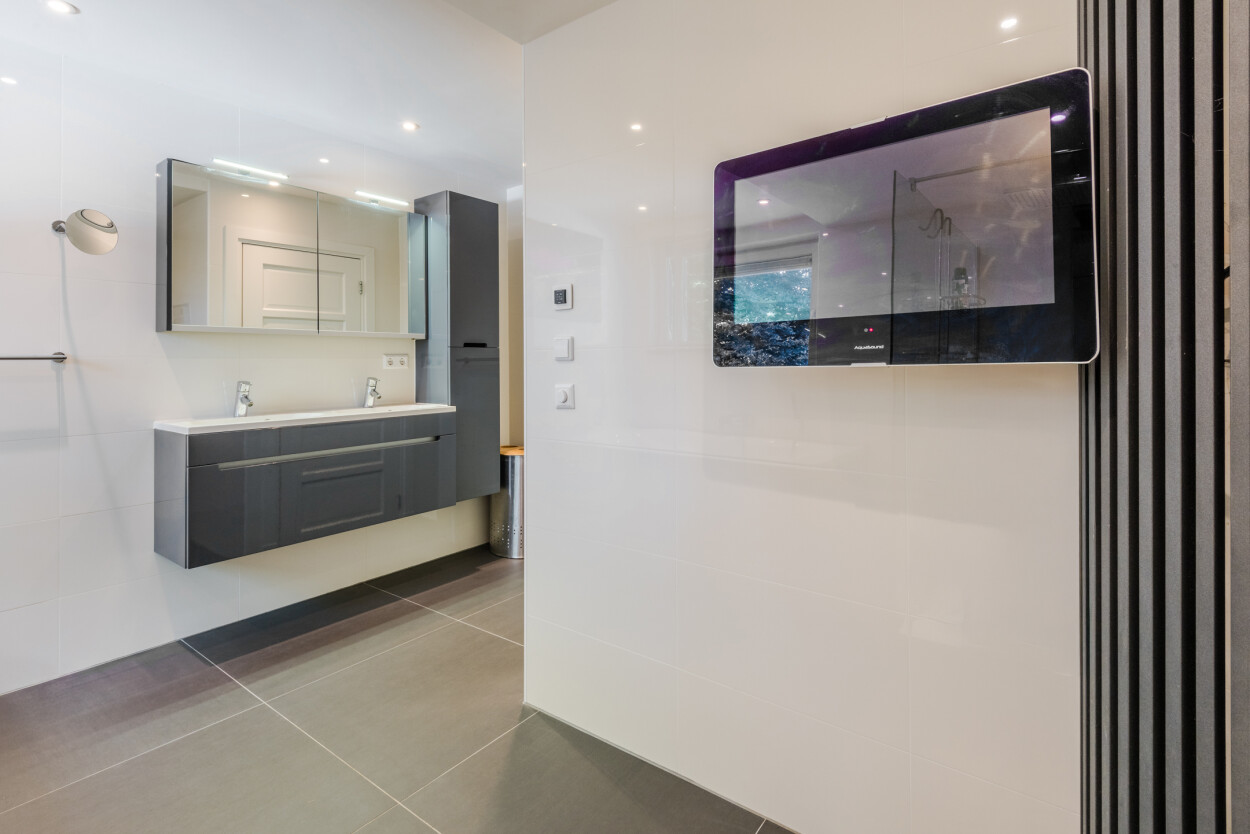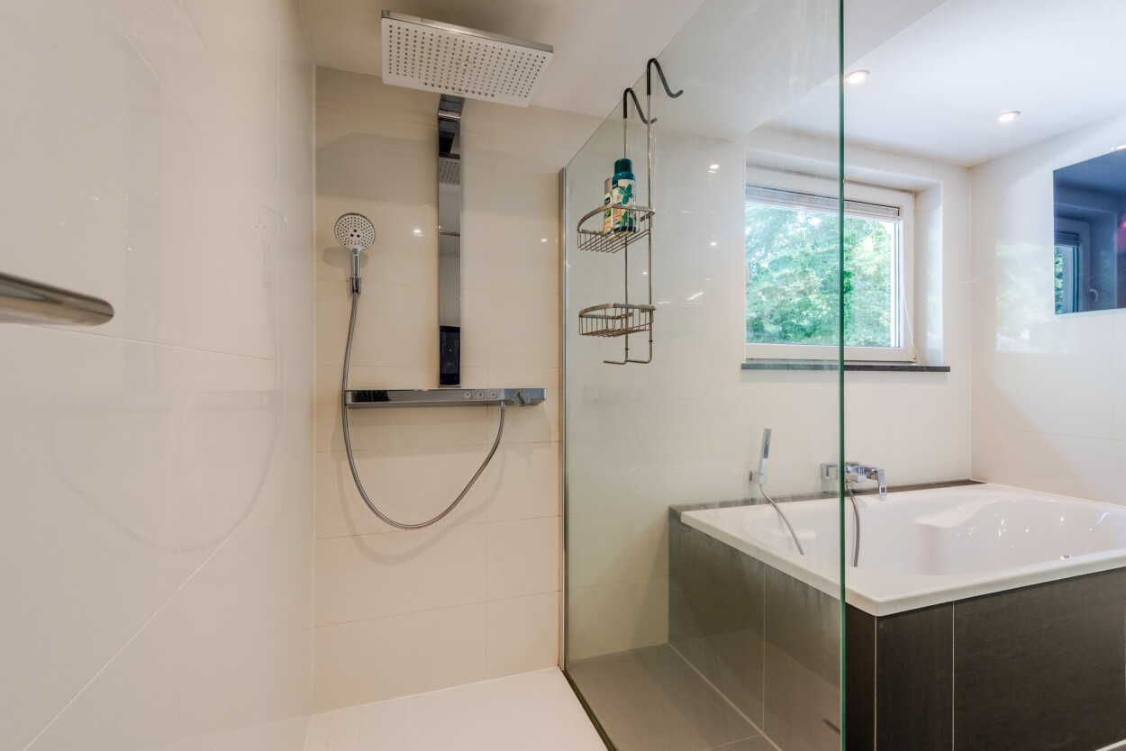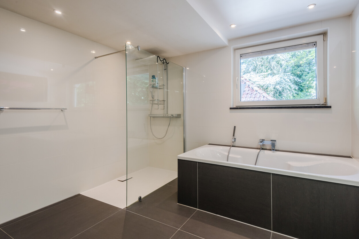 Centraal ligt de badkamer, bereikbaar vanaf de overloop. Deze is uitgerust met douche, wastafel en toilet. Door het raam aan de overloopzijde valt er prettig daglicht binnen, wat zorgt voor een frisse en open uitstraling. Met volop bergruimte achter de knieschotten is de verdieping niet alleen ruim, maar ook functioneel ingericht.