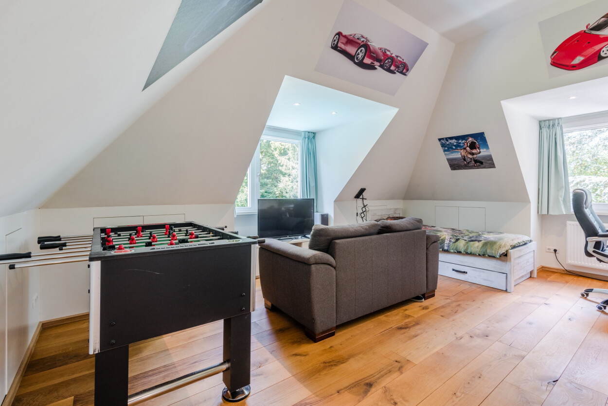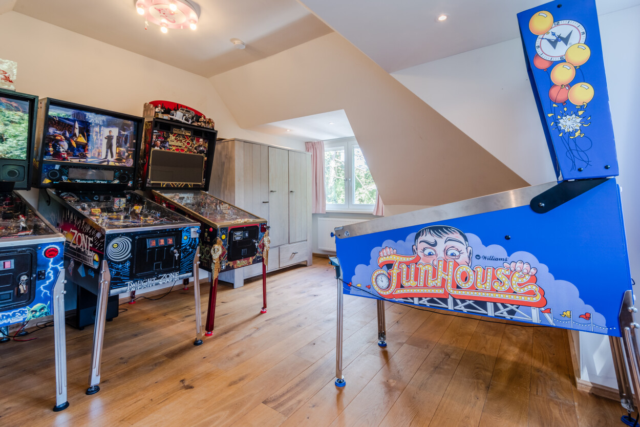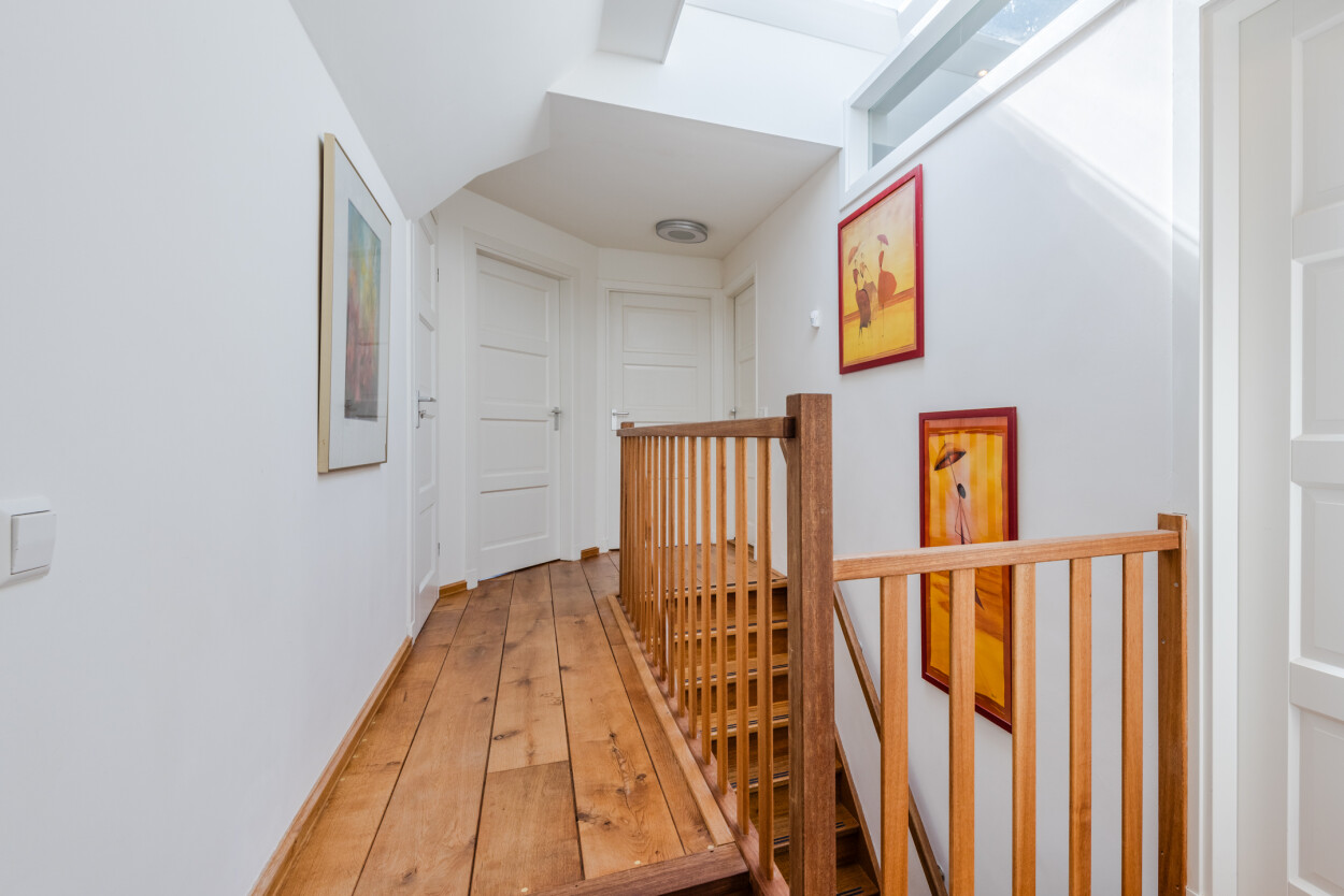 Stap binnen in de royale woonkamer met eikenhouten vloer, een stijlvolle afwerking die in alle vijf slaapkamers is doorgevoerd. De woning beschikt bovendien over twee badkamers, waarvan één op de begane grond samen met een slaapkamer. Ideaal om gelijkvloers te wonen of gasten comfortabel onder te brengen. De centrale dakkoepel op de verdieping zorgt voor een zee van licht en een open, luchtige sfeer.