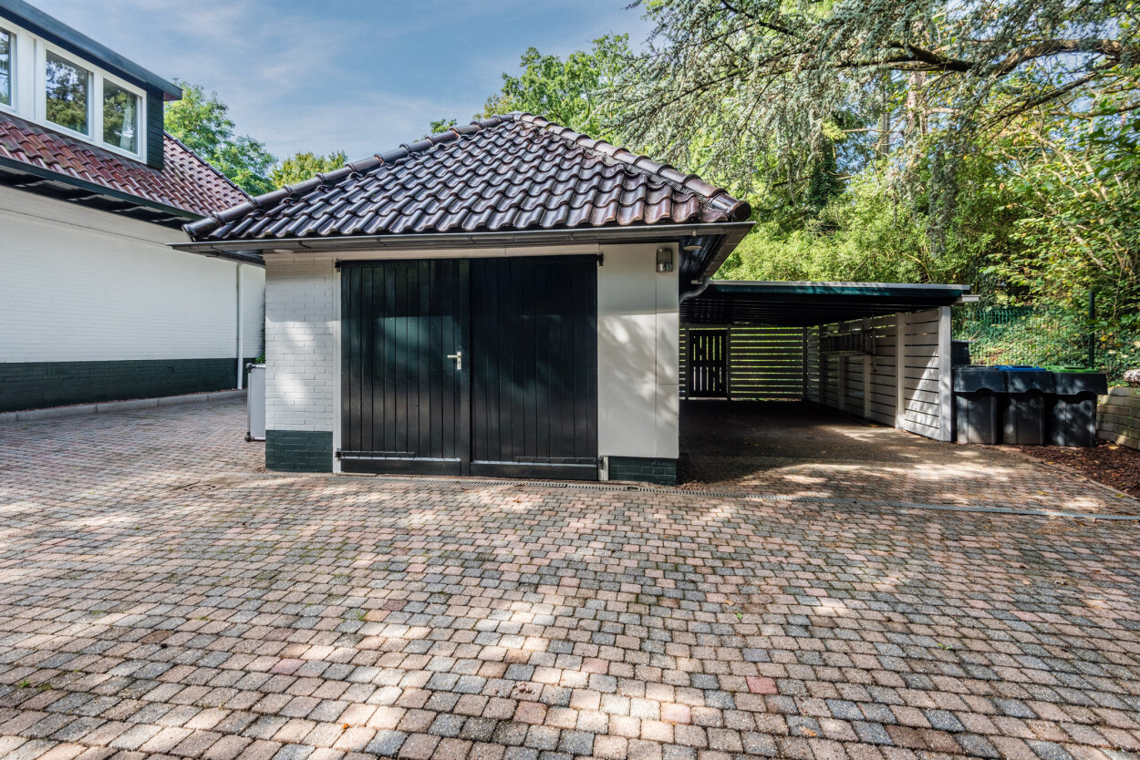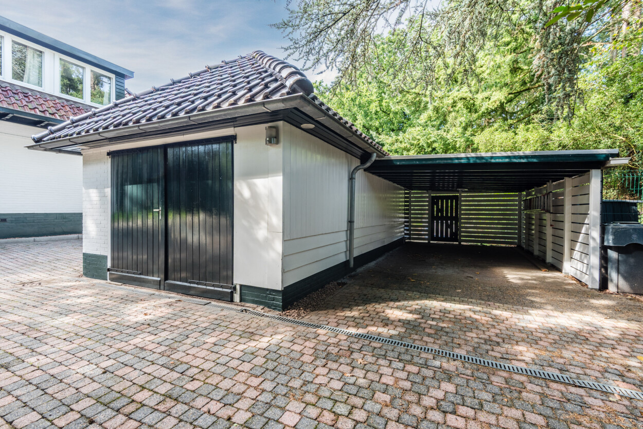 Op het perceel staat een vrijstaande garage (ca. 35 m²) met vliering, ideaal voor extra opslag of het inrichten van een werk-/hobbyruimte. Aangrenzend bevindt zich een carport in dezelfde stijl als de woning, zodat de auto altijd beschut geparkeerd staat. De royale oprit biedt daarnaast volop ruimte voor meerdere auto’s.