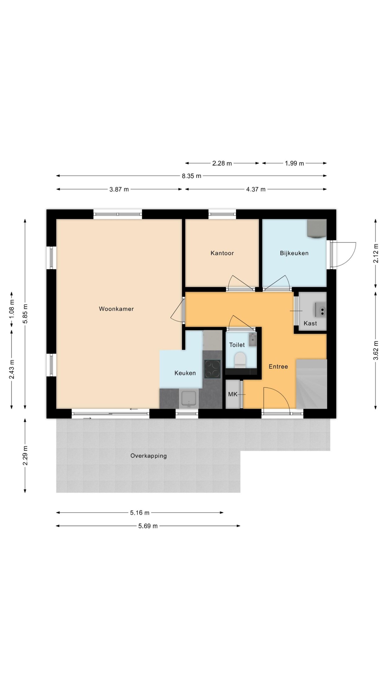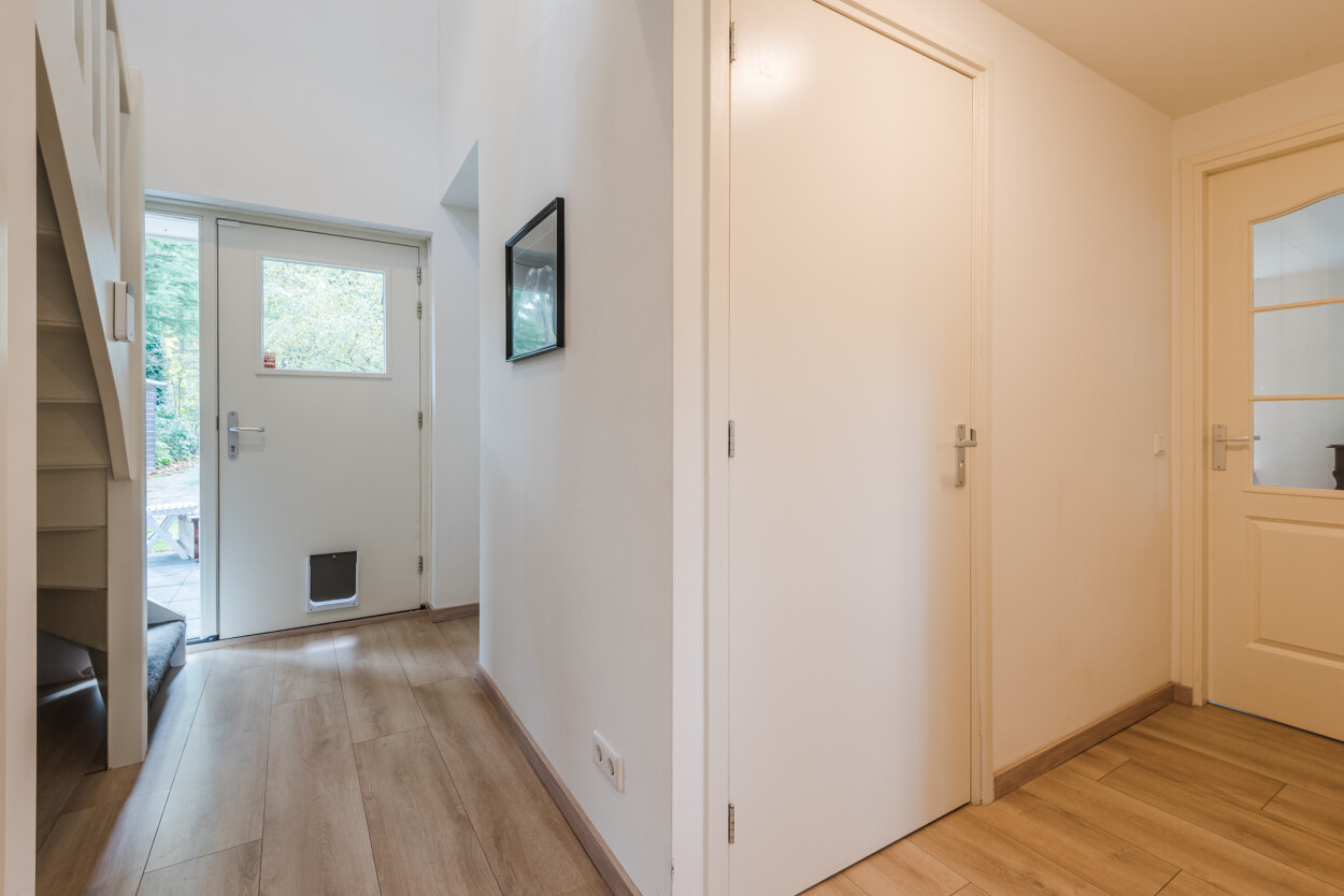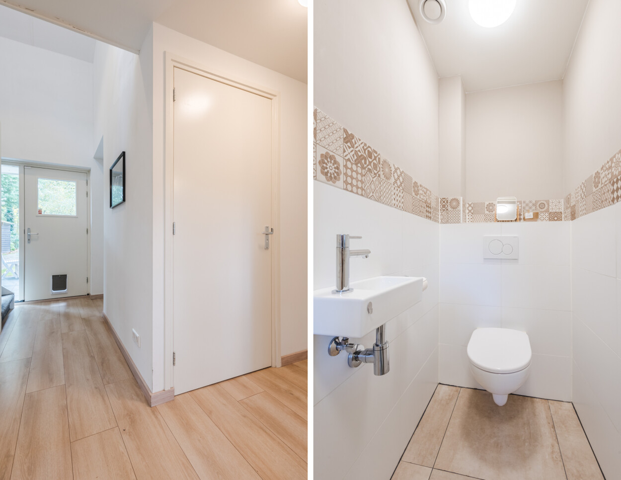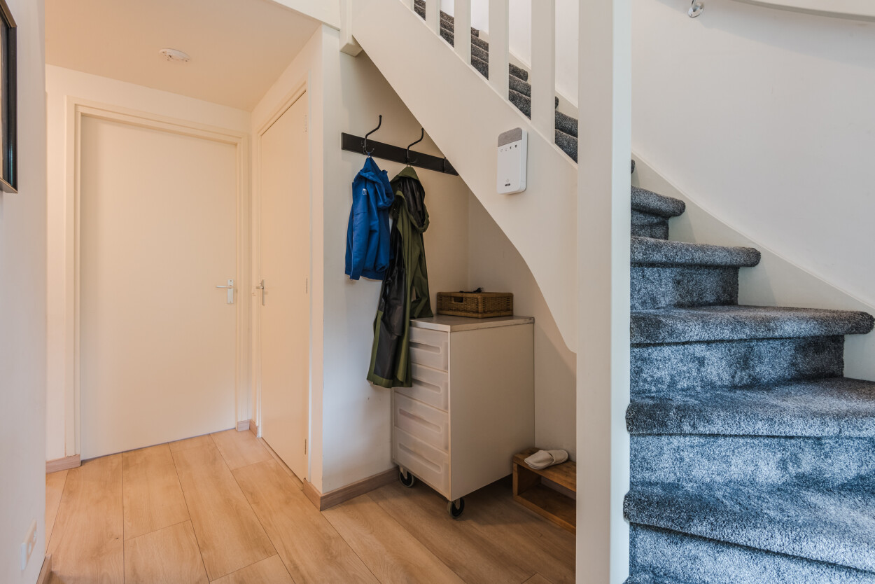 Bij binnenkomst in de hal valt direct de nette afwerking op. Vanuit de hal is er toegang tot de meterkast, garderobe en een technische kast met cv-installatie en verdeler van de vloerverwarming. Daarnaast leidt de hal naar het moderne toilet met fonteintje, de bijkeuken met achterom en aansluitingen voor wasmachine en droger, een kantoor annex kinder-(slaap)kamer, en de woonkamer en keuken.