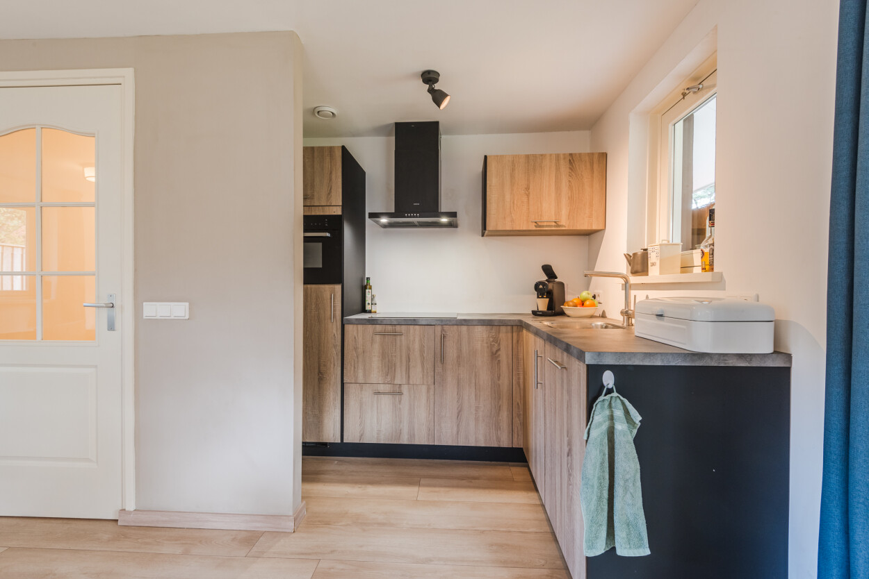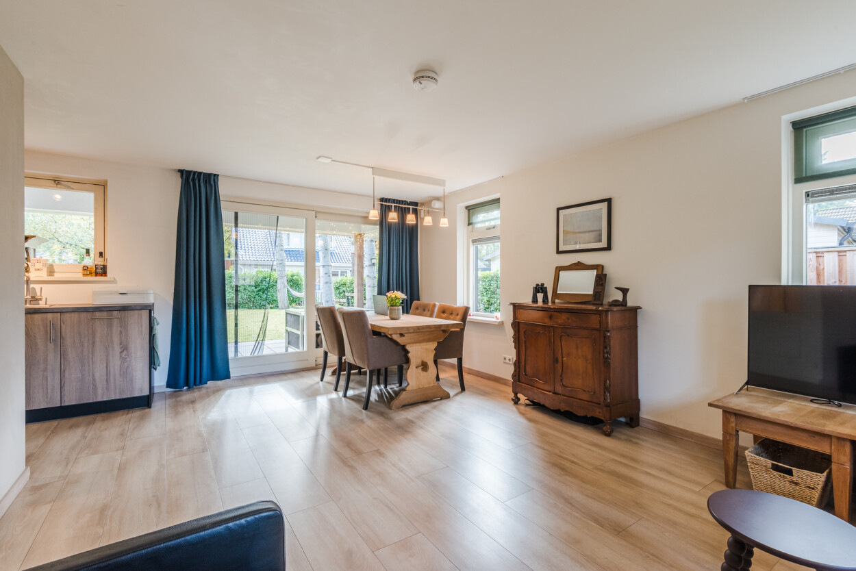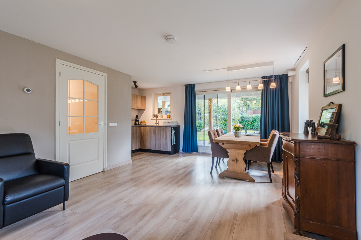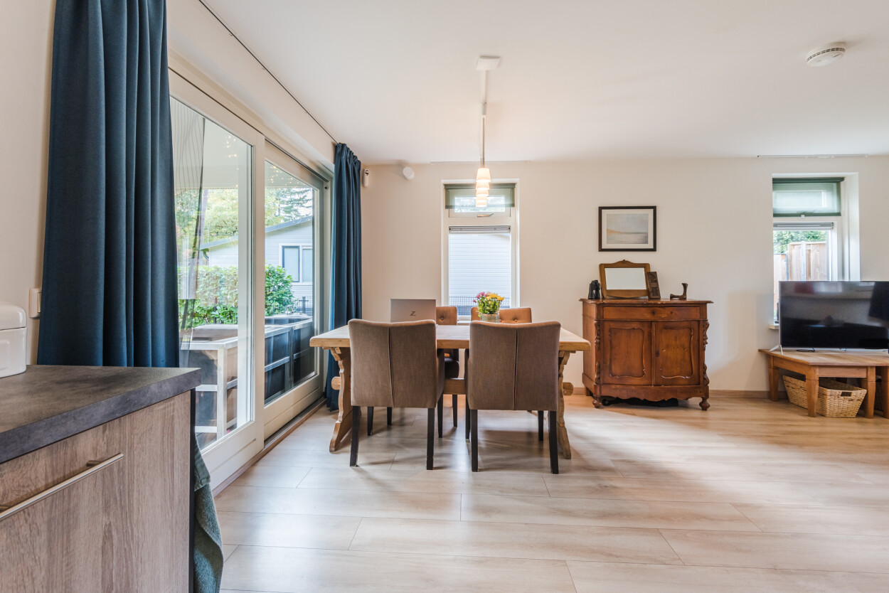 De woonkamer is heerlijk licht dankzij het doorzonconcept. De L-vormige keuken is voorzien van diverse inbouwapparatuur, waaronder een inductiekookplaat met afzuigkap, combi-oven/magnetron, vaatwasser en koelkast. Vanuit de keuken leidt een schuifpui naar de overkapping/veranda aan de voorzijde, die dankzij een overstek van het dak het wooncomfort moeiteloos naar buiten verlengt. De indeling van de woonkamer is praktisch en sfeervol: aan de achterzijde is een gezellige zithoek gerealiseerd, terwijl aan de voorzijde ruimte is voor een royale eettafel.