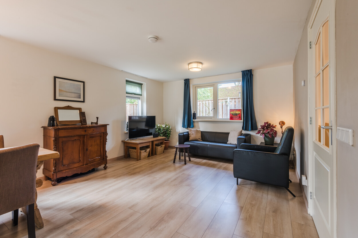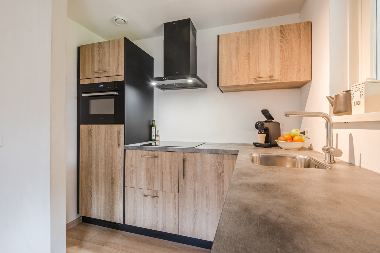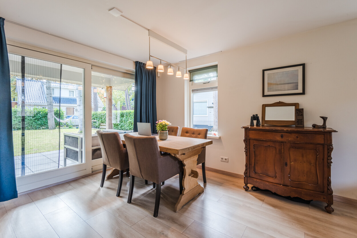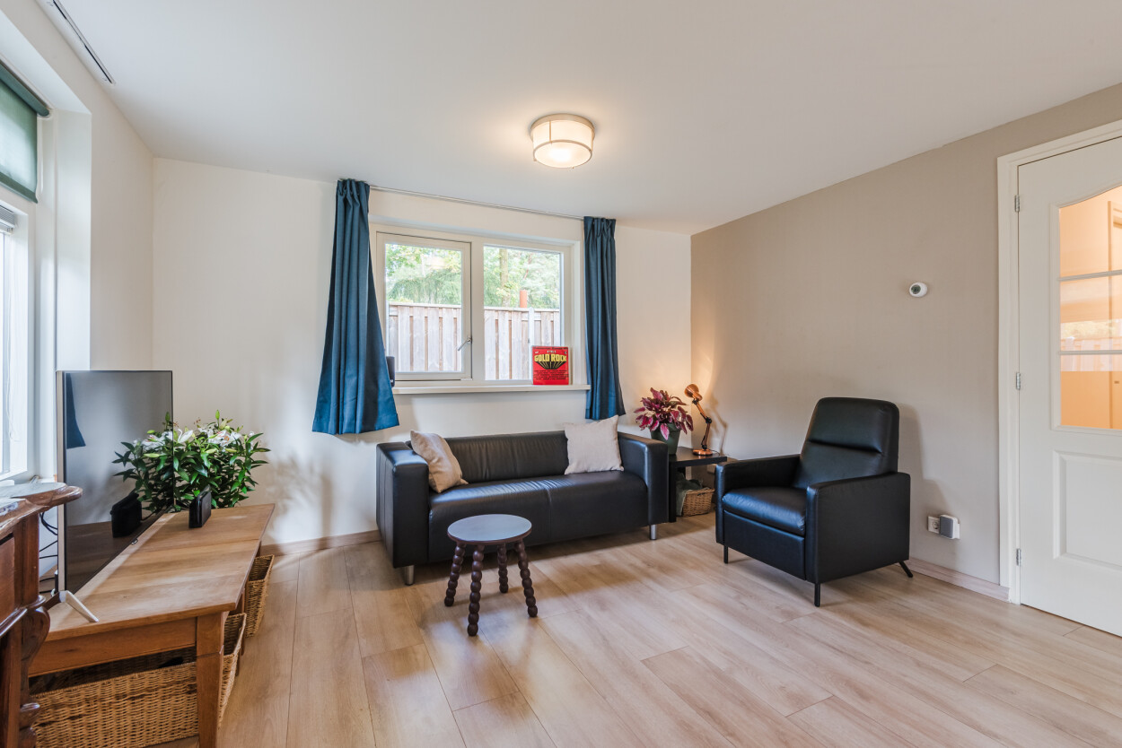 De woonkamer is heerlijk licht dankzij het doorzonconcept. De L-vormige keuken is voorzien van diverse inbouwapparatuur, waaronder een inductiekookplaat met afzuigkap, combi-oven/magnetron, vaatwasser en koelkast. Vanuit de keuken leidt een schuifpui naar de overkapping/veranda aan de voorzijde, die dankzij een overstek van het dak het wooncomfort moeiteloos naar buiten verlengt. De indeling van de woonkamer is praktisch en sfeervol: aan de achterzijde is een gezellige zithoek gerealiseerd, terwijl aan de voorzijde ruimte is voor een royale eettafel.