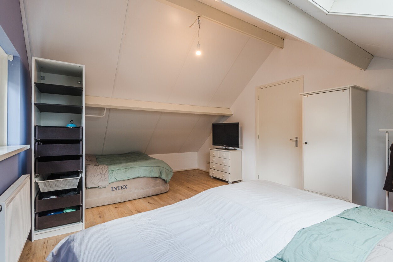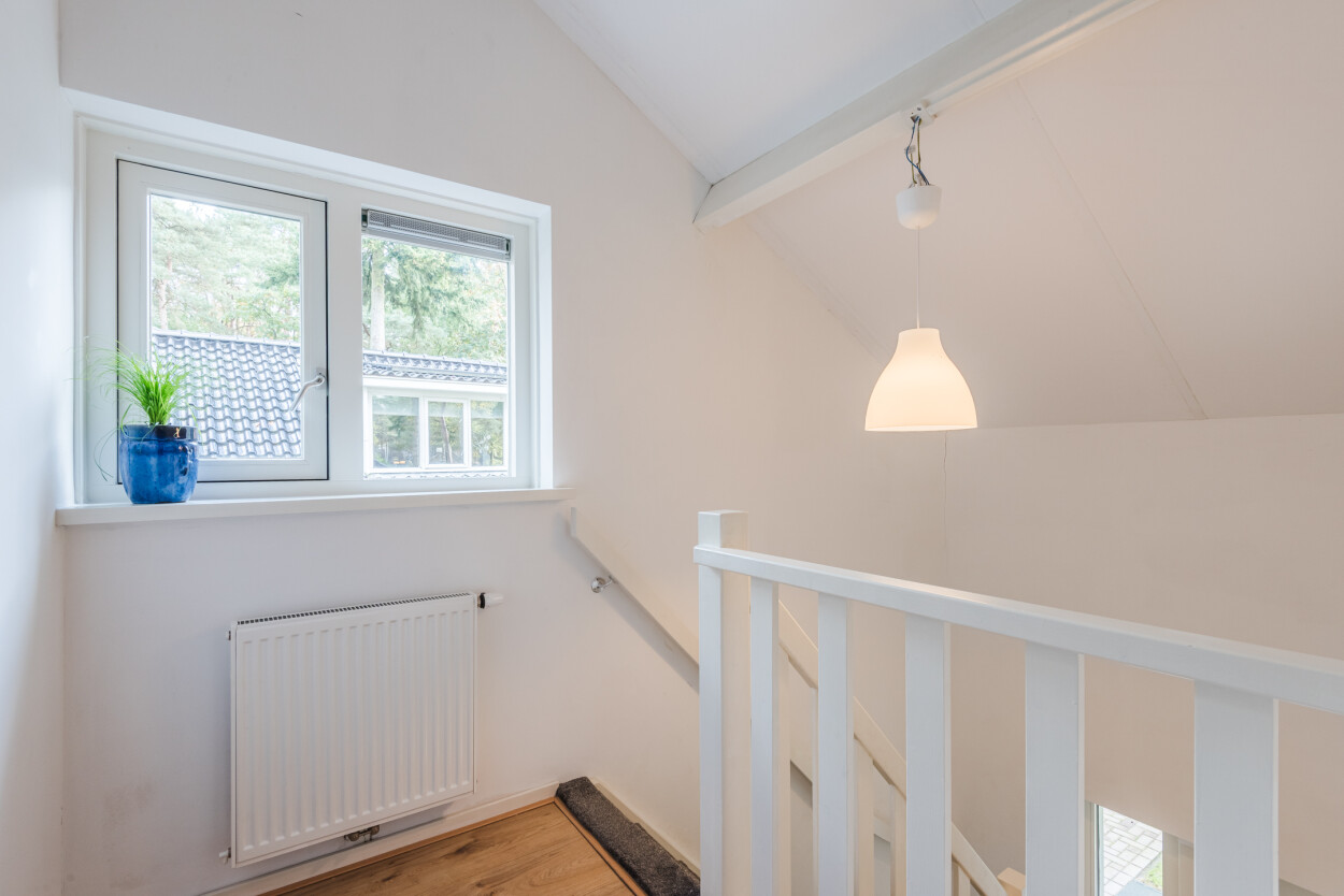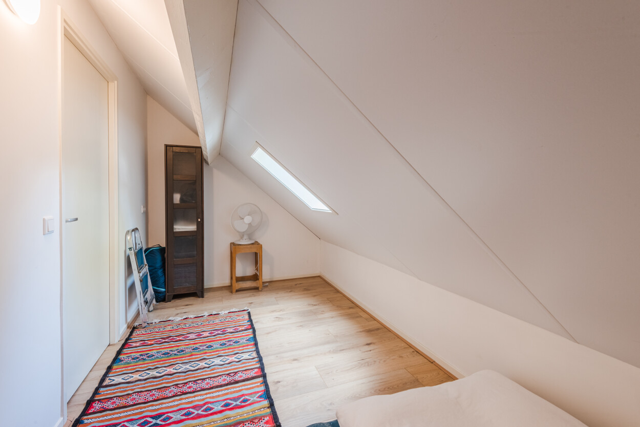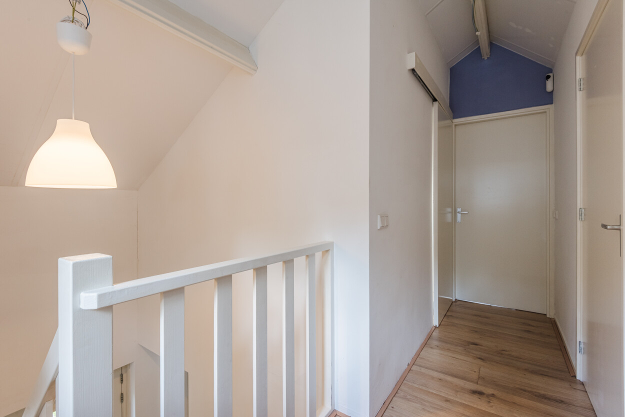Via de trap in de entree bereikt u de overloop van de eerste verdieping, die toegang biedt tot twee slaapkamers en de badkamer. Het lichtinval, de balustrade/vide en de vele raampartijen zorgen voor een open en prettige sfeer. Aan de achterzijde bevindt zich een slaapkamer met dakraam. De gehele verdieping is keurig afgewerkt met strak gestuukte wanden en een nette doorgelegde vloer, wat bijdraagt aan een moderne en verzorgde uitstraling. De moderne badkamer is voorzien van een inloopdouche, wastafelmeubel en toilet. De ouderslaapkamer heeft een oppervlakte van ca. 17 m². Indien gewenst kan hier eenvoudig een extra slaapkamer gerealiseerd worden door een wand aan te brengen; aan de voorzijde zorgt een groot dakraam voor veel daglicht.