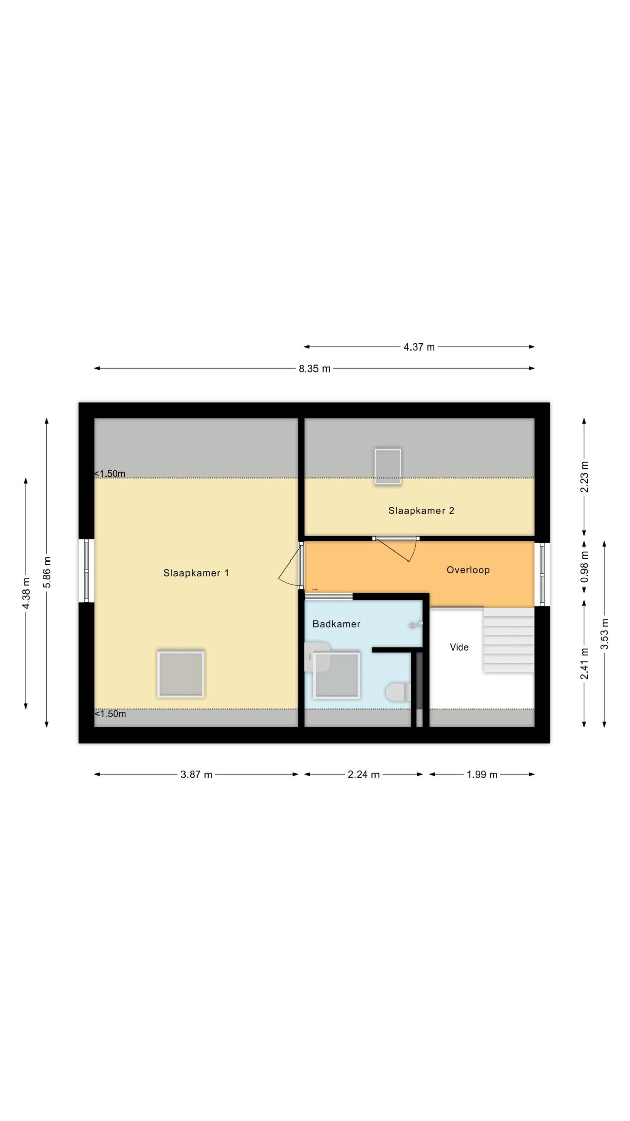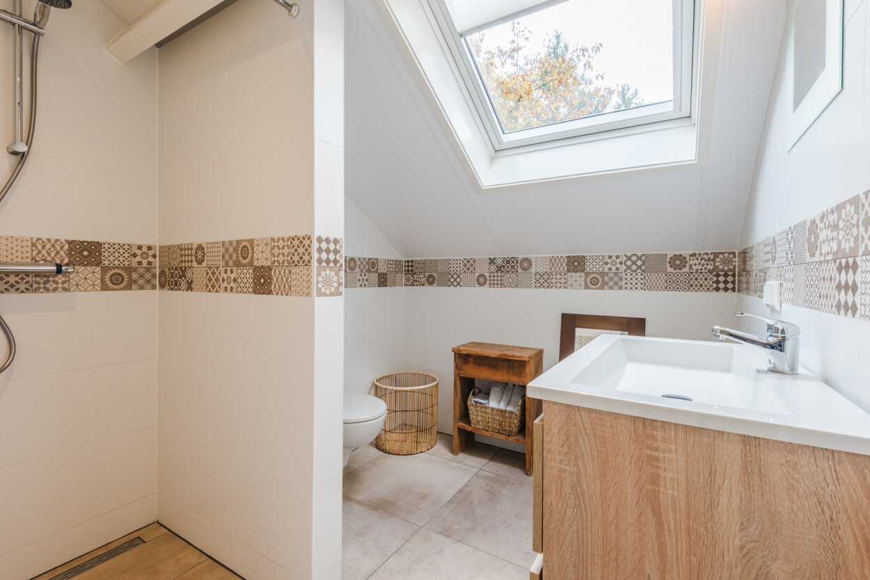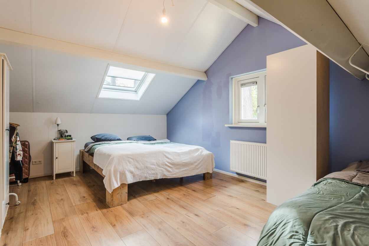 Via de trap in de entree bereikt u de overloop van de eerste verdieping, die toegang biedt tot twee slaapkamers en de badkamer. Het lichtinval, de balustrade/vide en de vele raampartijen zorgen voor een open en prettige sfeer. Aan de achterzijde bevindt zich een slaapkamer met dakraam. De gehele verdieping is keurig afgewerkt met strak gestuukte wanden en een nette doorgelegde vloer, wat bijdraagt aan een moderne en verzorgde uitstraling. De moderne badkamer is voorzien van een inloopdouche, wastafelmeubel en toilet. De ouderslaapkamer heeft een oppervlakte van ca. 17 m². Indien gewenst kan hier eenvoudig een extra slaapkamer gerealiseerd worden door een wand aan te brengen; aan de voorzijde zorgt een groot dakraam voor veel daglicht.