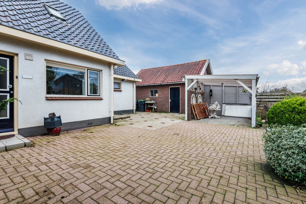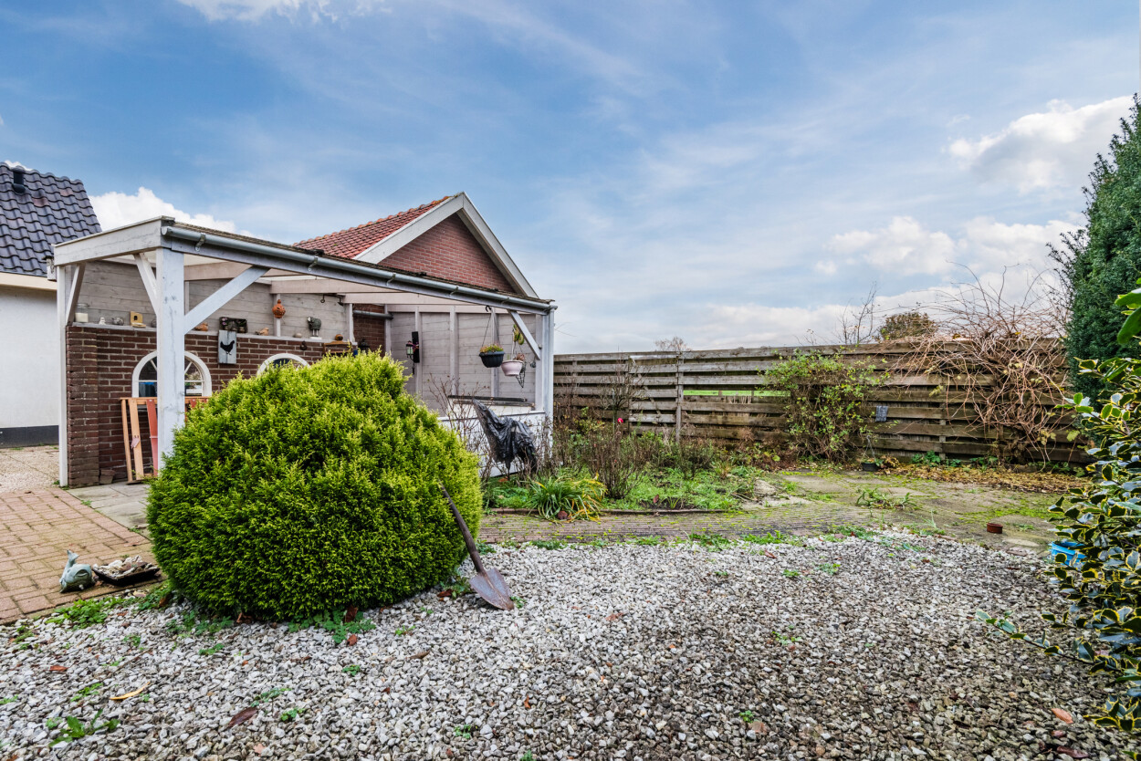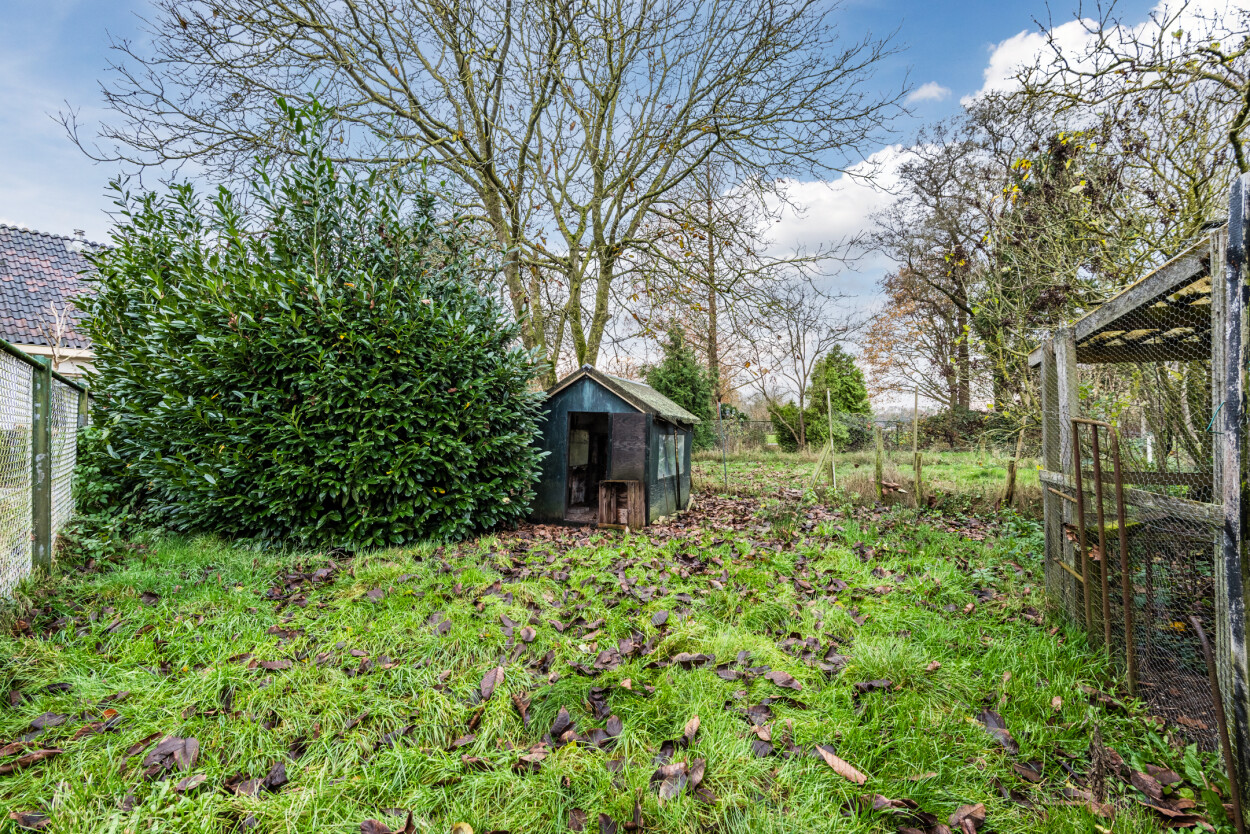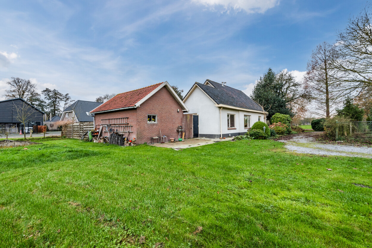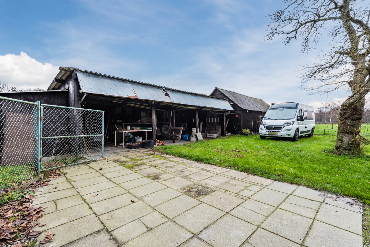 Rondom de woning ligt een verzorgde tuin. Aan de linkerzijde bevindt zich een weide waar eerder kleine hobbydieren hebben gelopen, en aan de achterzijde ligt een weiland, ideaal voor hobbydieren zoals schapen, geiten of een klein paardenverblijf. Het perceel beschikt daarnaast over een vrijstaande garage en diverse overige opstallen, perfect te gebruiken als opslagruimte, hobbyruimte of extra stalling.