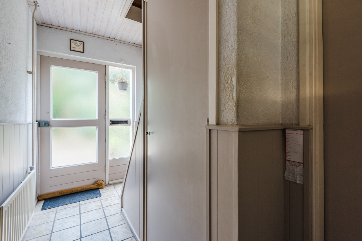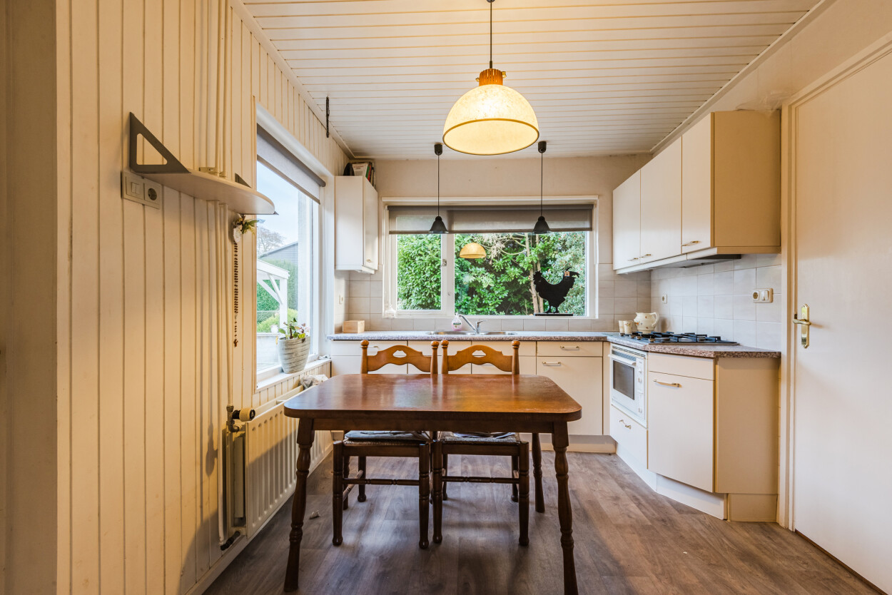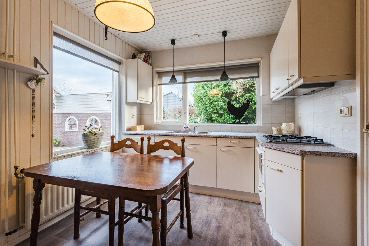 Via de entree/hal met meterkast en trapopgang naar de eerste verdieping bereikt u de centrale keuken, die zowel vanuit de hal als de L-vormige woonkamer toegankelijk is. Onder de trap bevindt zich een praktische provisiekelder. De keuken is uitgerust met een kookplaat, spoelbak en biedt voldoende werkruimte. Aangrenzend vindt u de bijkeuken, badkamer en toilet. De badkamer en het toilet zijn netjes onderhouden. In de bijkeuken bevinden zich de CV-installatie en de aansluitingen voor wasmachine en droger. Vanuit de bijkeuken is er tevens een loopdeur die als achteringang functioneert.