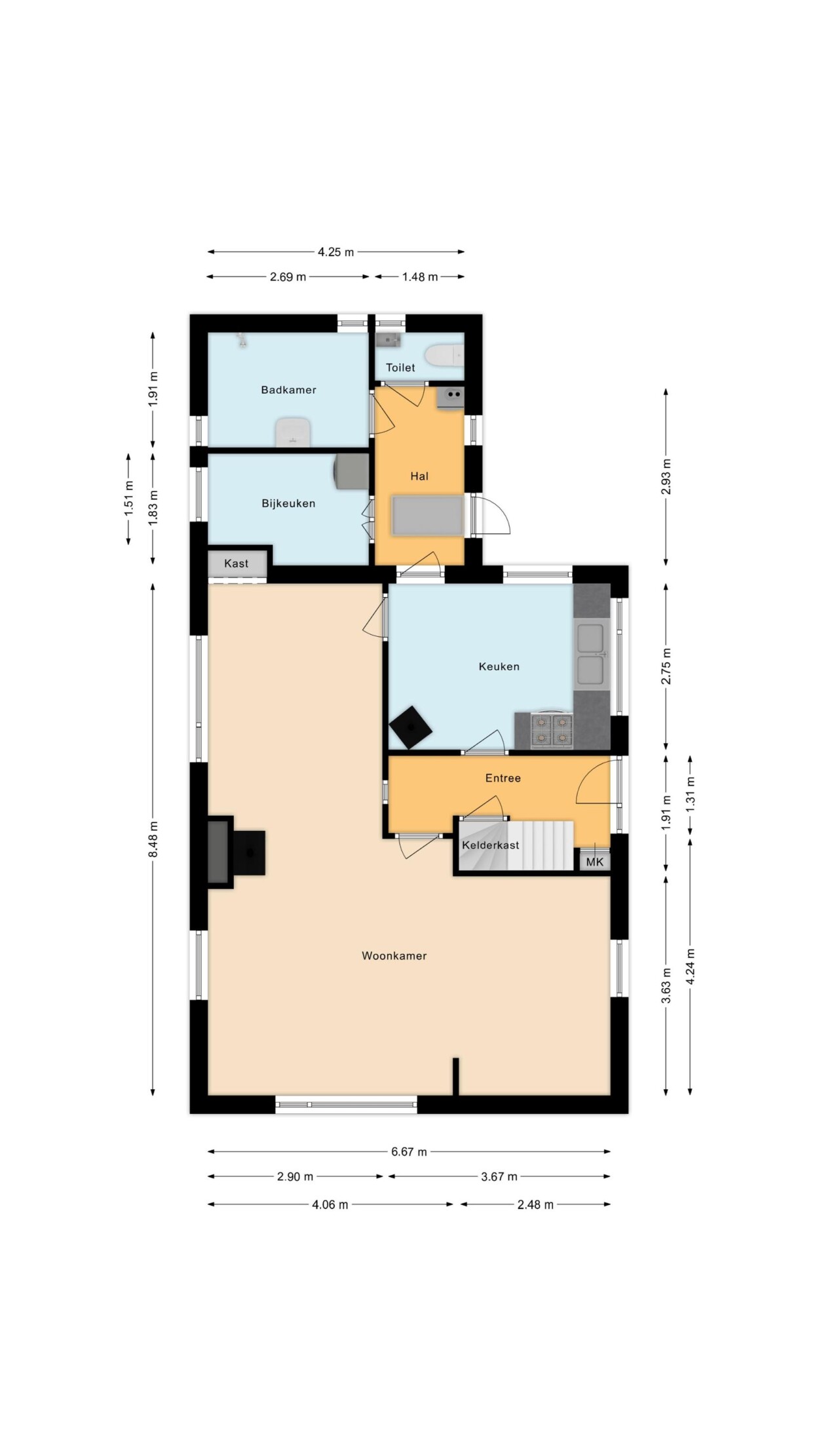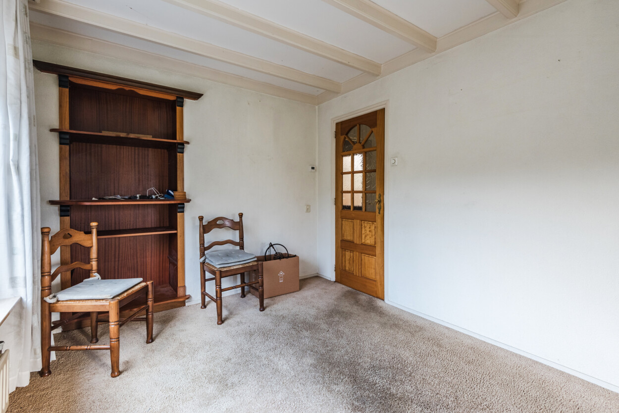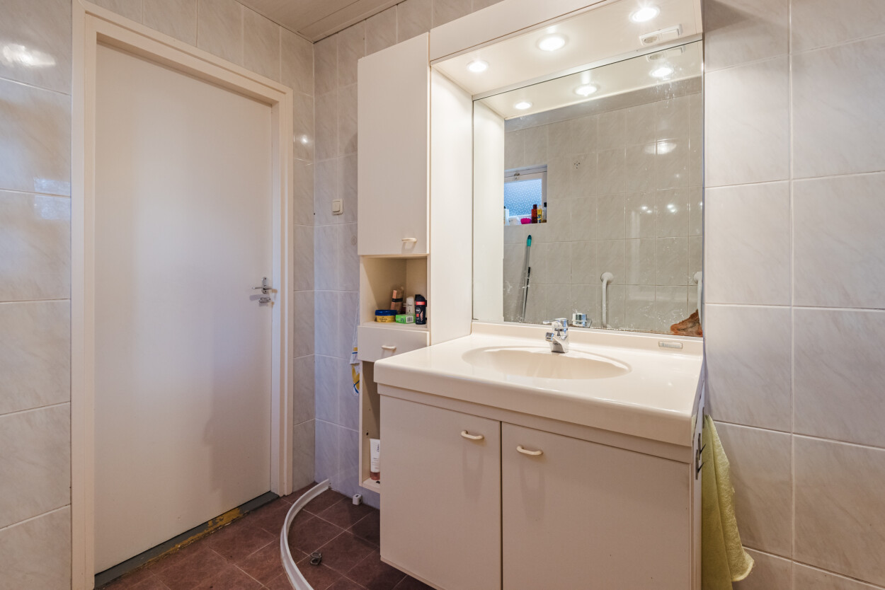 Via de entree/hal met meterkast en trapopgang naar de eerste verdieping bereikt u de centrale keuken, die zowel vanuit de hal als de L-vormige woonkamer toegankelijk is. Onder de trap bevindt zich een praktische provisiekelder. De keuken is uitgerust met een kookplaat, spoelbak en biedt voldoende werkruimte. Aangrenzend vindt u de bijkeuken, badkamer en toilet. De badkamer en het toilet zijn netjes onderhouden. In de bijkeuken bevinden zich de CV-installatie en de aansluitingen voor wasmachine en droger. Vanuit de bijkeuken is er tevens een loopdeur die als achteringang functioneert.