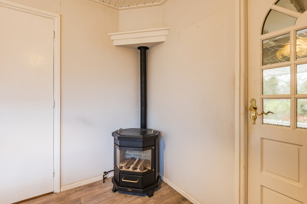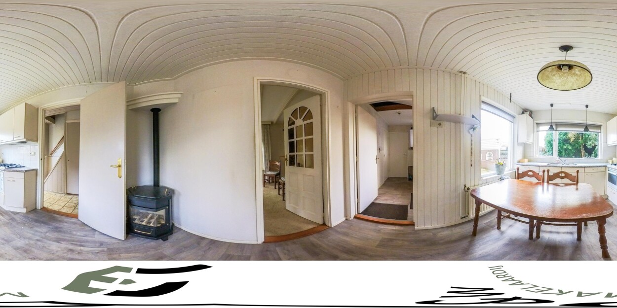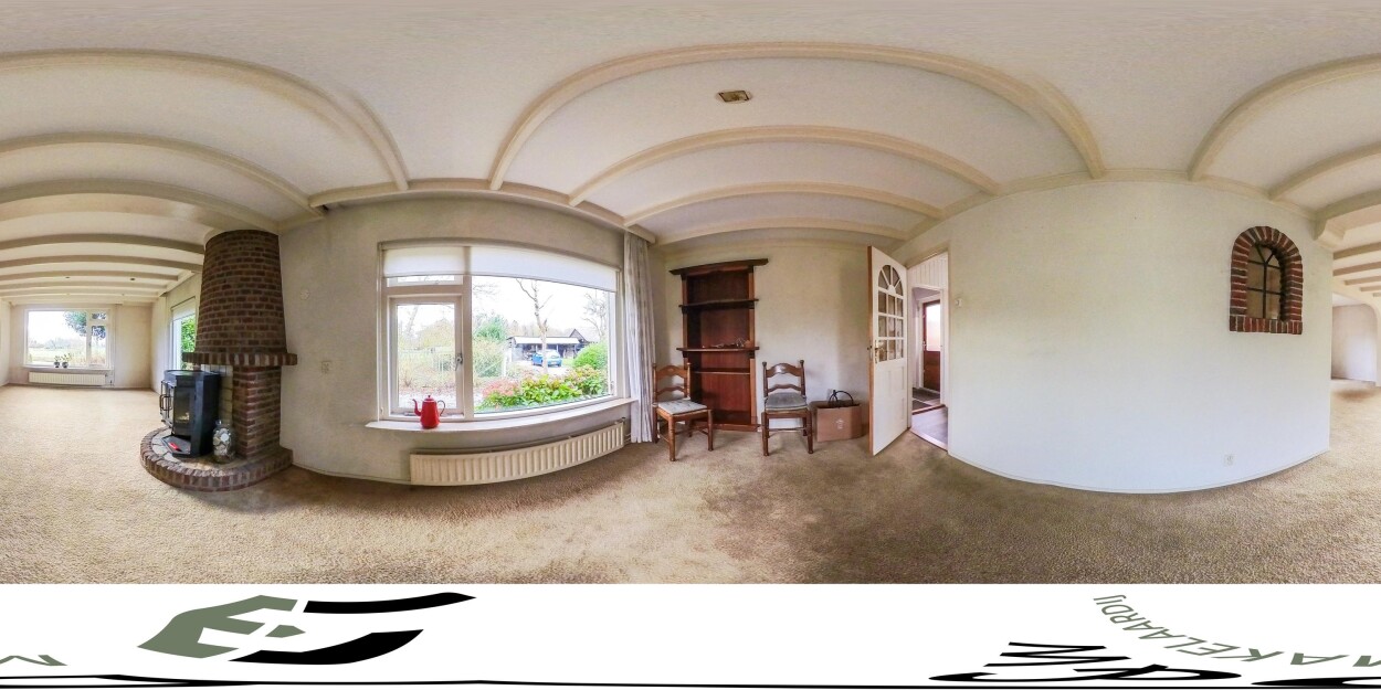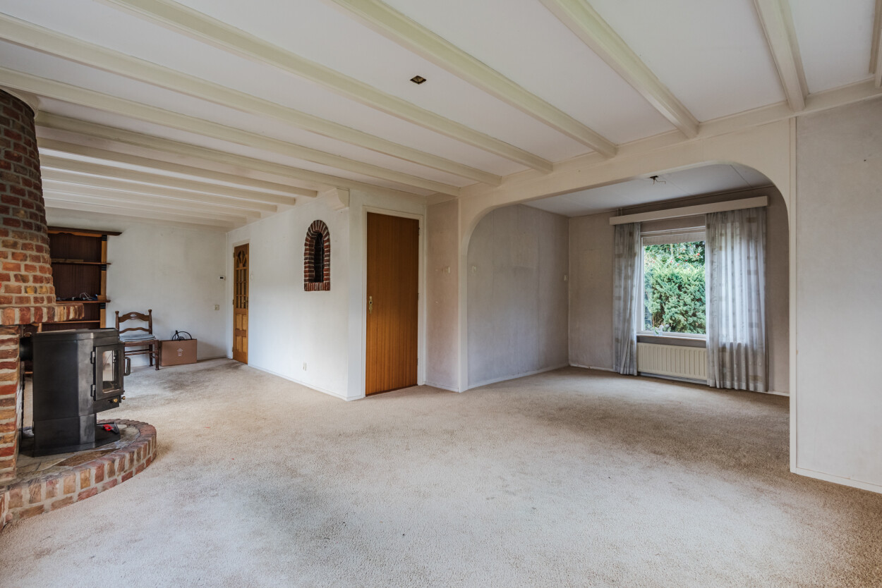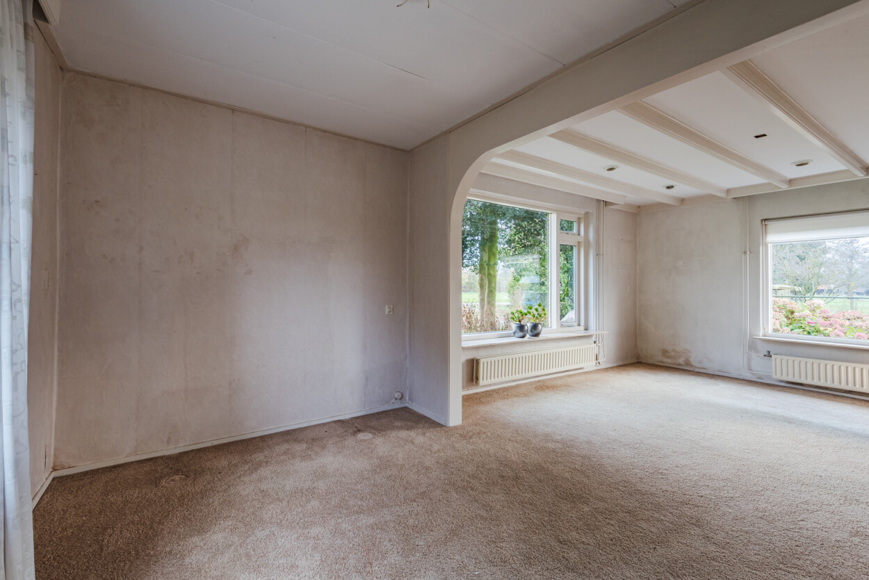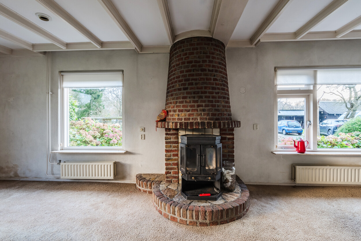De L-vormige woonkamer ligt aan de voorzijde van de woning en biedt een prachtig weids uitzicht over de landerijen. Dankzij de royale afmetingen en de aanwezige haard is er zowel ruimte voor een gezellige zithoek als een ruime eethoek.